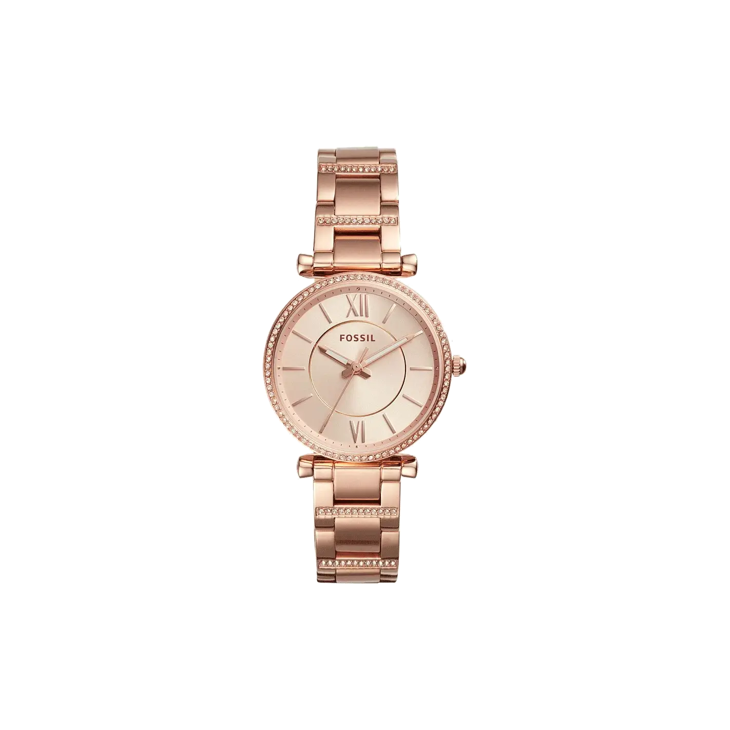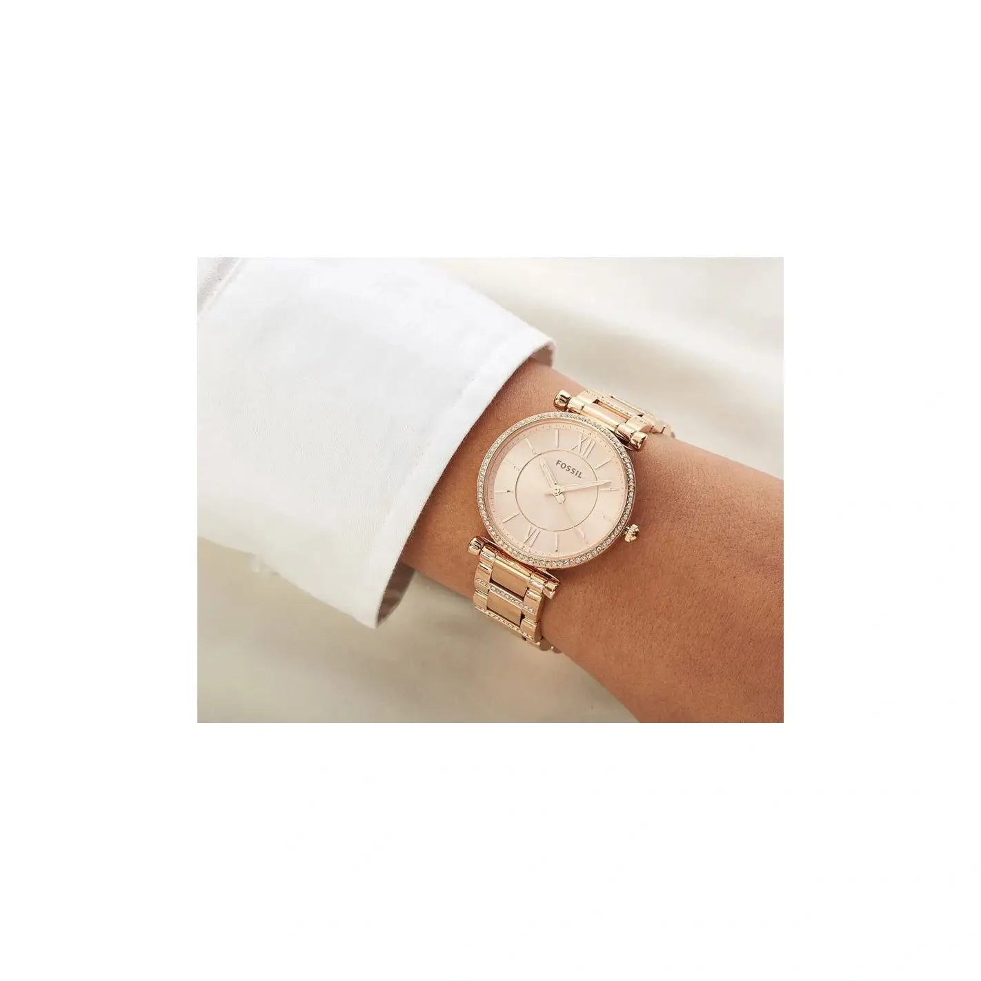 This sure is an everlasting piece for women by Fossil. This fun, feminine Carlie watch shines with a crystal topring, rose gold-tone case and three-link bracelet. A brushed rose gold dial with beveled index ring adds a sleek finishing touch. This watch has rose-gold dash marking at every hour except at...