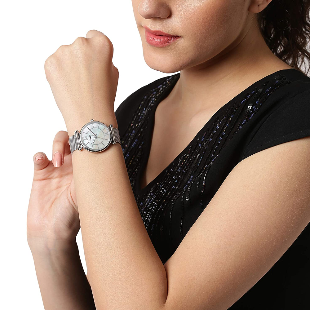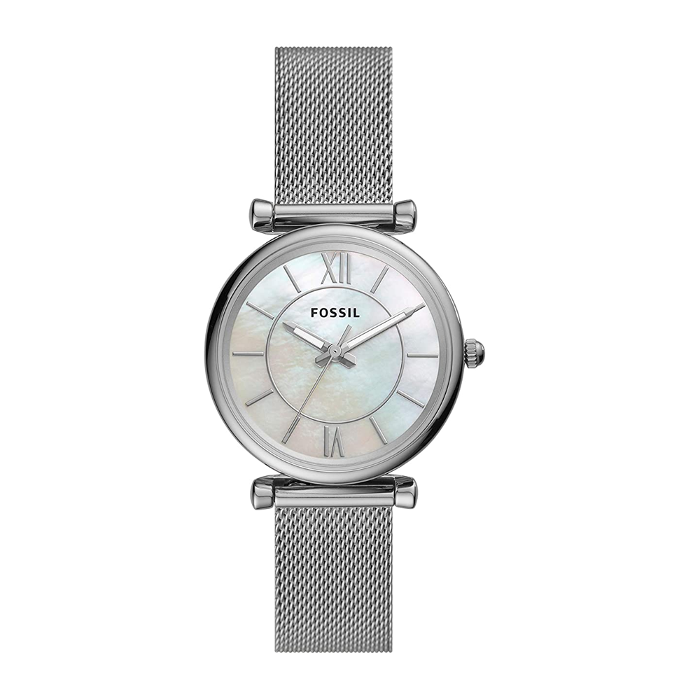 Bring a new dimension to your wrist with this women's analog watch from the Carlie collection by Fossil. Encased in a 34 mm case, the mother of pearl round dial is secured by a mineral glass. It exudes plain three hands and a crown for time adjustment. The stainless steel...