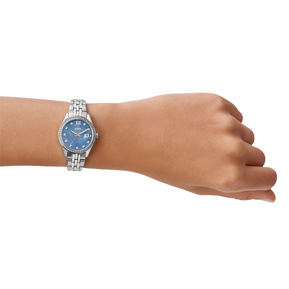 A mother of pearl dial reminiscent of the unfathomed endless sea, this 28 mm Scarlette Micro watch from the house of Fossil is designed for the woman of purpose with an incredible sense of style. Boasting a blue mother-of-pearl dial, three-hand date functionality and silver toned stainless steel bracelet, this...