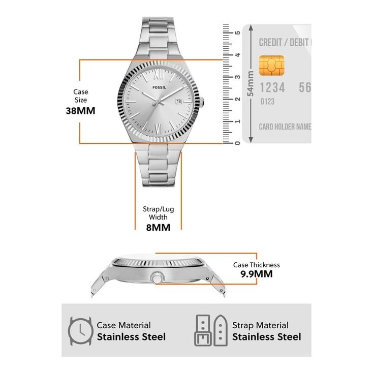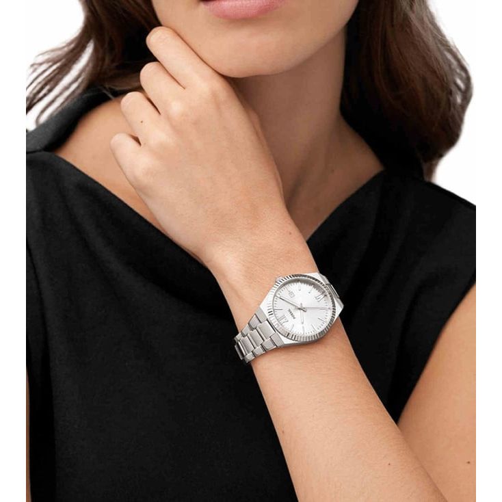 This 38mm Scarlette features a silver sunray dial, three-hand date movement and stainless steel bracelet. A perfect fusion of style and functionality, this women's analog watch from FOSSIL is sure to make a style statement. The silver round dial is protected by a mineral glass. The stainless steel strap comes...