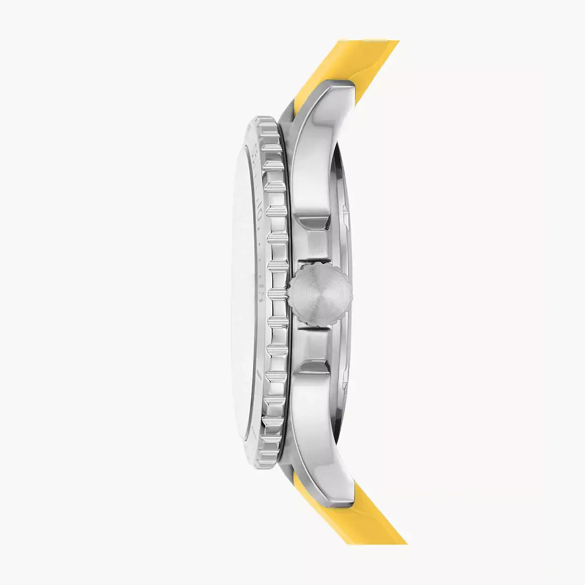 Take the plunge into colour with our classic, dive-inspired FB-01 watch. It features a yellow silicone strap, a silver topring, crystal indices and a light-reflecting yellow sunray watch face. Ready for the season? Yes. A total statement maker? Well, obviously.
