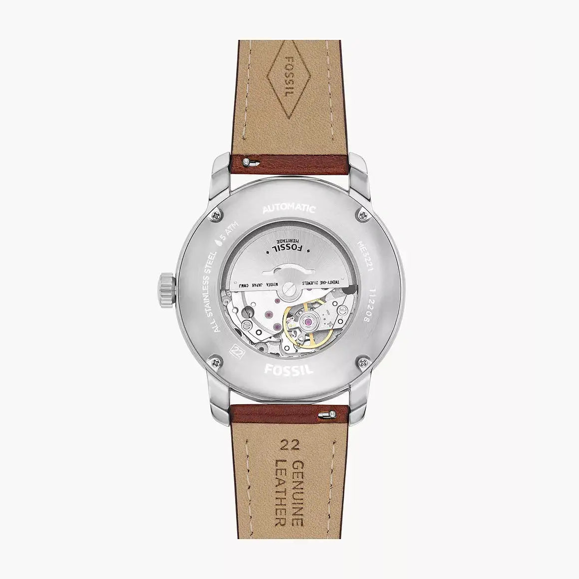 This 43mm Fossil Heritage watch features a cream matte dial, automatic movement and brown LiteHide™ leather strap.