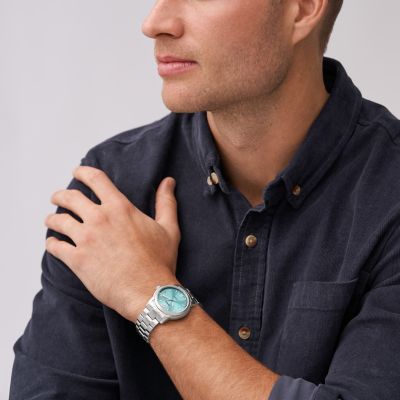 This 38mm Fossil Heritage features a blue sunray dial, automatic movement and stainless steel bracelet.