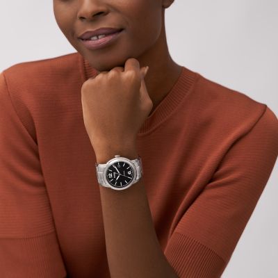 This 43mm Fossil Heritage watch features a black matte dial, automatic movement and stainless steel bracelet.