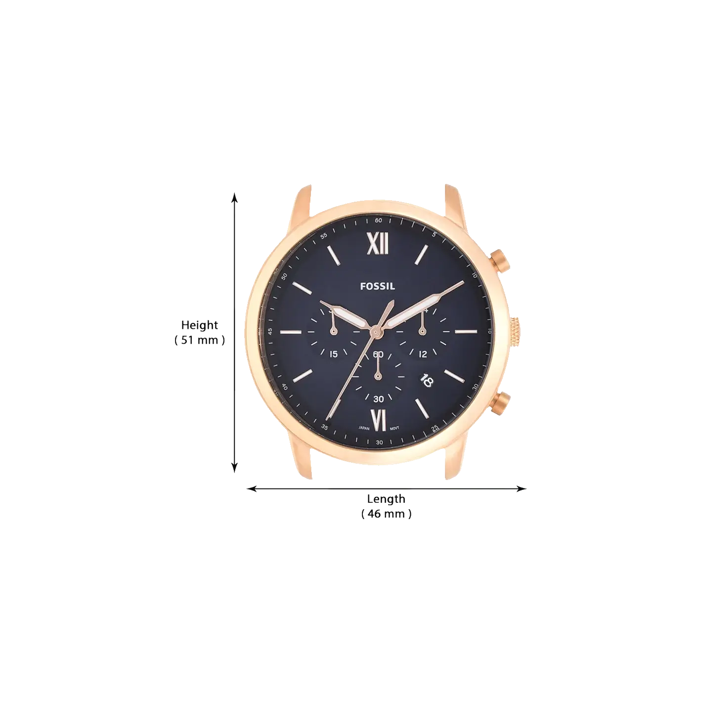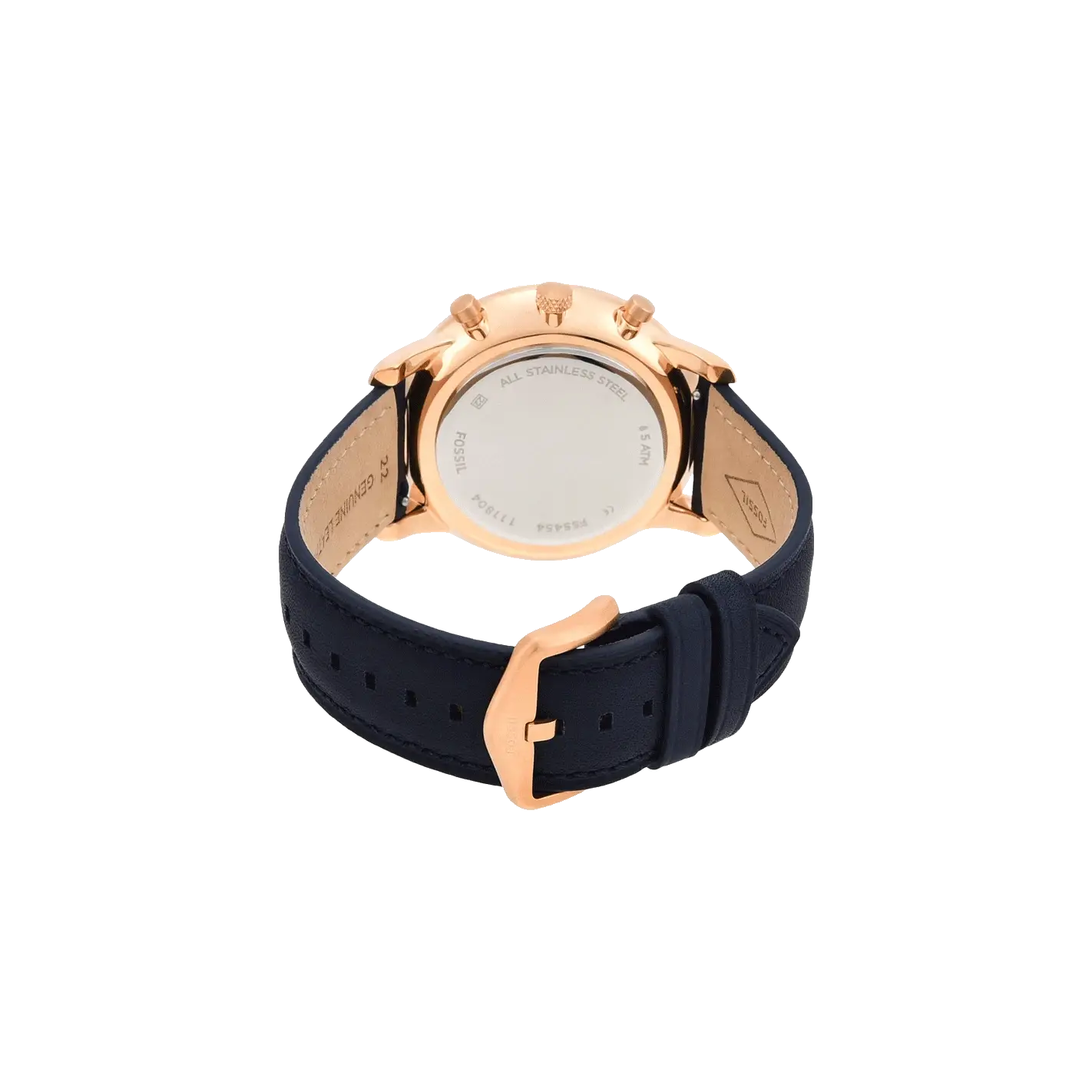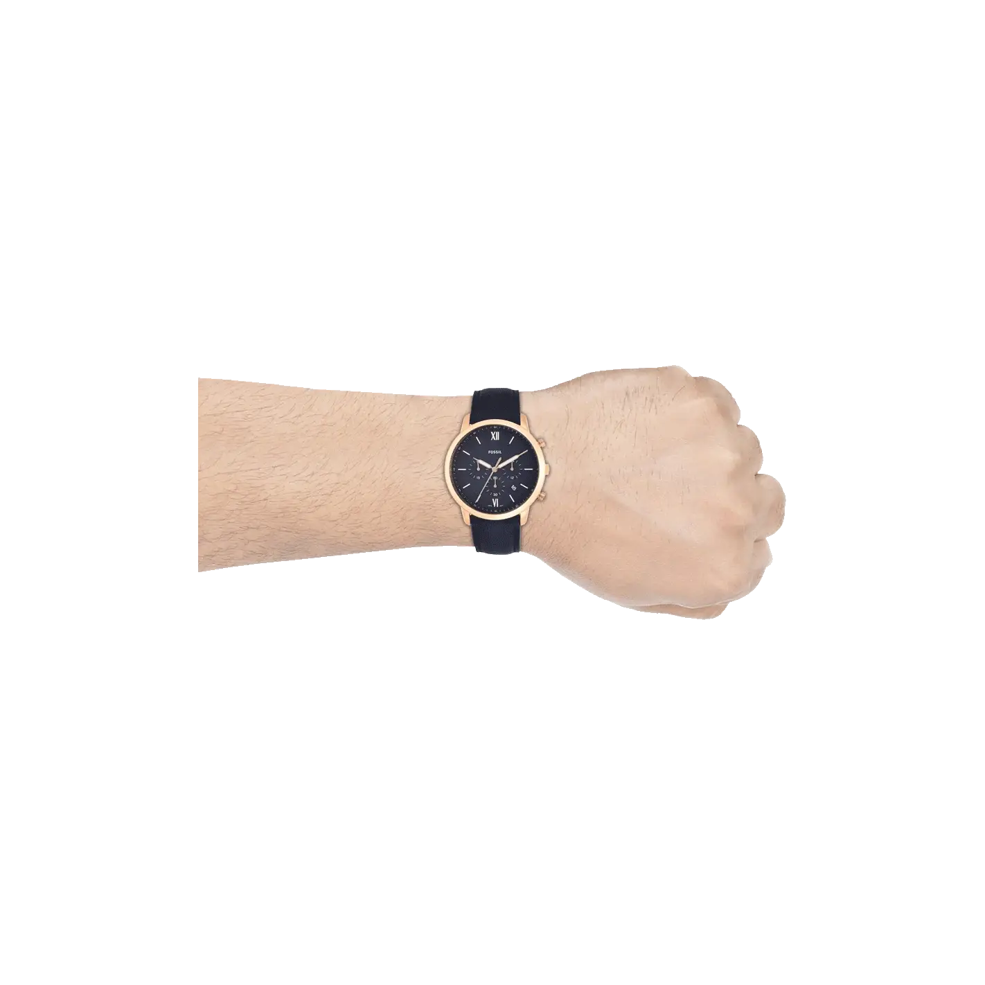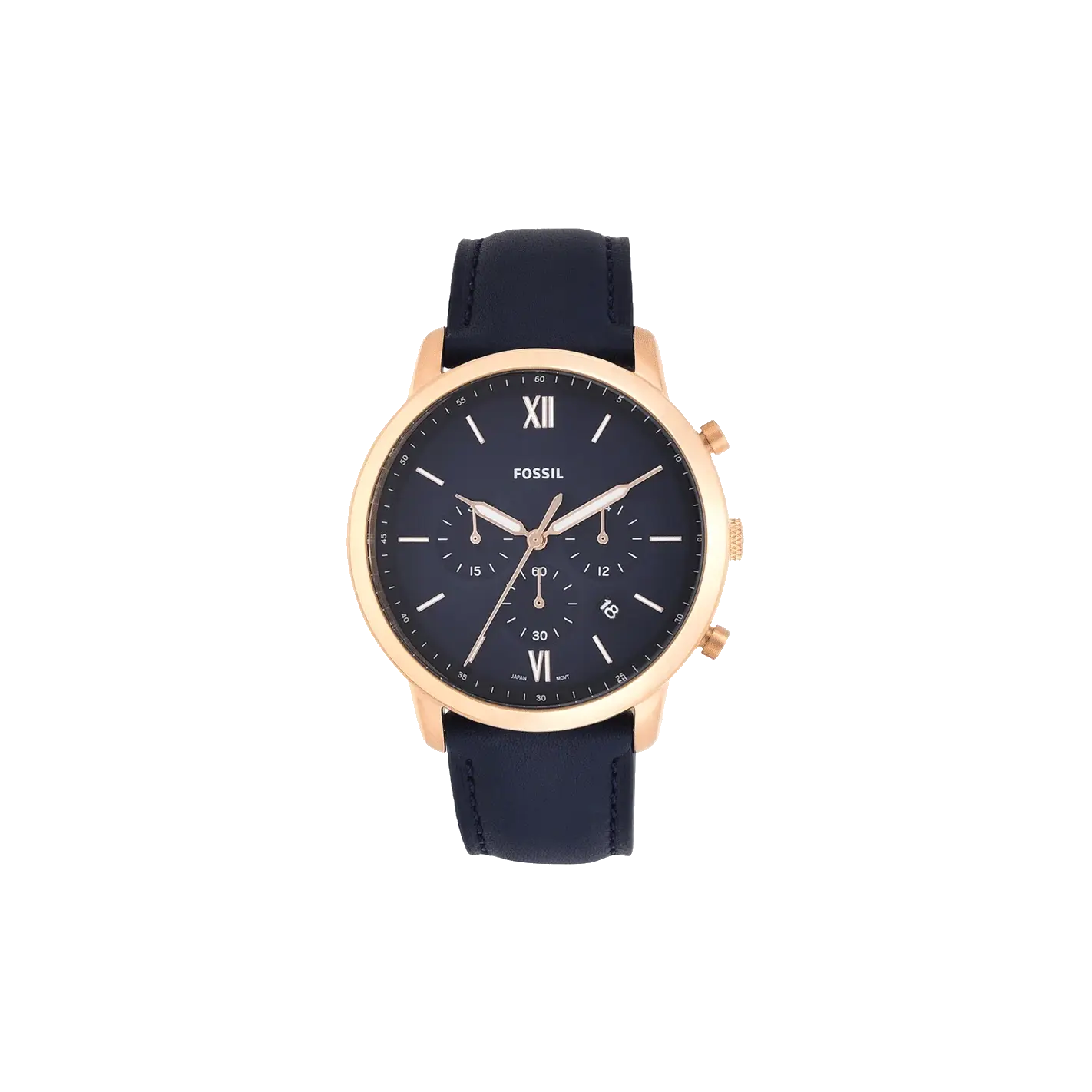 A perfect mix of traditional and modern, this Neutra men's chronograph watch by Fossil makes for a perfect choice to wear to any formal event. The blue leather strap, secured with a single prong strap buckle and the rose-gold round stainless steel case complement and contrast skillfully with the navy...