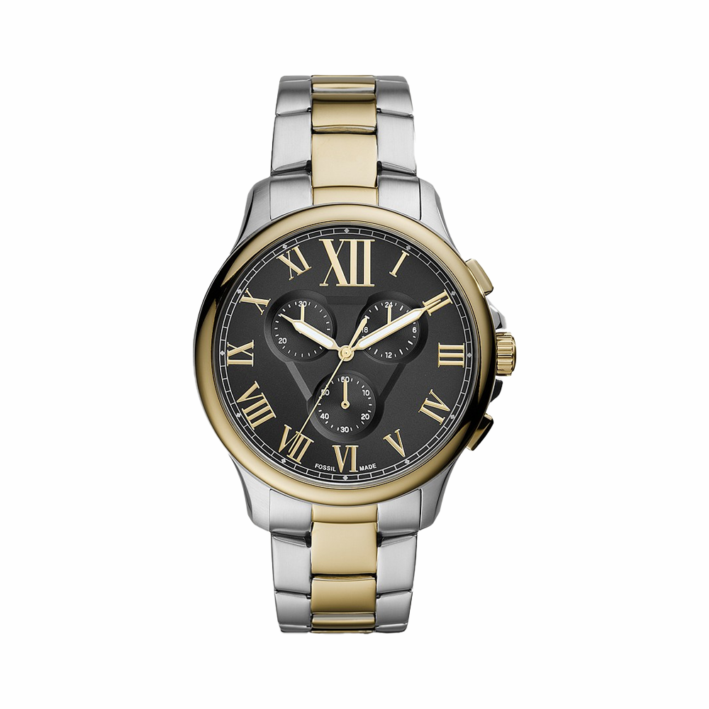 Showcasing a fusion of style and functionality, this men's analog watch from the Monty collection by Fossil is a great pick. Protected by a mineral glass, the black round dial is housed in a 44 mm case. It vaunts Roman numeral hour markings and a crown for time adjustment. The...