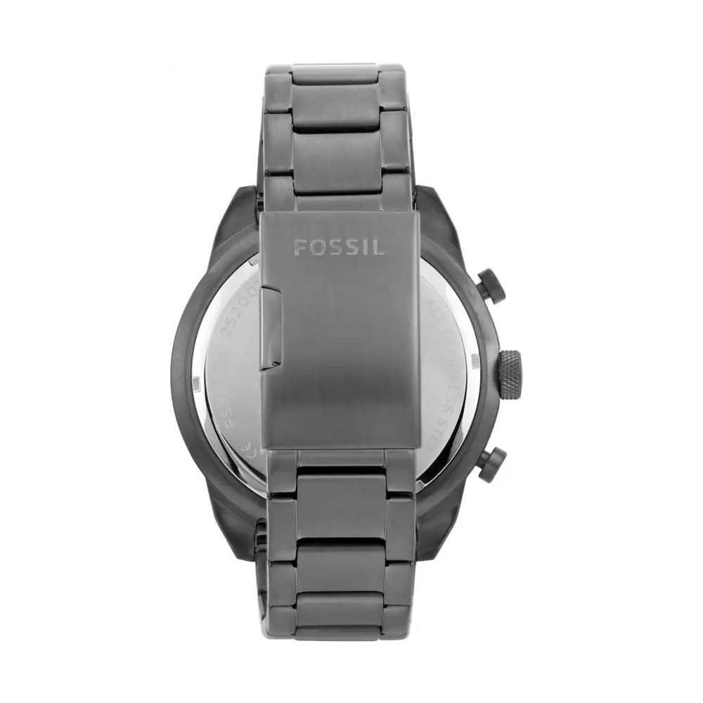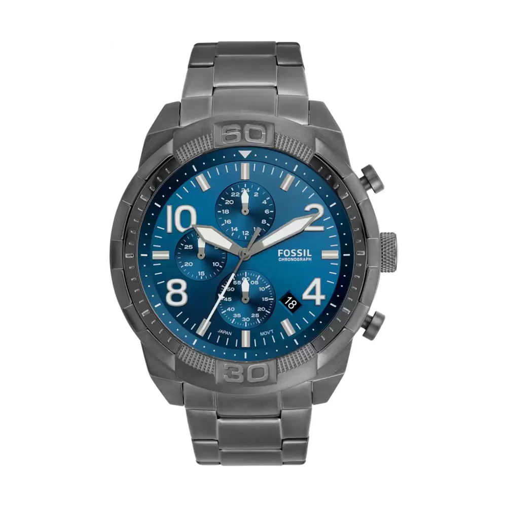 Enhance your style quotient by wearing this men's analog watch from the Bronson collection by Fossil. Its stainless steel strap exudes a steel grey hue that accentuates the look of the watch. Safeguarded by a mineral glass and operated by a quartz movement, the blue round dial is encompassed in a 50 mm case. It showcases stick and numeral hour markings and a crown for time adjustment. Furthermore, it is complemented with a push-button clasp that ensures a secure fit on the wrist.