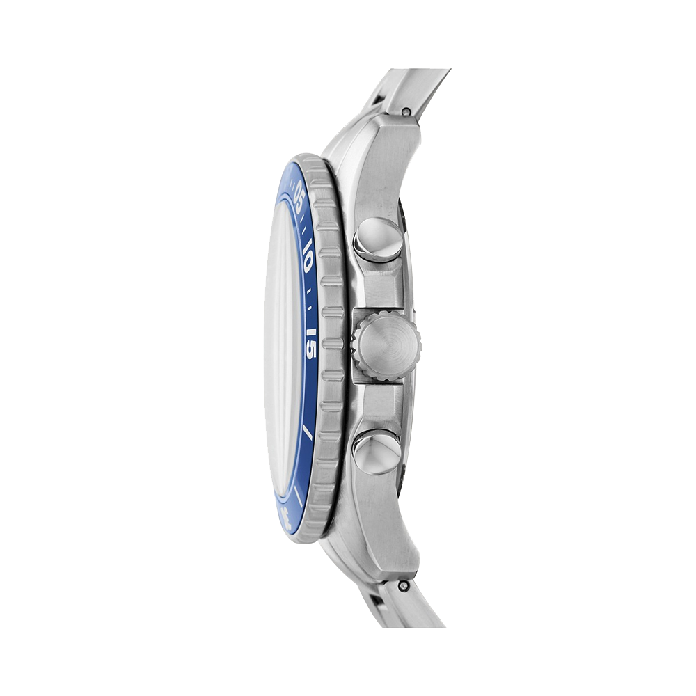 A perfect amalgamation of style and functionality, this men's analog watch from the FB-03 collection by Fossil is a must-have wrist essential. Its stainless steel strap comes in an elegant silver hue that elevates the look of the watch. Safeguarded by a mineral glass and operated by a quartz movement, the blue round dial is encompassed in a 46 mm case. It features stick hour markings and a crown for time adjustment. Furthermore, it is complemented with a push-button clasp that ensures a secure fit on the wrist.