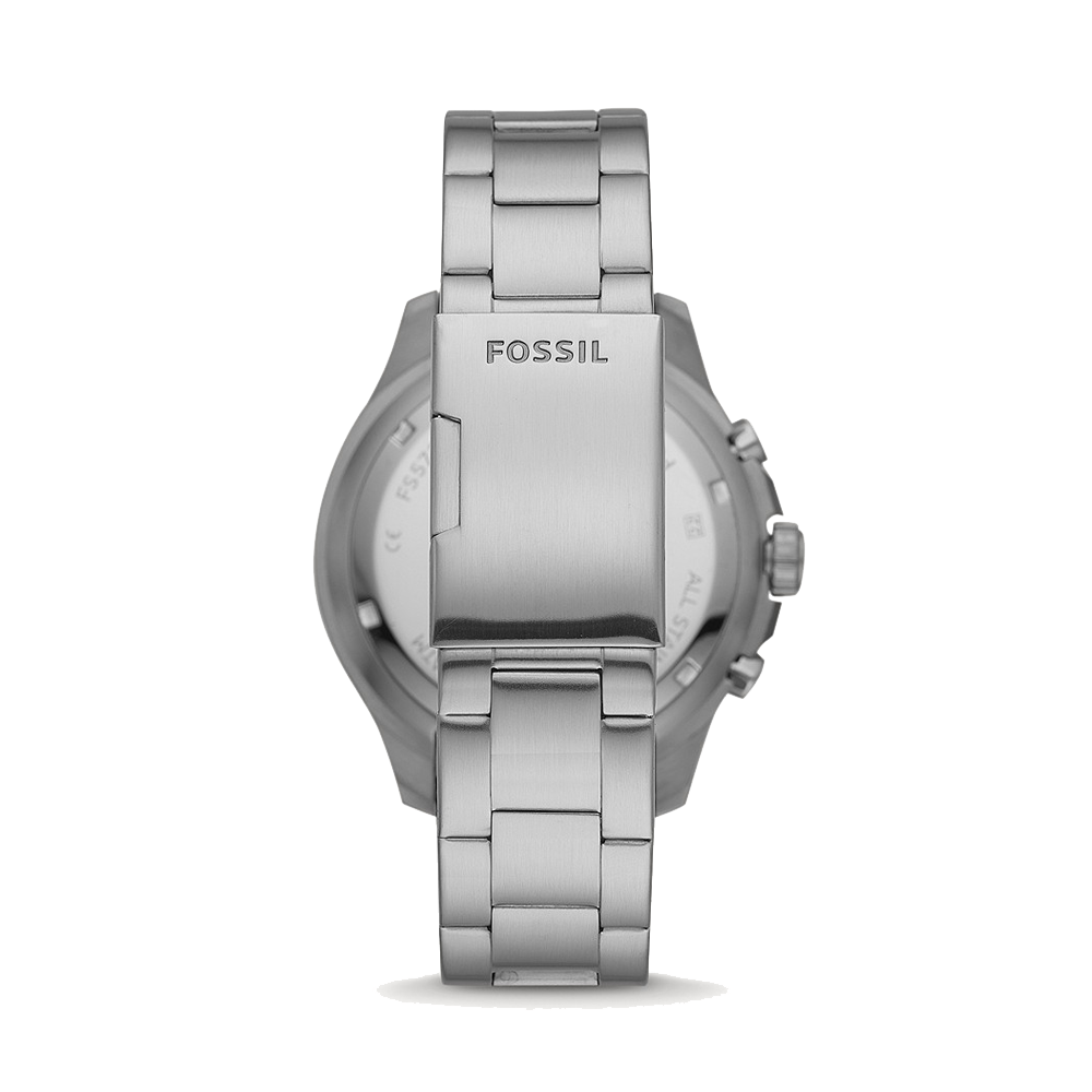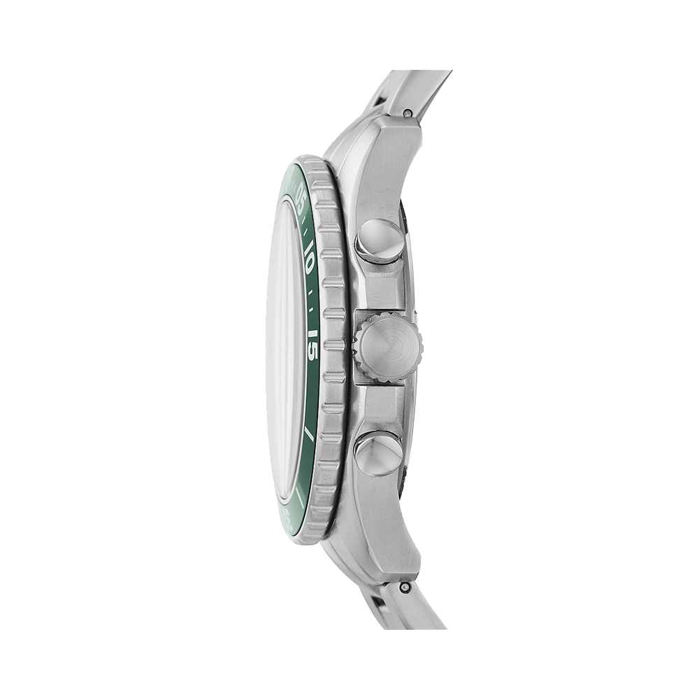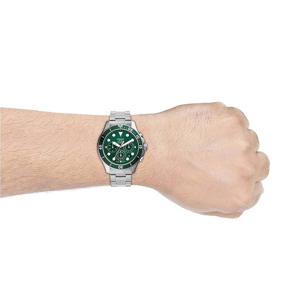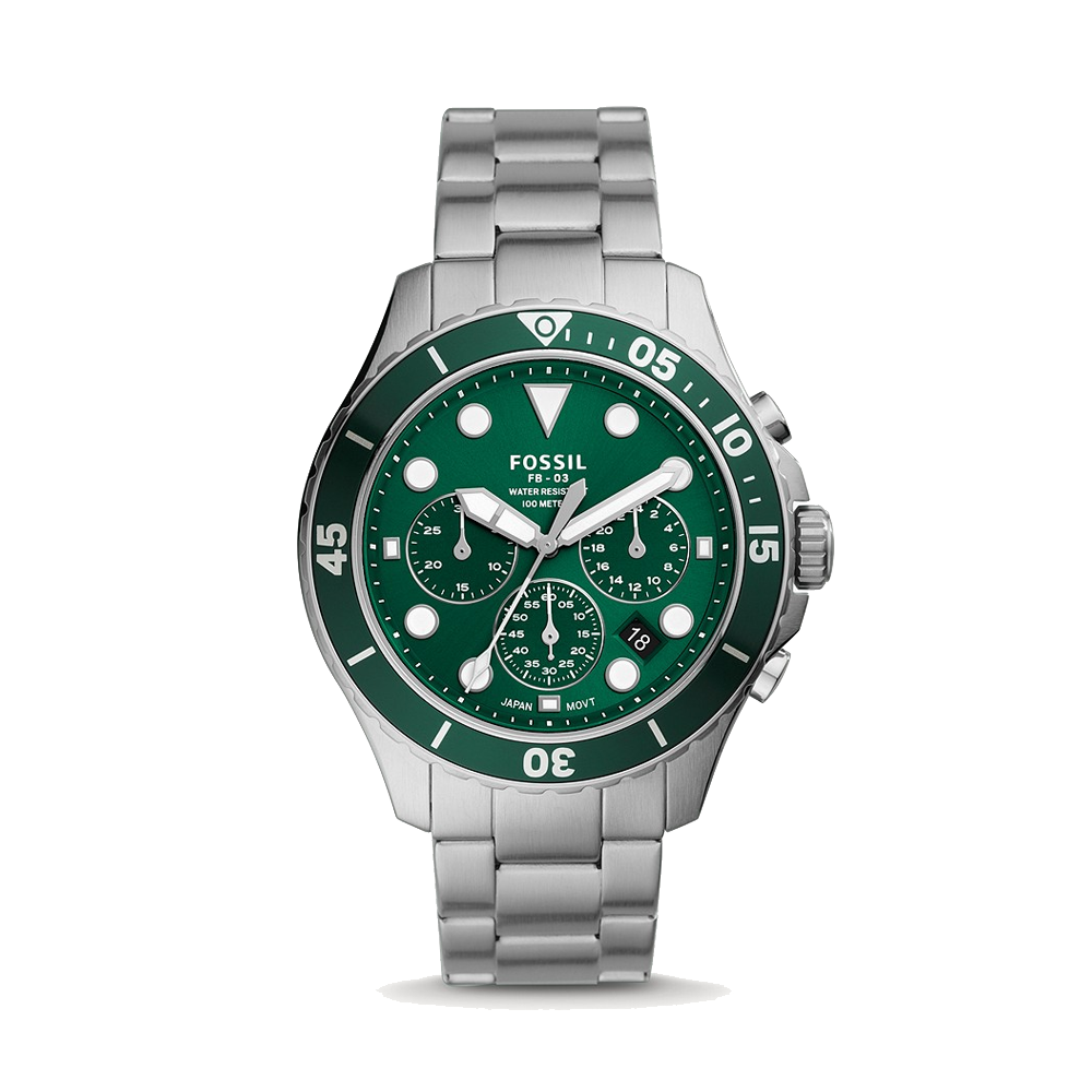 Add a tinge of subtlety to your look with this men's analog watch from the FB-03 collection by Fossil. Encased in a 46 mm case, the green round dial is protected by a mineral glass. It features stick hour markings and a crown for time adjustment. The stainless steel strap exudes an elegant silver hue that accentuates the look of the watch. Besides, it is completed with a push-button clasp to ensure a secure fit on the wrist.