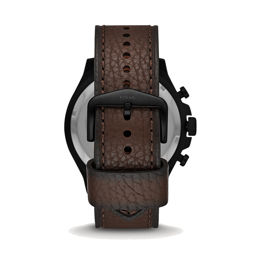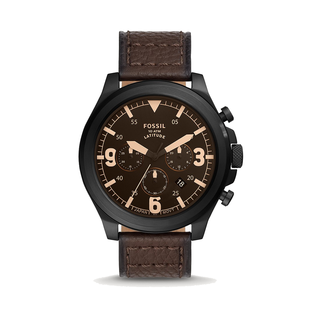 Effortless style meets extreme functionality. This Fossil's brown chronograph watch is the ultimate masculine essential. This 50mm Latitude features a black satin dial, chronograph movement and a brown leather strap that conveys fresh style with contemporary edge.
