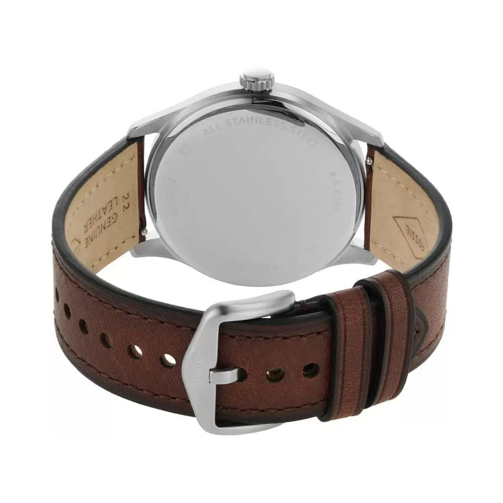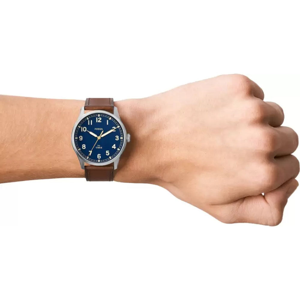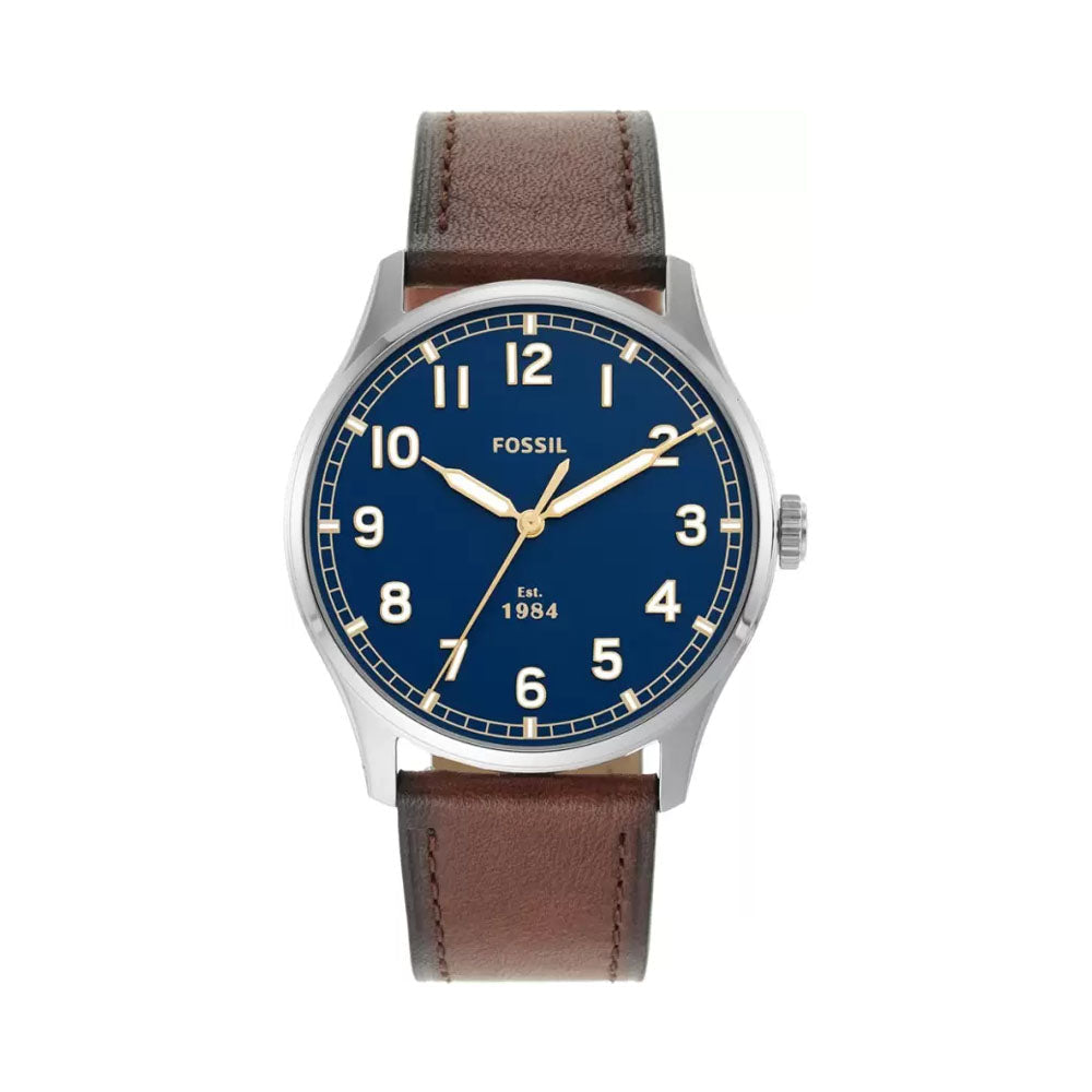 Simple yet stylish, this men's analog watch from the Dayliner collection by Fossil will be a perfect pick for you. Its genuine leather strap flaunts a brown hue that accentuates the look of the watch. The blue round dial is encased in a 42 mm case. It exudes plain three...