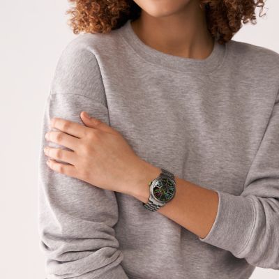 Celebrate 40 years of Star Wars™ Return Of The Jedi™ with this Star Wars x Fossil watch. It features a TIE fighter-inspired window framing over the crystal, lume-printed TIE fighters on the dial and a three-link gunmetal stainless steel bracelet.