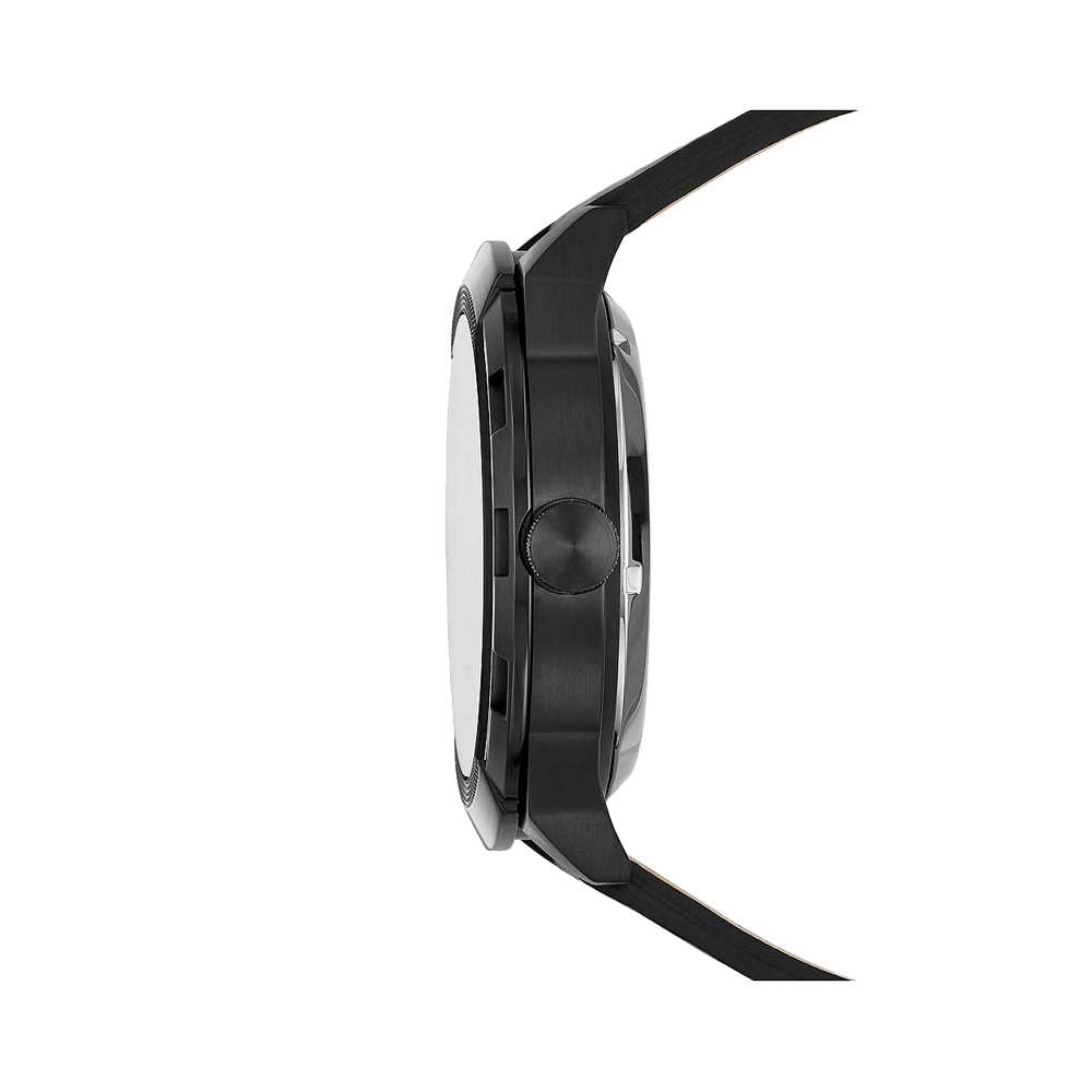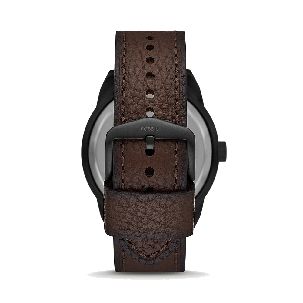 Case size: 50mm; Band size: 24mm; automatic movement with analog display; mineral crystal face Black plated stainless steel case; two tone dial without date window Brown leather strap with single prong strap buckle closure