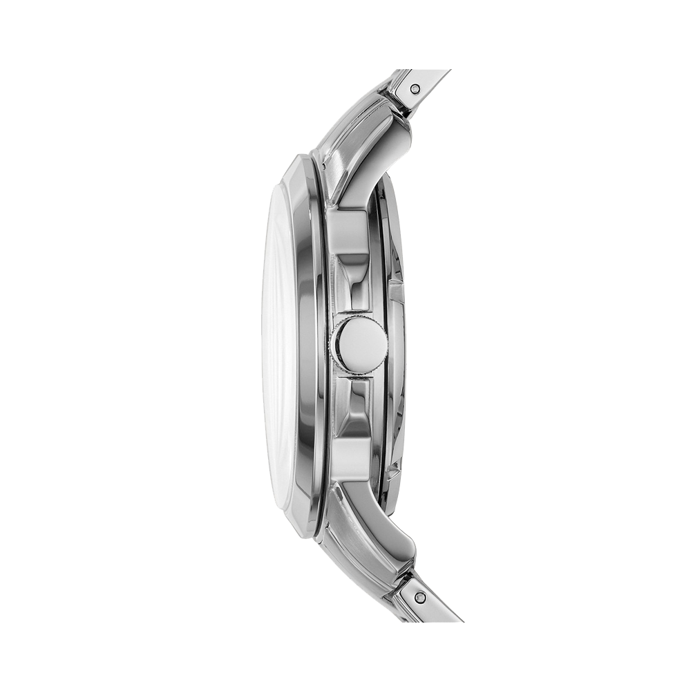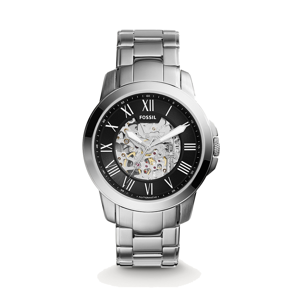 Take your look several notches up with this men s analog watch from the Grant collection by Fossil. This watch features a black round dial which acts as the perfect contrast to the silver stainless steel strap. Powered by an automatic movement, this water resistant watch is a must-have for...