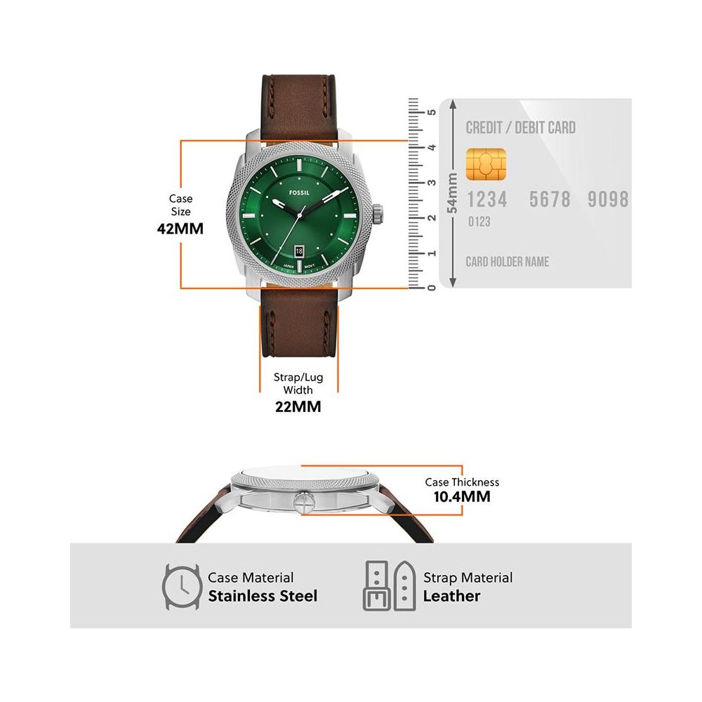 Go to the shopThis 42mm Machine features a green cd finish sunray dial, three-hand date movement and brown leather strap. Fossil leather products support responsible manufacturing via the Leather Working Group.