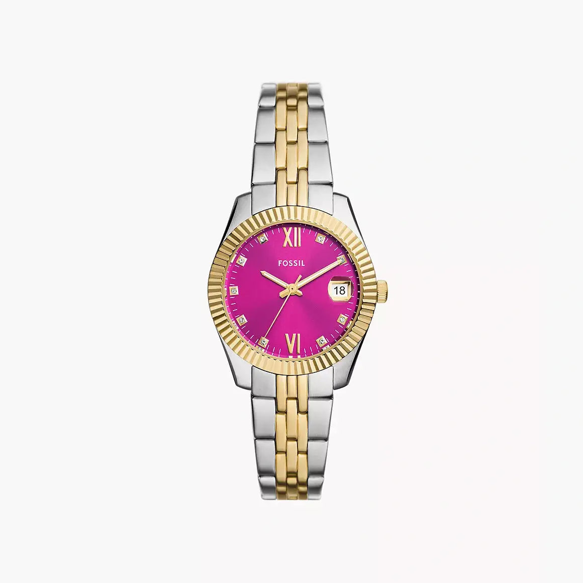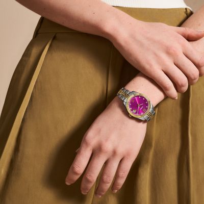 Go to the shopThis 32mm Scarlette features a magenta sunray dial, three-hand date movement and two-tone stainless steel bracelet.