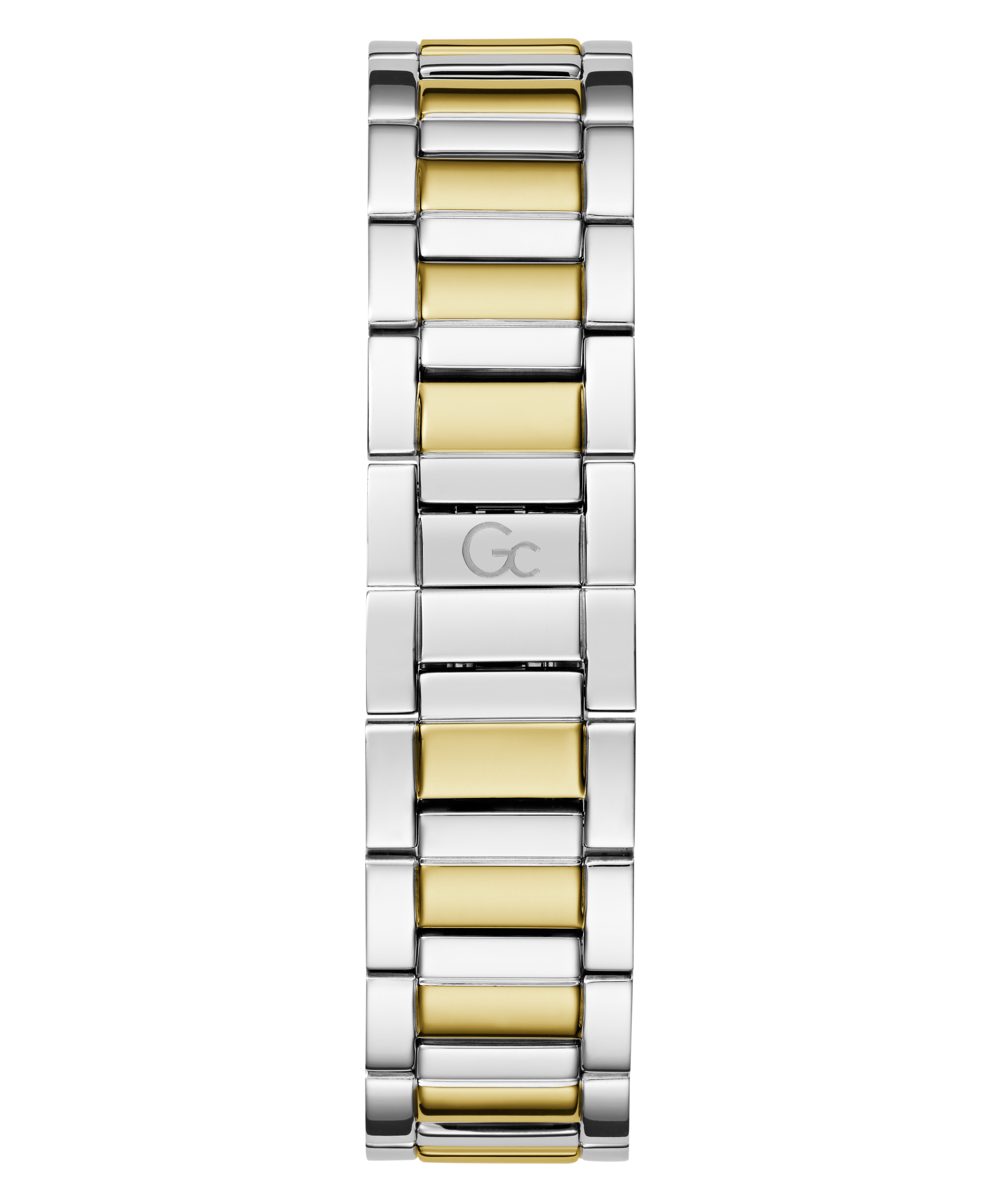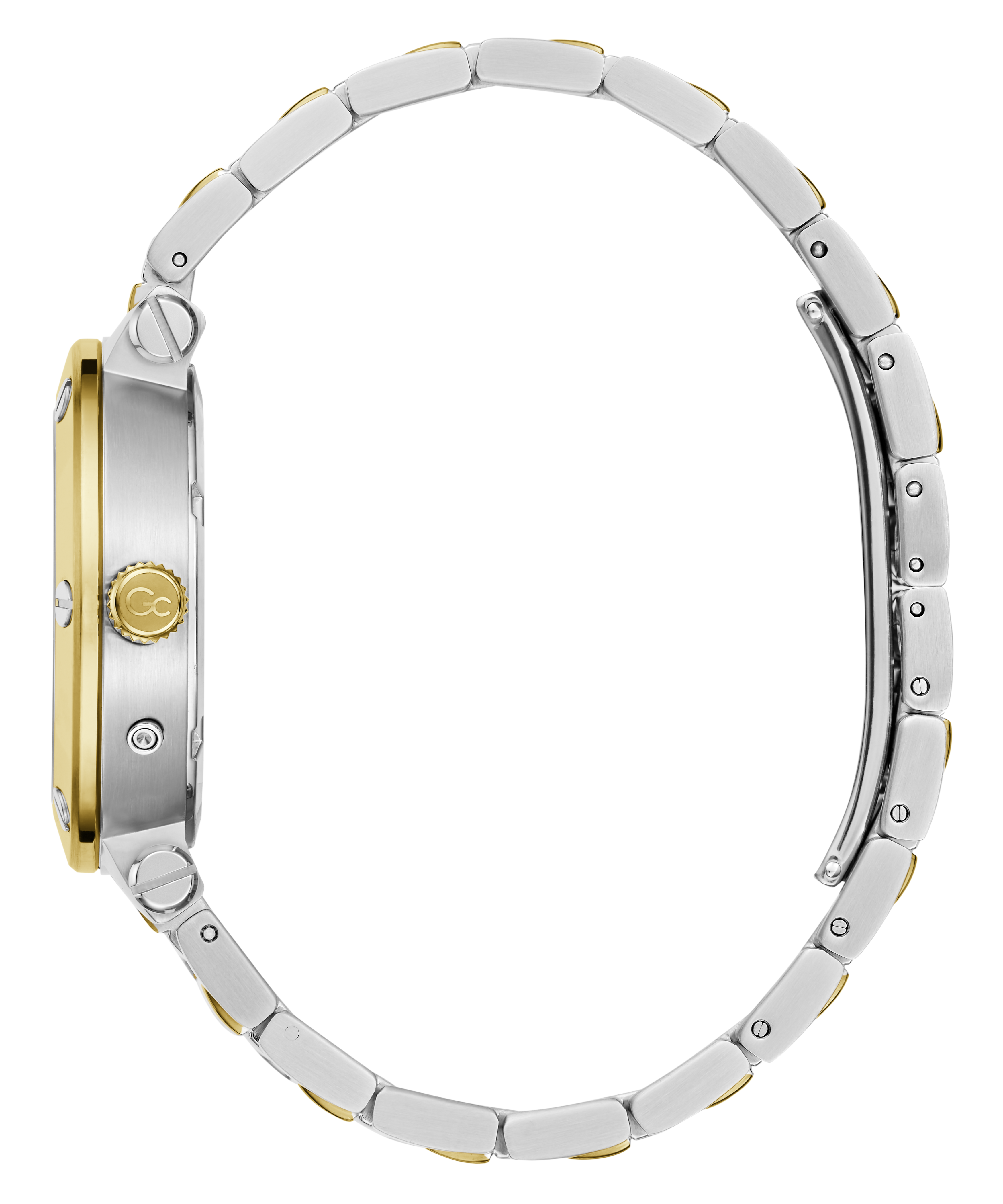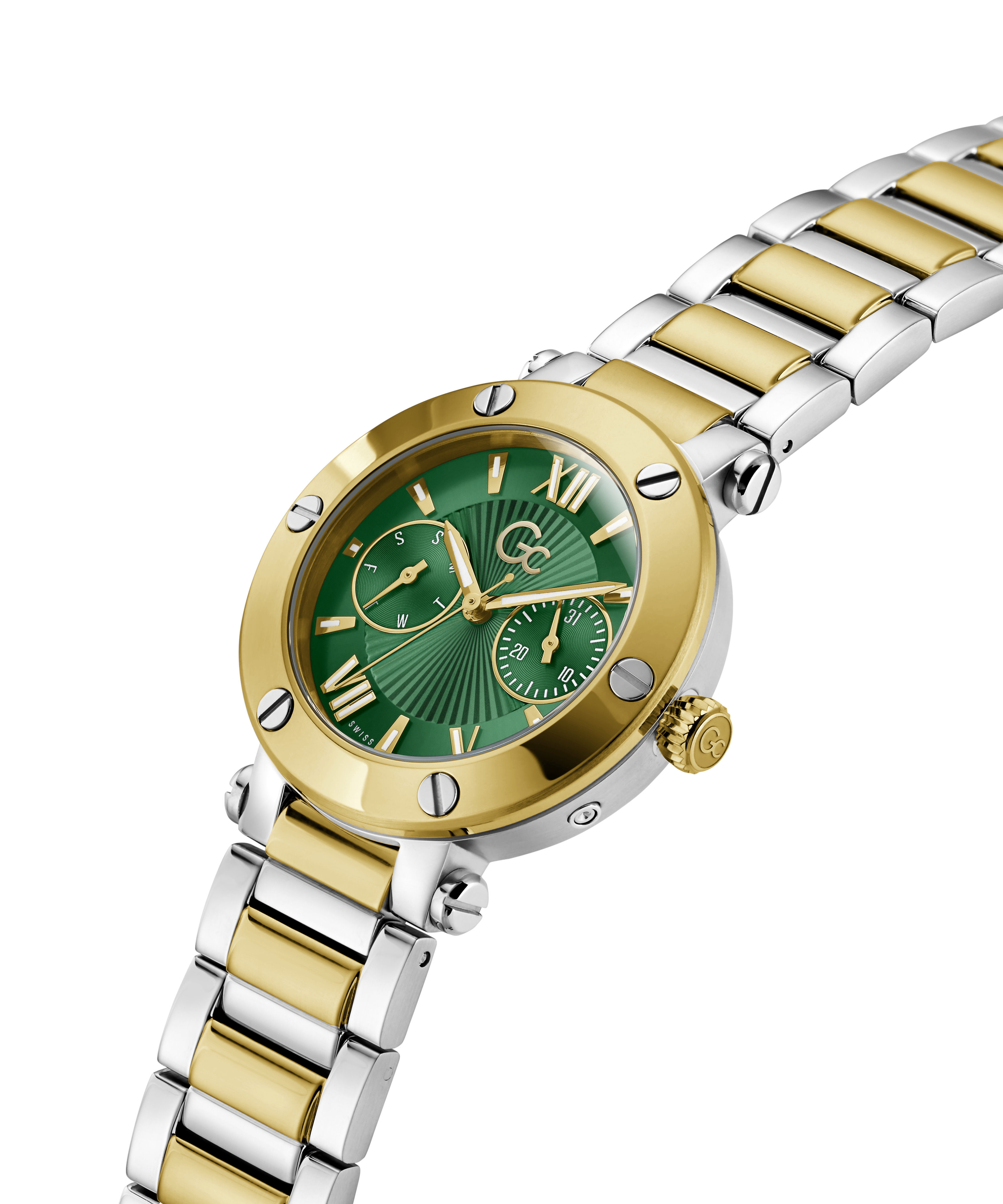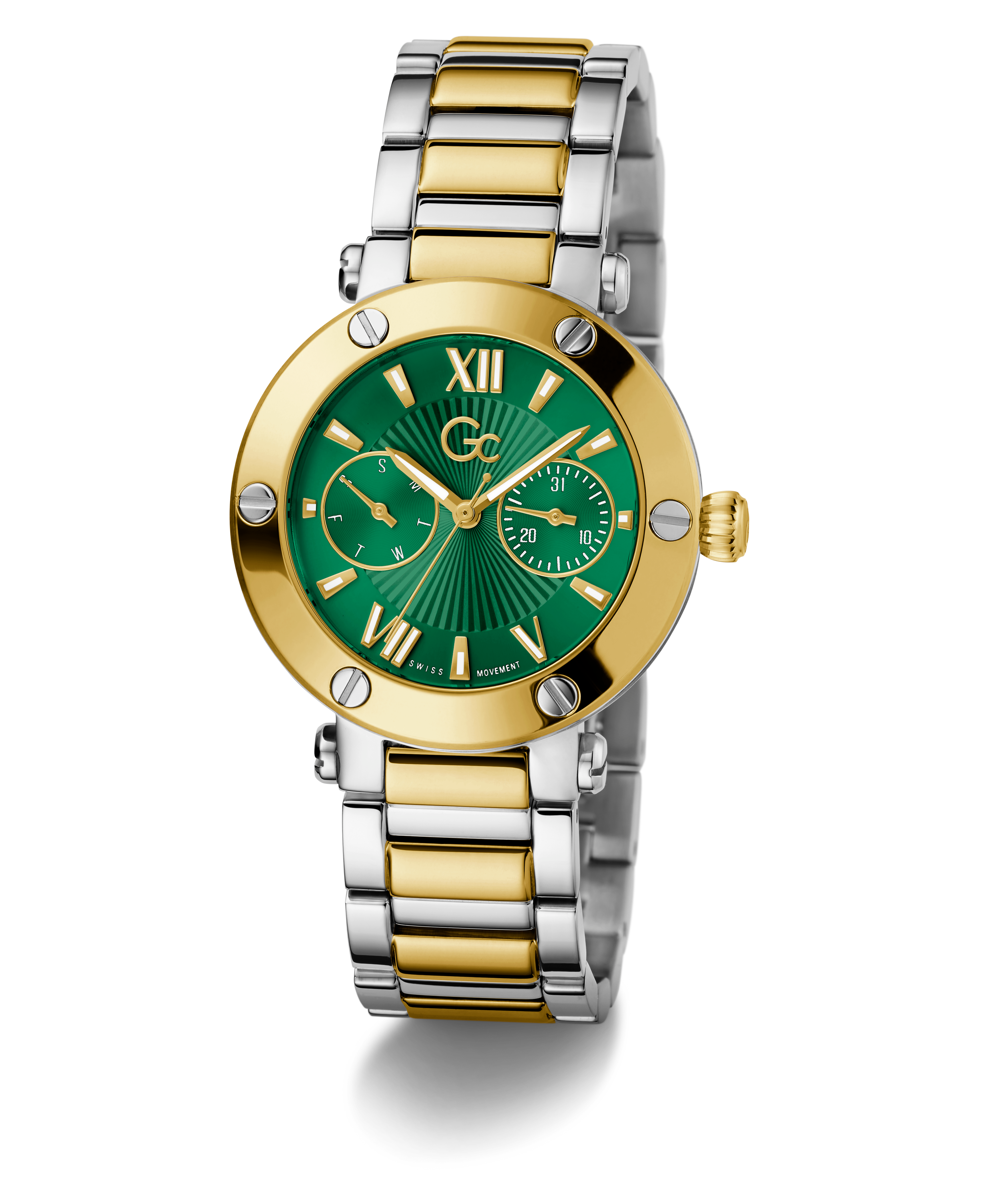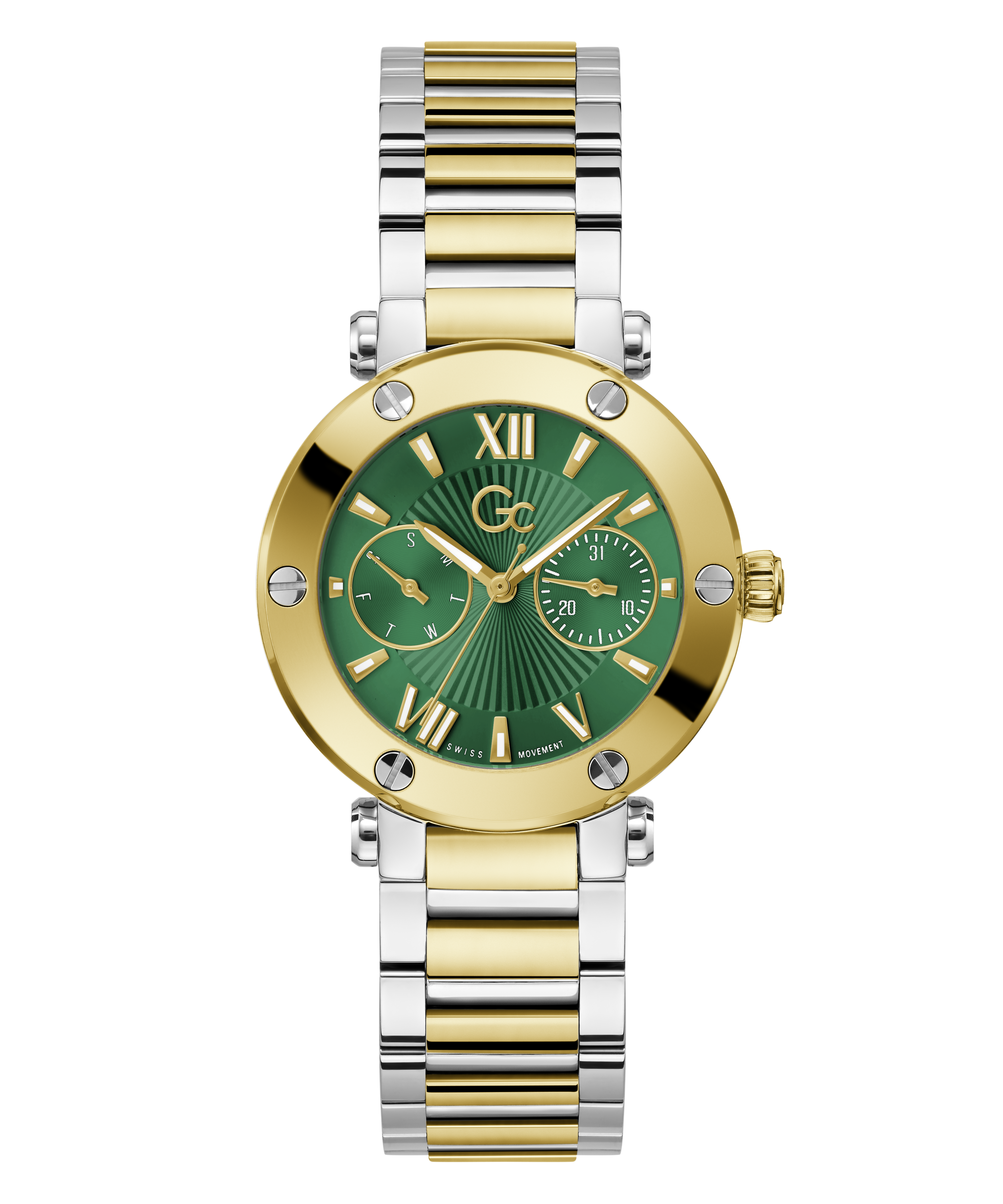 The expression of a modern yachting look, the Gc Aura boots your everyday attire. The two-tone silver & yellow gold PVD case is paired with a fashionable emerald green sunray and textured dial that displays day and date. With its emblematic T-bar construction, the bracelet offers a casual refined look...