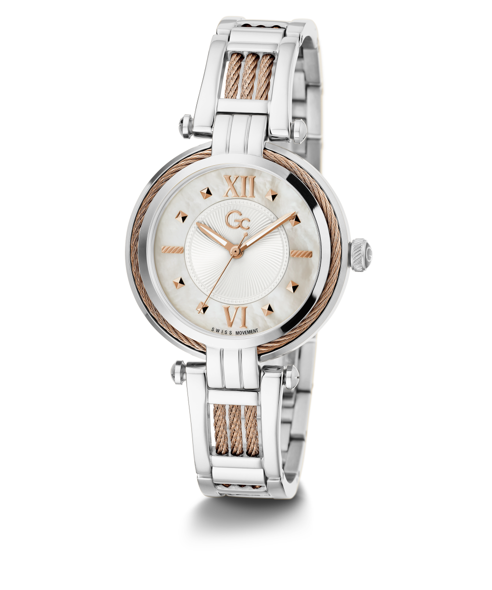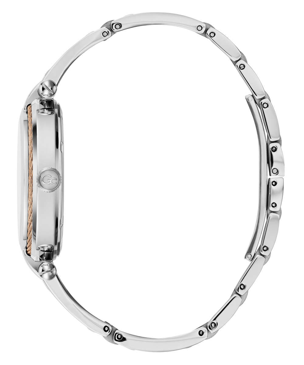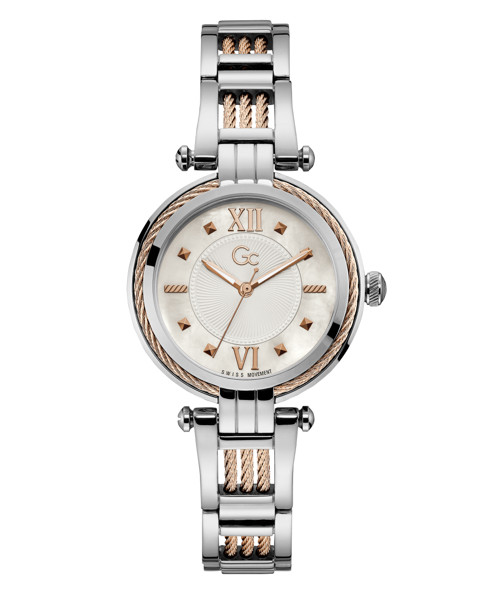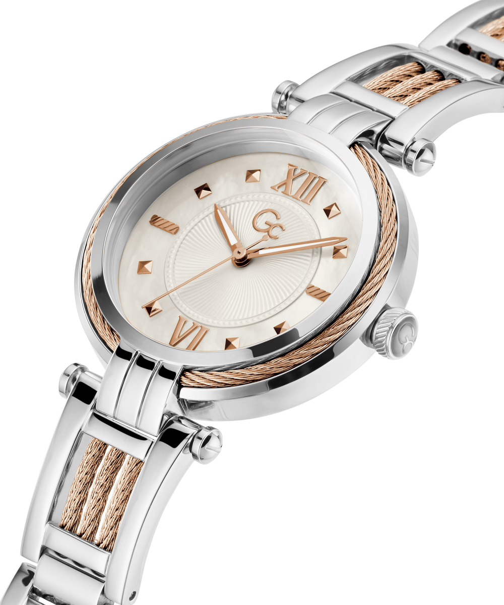 Bijou look meets cable elegance on bezel and bracelet for an exclusive design of sophisticated chic in a two-tone version with silver dial and rose gold indices and twisted cable details