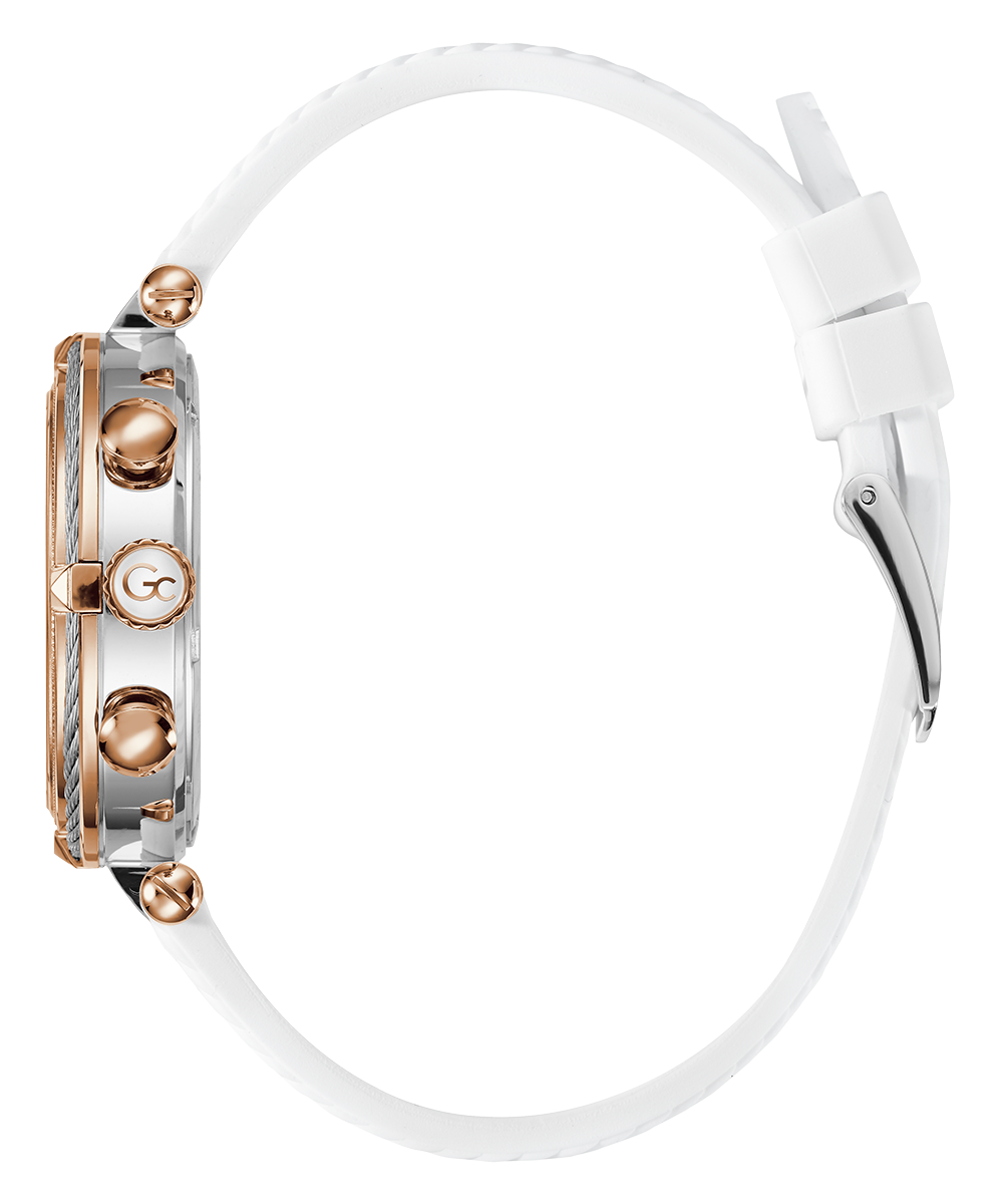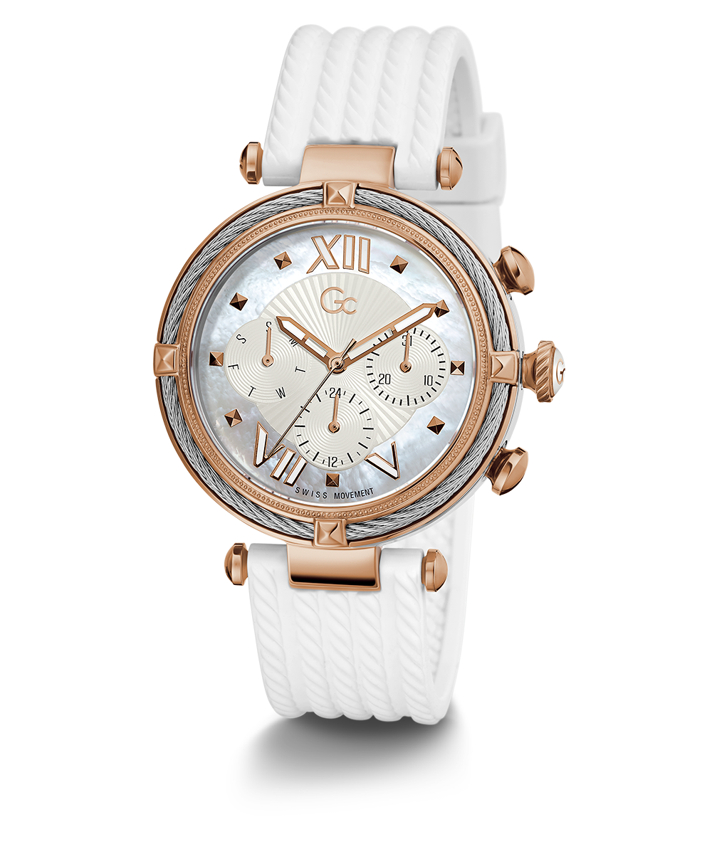 Indulge yourself with a unique fusion of fashionable sporty chic, with the intricate glittering cable-wire details on the bezel and the guilloché mother-of-pearl dial of this ladies multi-function watch, with second time-zone, combined with the comfort of the white silicon strap.