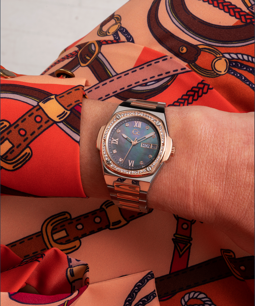 Revamp your style, with Gc Coussin shape and its square case.Rose Gold sophistication, and dazzling crystals give this timepiece an elegant and daring allure.The charismatic case is holding a Day-date swiss movement that is visible on the dial within a window at 3 o’clock. It is encircled with crystals and...