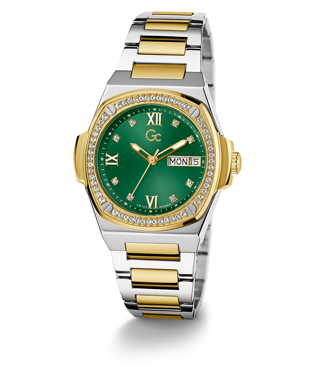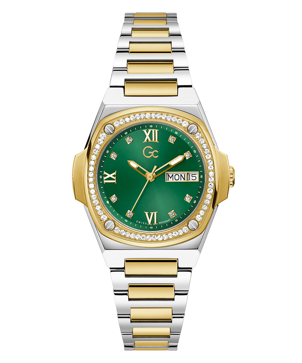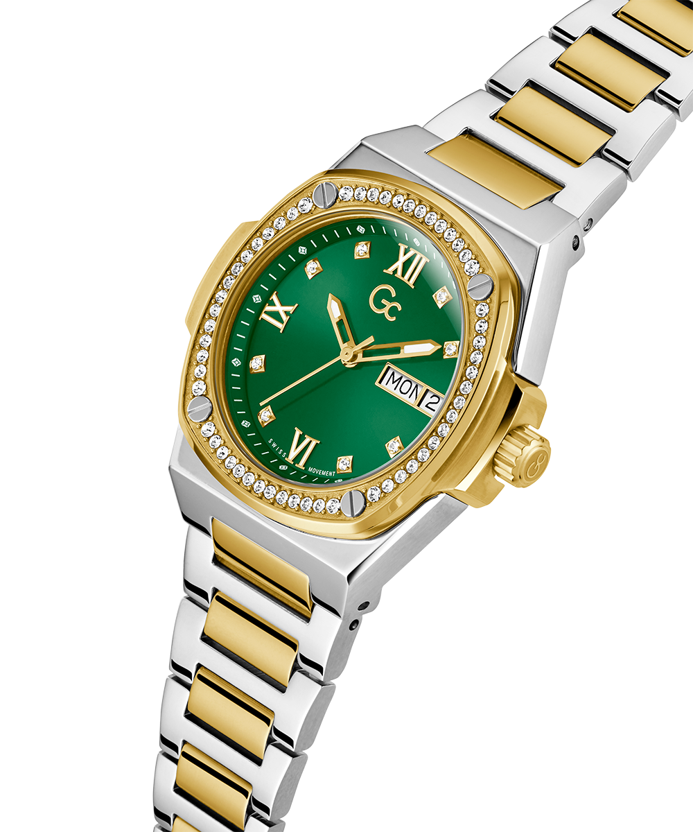 Revamp your style, with Gc Coussin Shape and its square case. Yellow gold sophistication, and dazzling crystals give this timepiece an elegant and daring allure.The charismatic case is holding a day-date swiss movement that is visible on the dial within a window at 3 o’clock. It is encircled with crystals and have screw design details on the bezel. This two-tone silver & yellow gold version has an emerald green sunray dial with yellow gold hands. This timepiece is comfortable to wear, thanks to the multi-links bracelet.