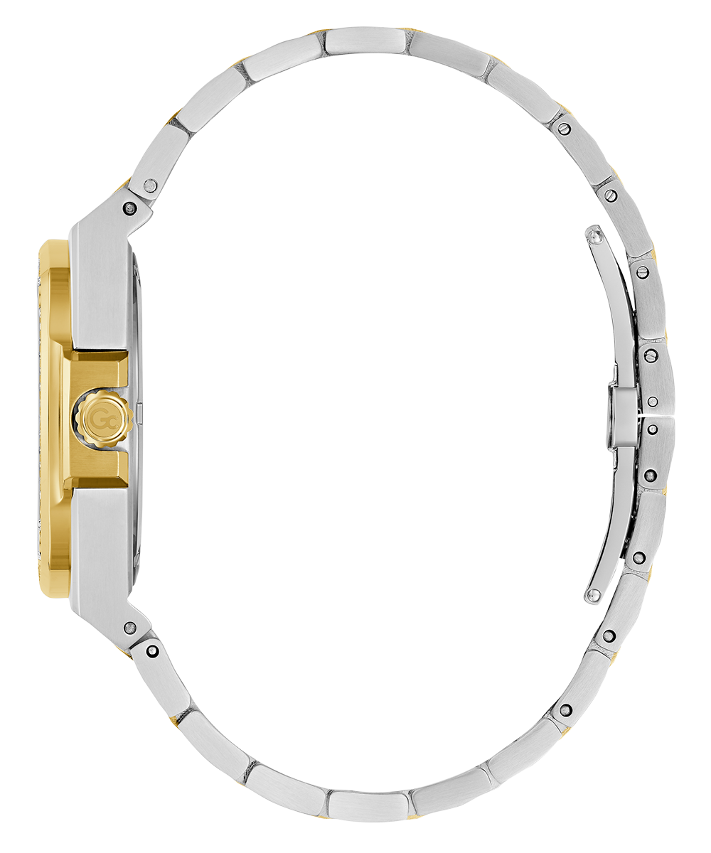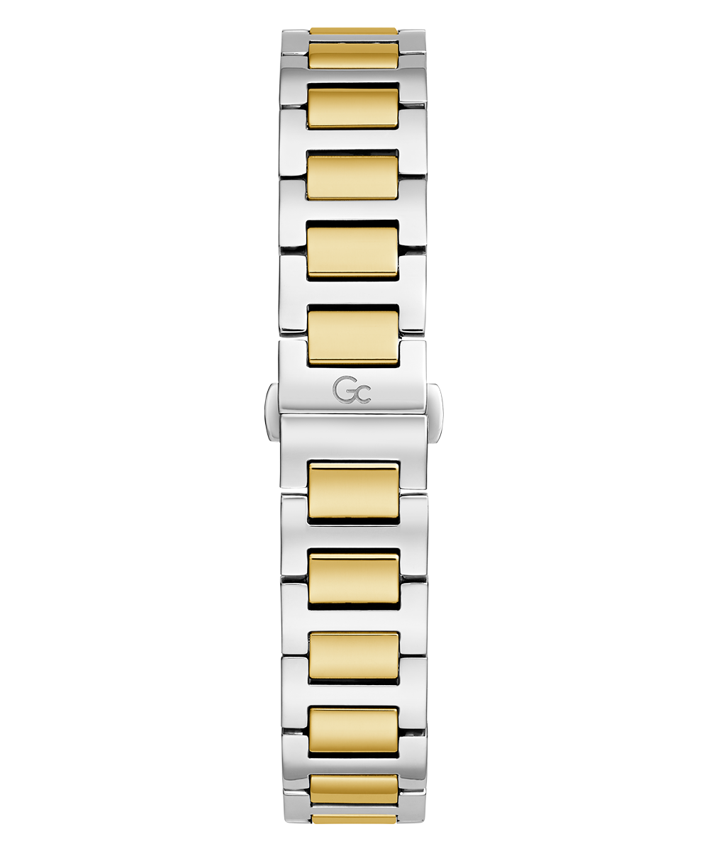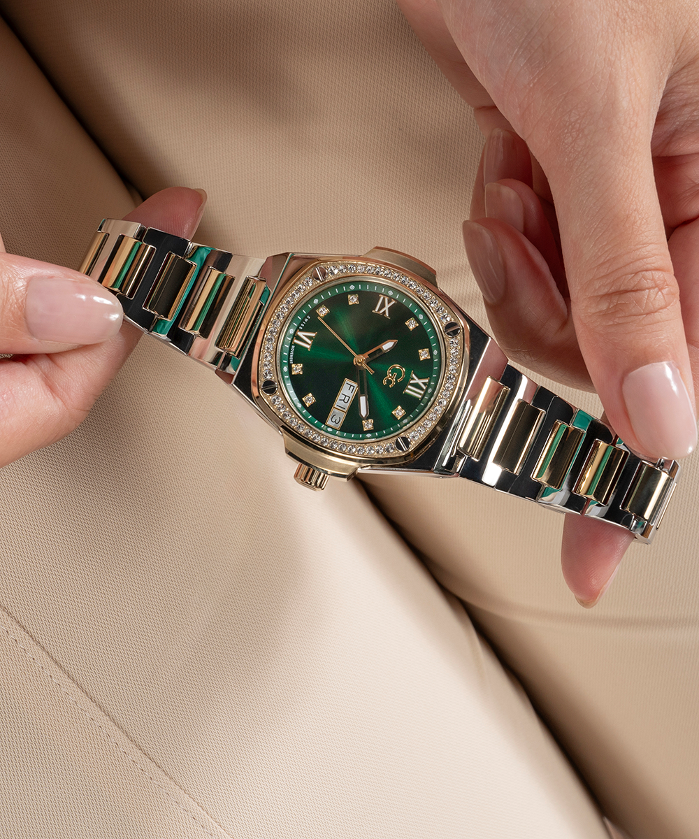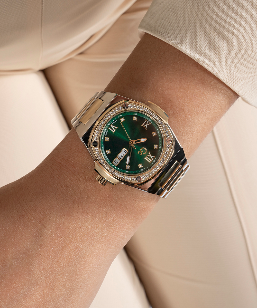 Revamp your style, with Gc Coussin Shape and its square case. Yellow gold sophistication, and dazzling crystals give this timepiece an elegant and daring allure.The charismatic case is holding a day-date swiss movement that is visible on the dial within a window at 3 o’clock. It is encircled with crystals and have screw design details on the bezel. This two-tone silver & yellow gold version has an emerald green sunray dial with yellow gold hands. This timepiece is comfortable to wear, thanks to the multi-links bracelet.