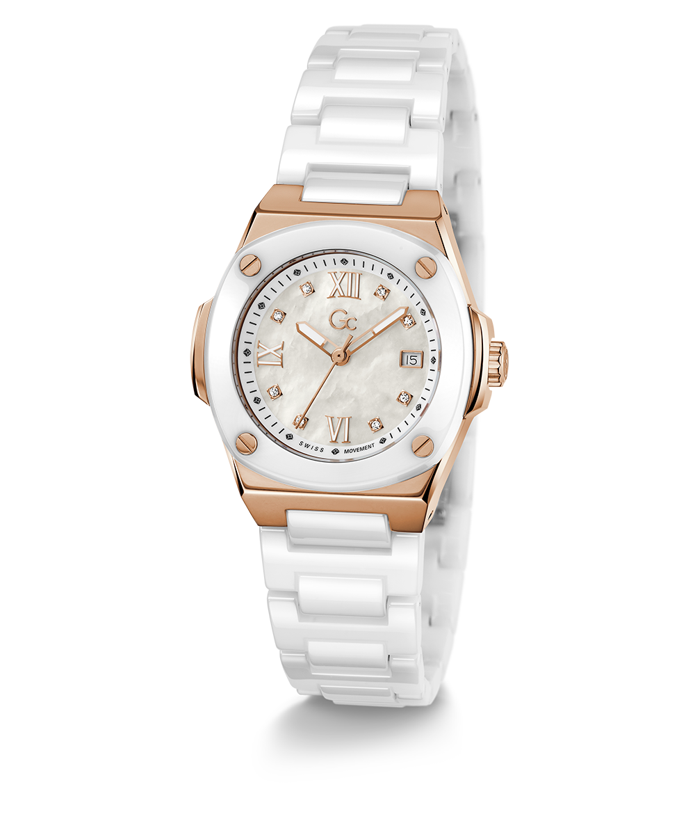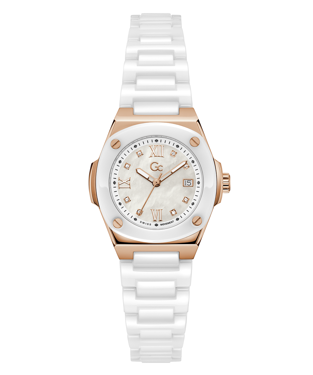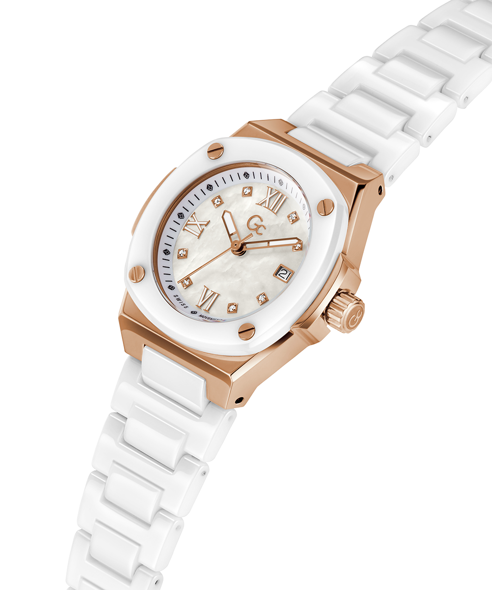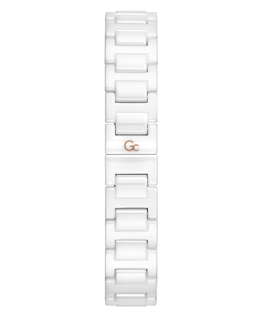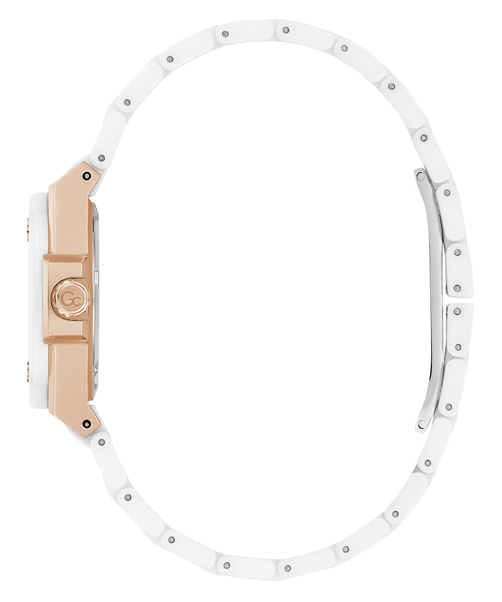 Revamp your style, with Gc Coussin Shape Mini and its square case, in its ceramic execution (on top ring and full bracelet). Rose gold sophistication and white ceramic give this timepiece a refined, yet casual allure. The charismatic case have screw design details on the bezel. The dial in white...