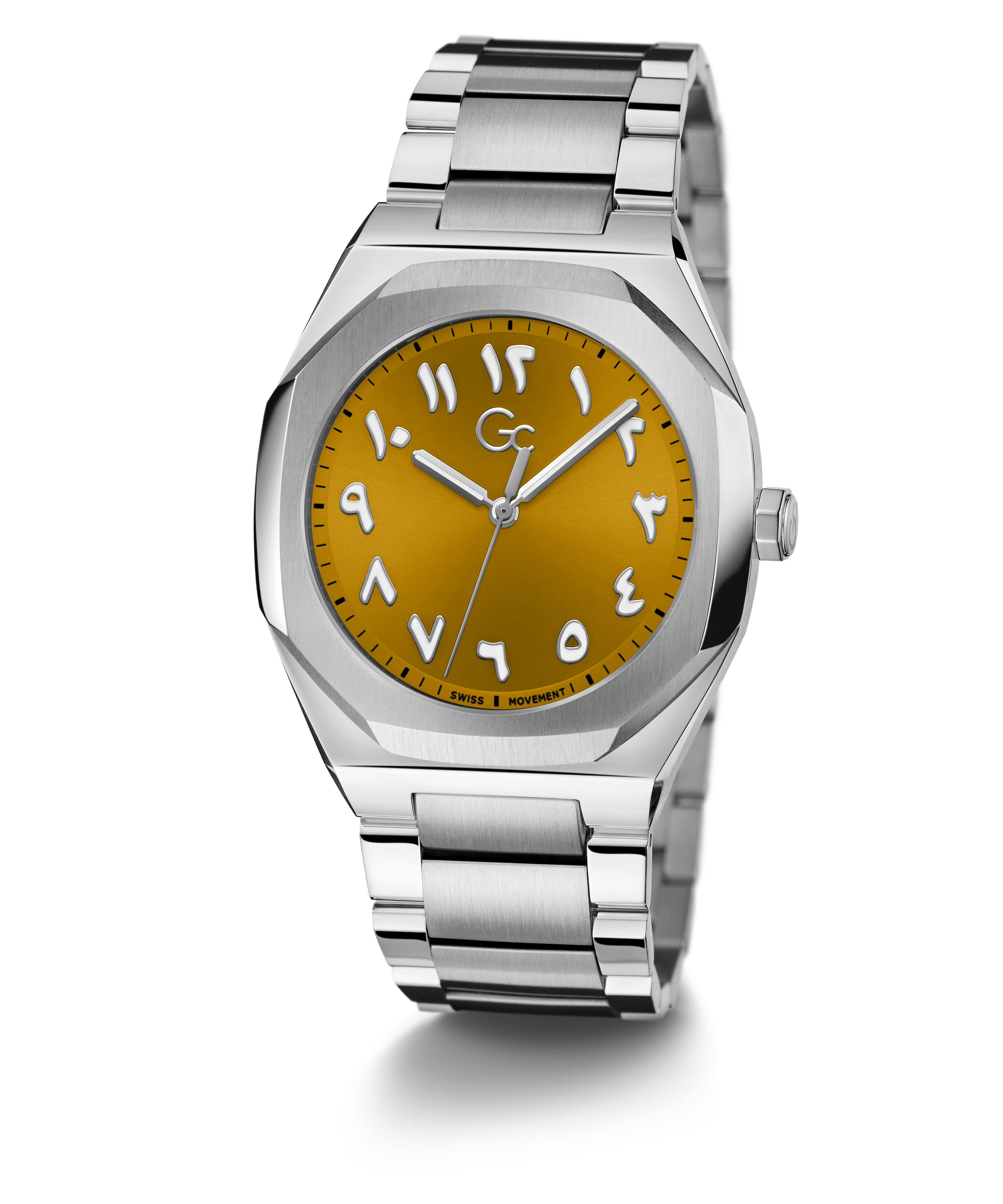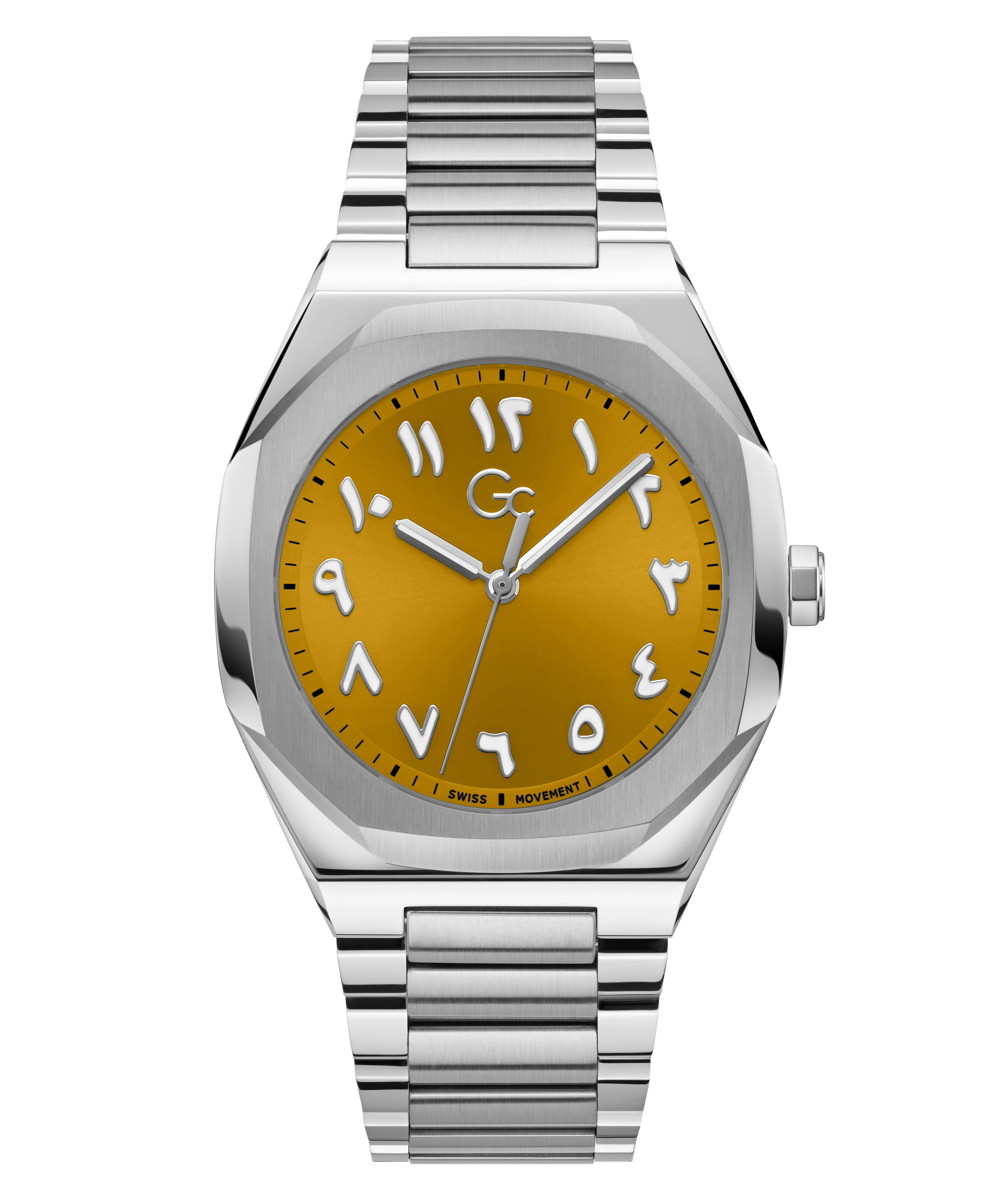 Sleek & Stylish The Gc Coussin Sleek takes our iconic cushion look to a dressier twist, with its slim case in size 42mm and refined top ring design in silver tone for a a special version with fashionable golden yellow sunray dial and Indian numerals. This unique version is inspired...