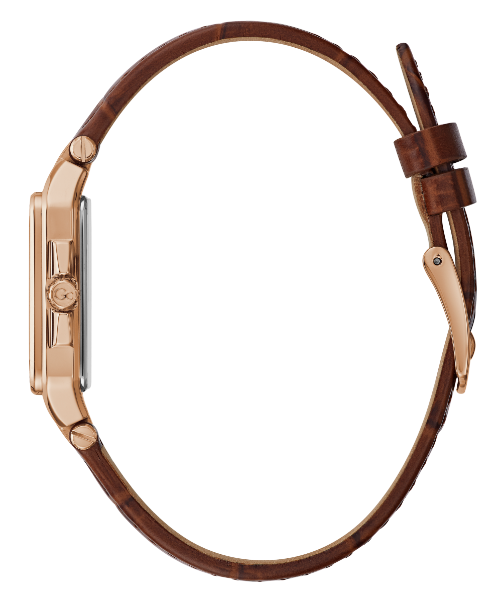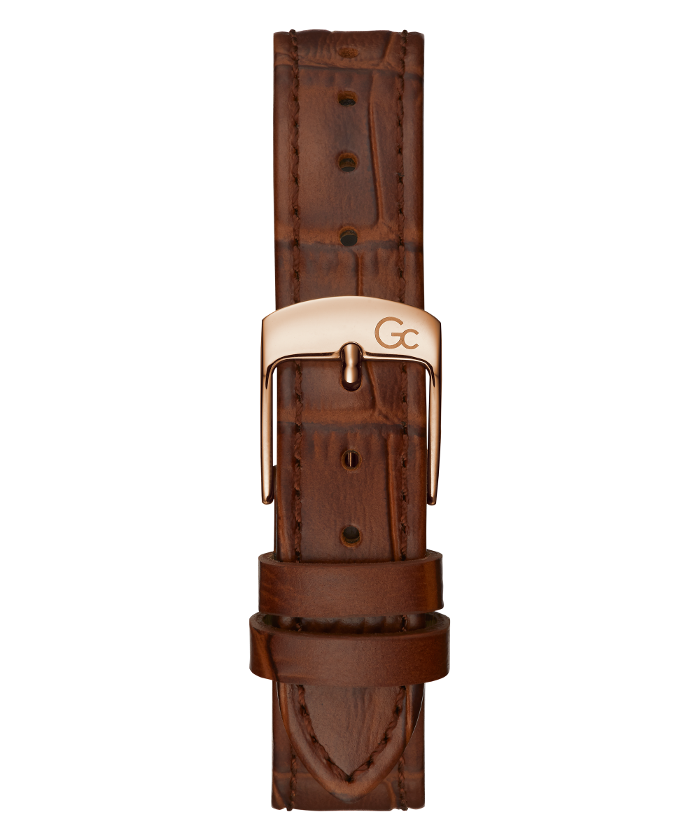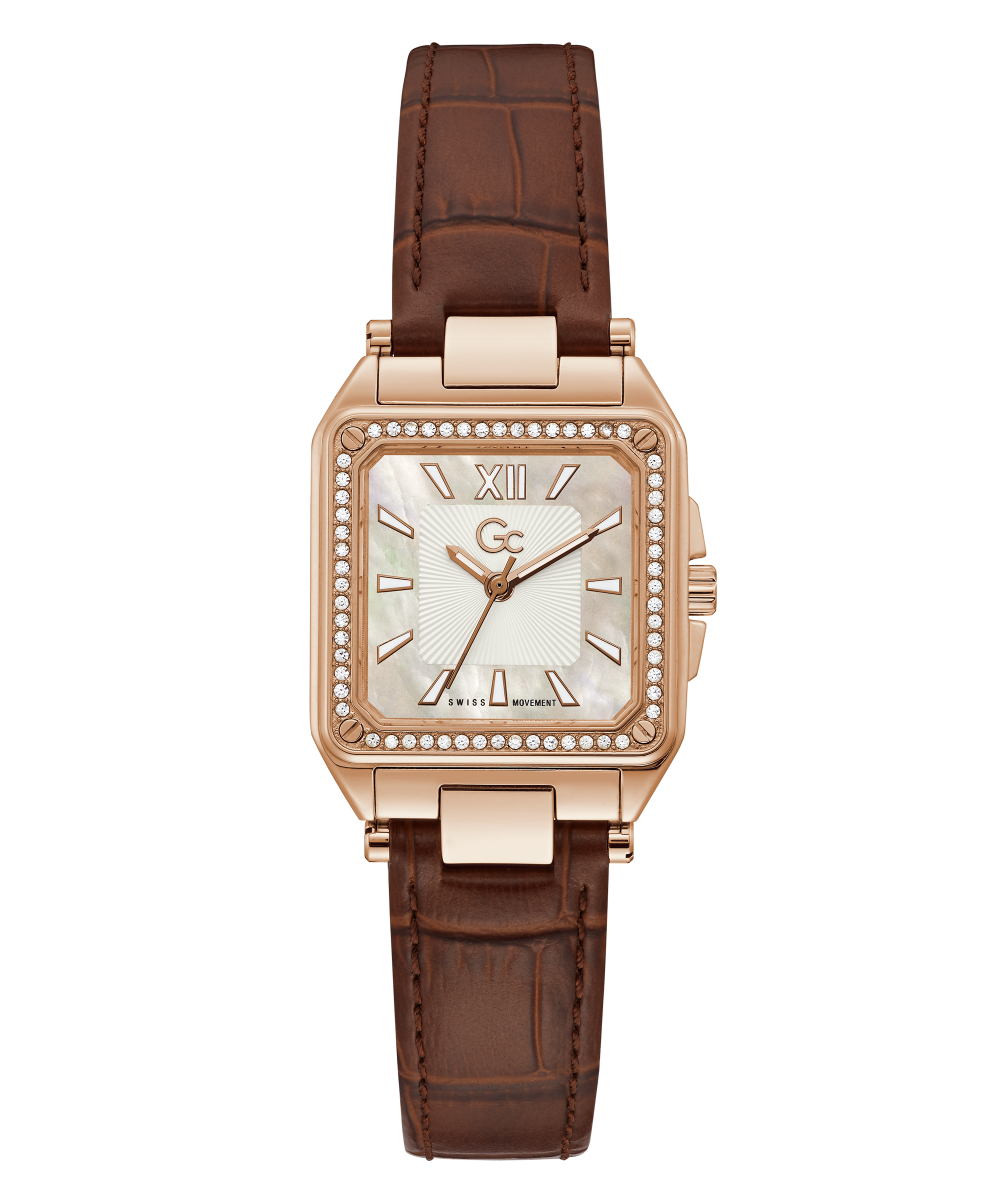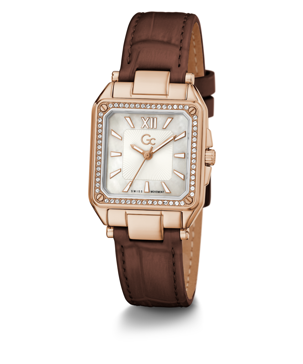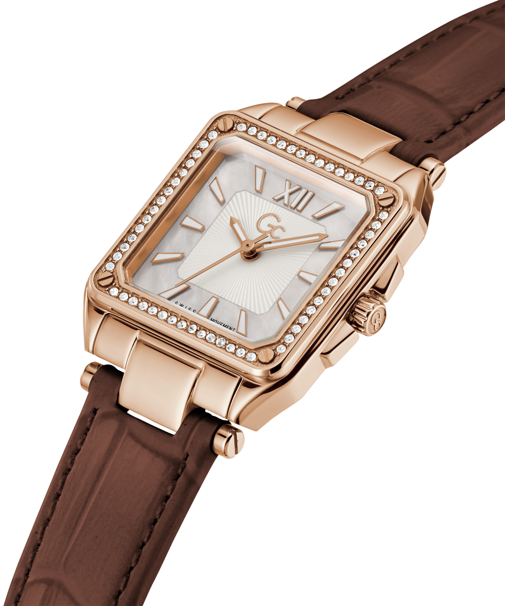 Dress up with the Gc Couture and its square case. This elegant all-rose gold tone timepiece has a white mother of pearl dial with guilloche centre contrasting with rose gold accents.The whole encircled with crystals on the bezel and set with brown leather strap.