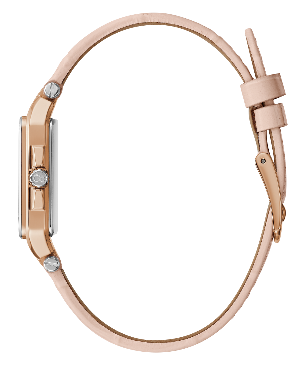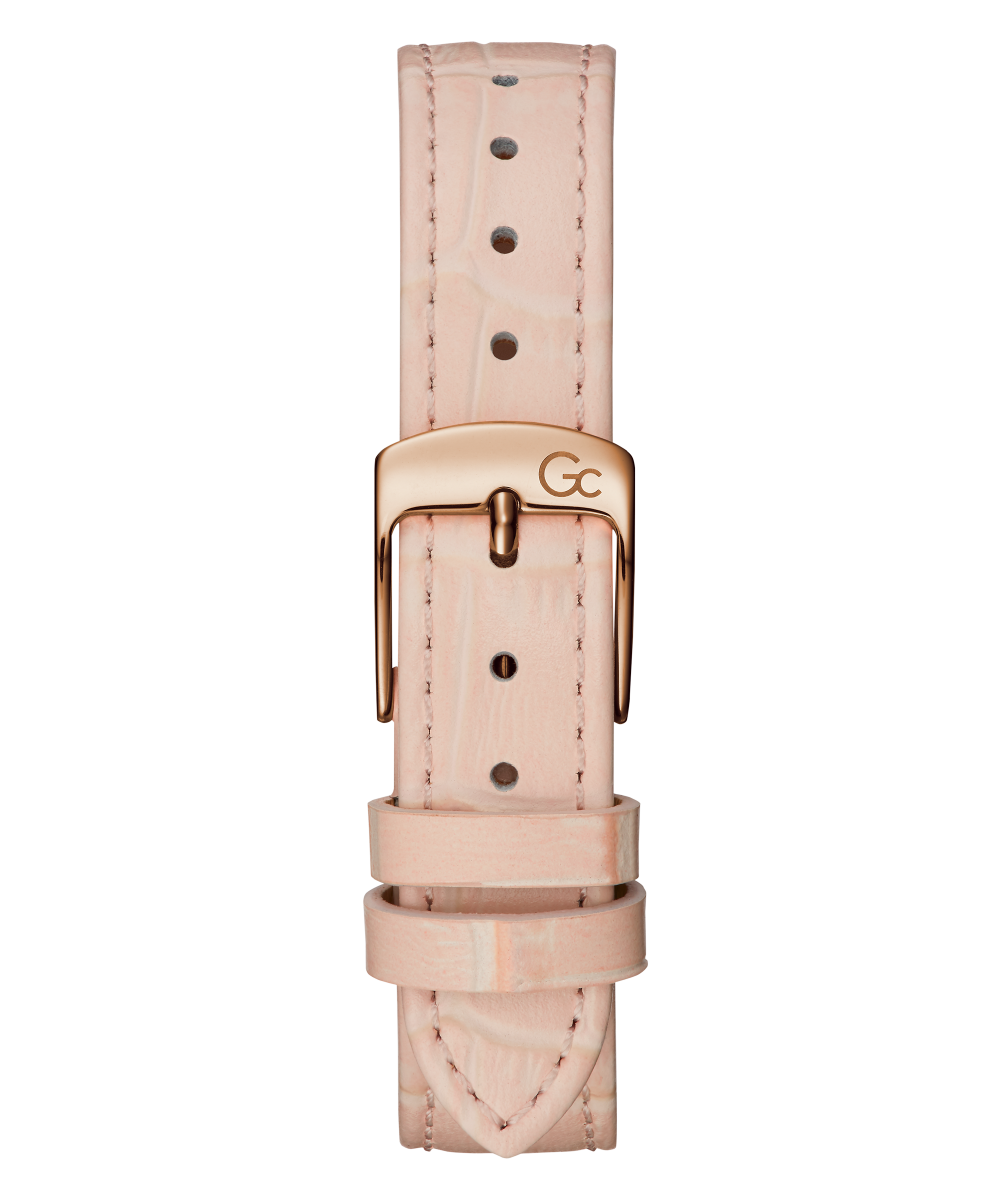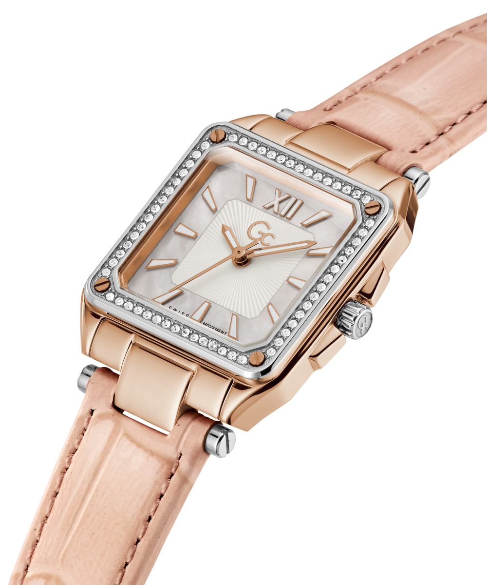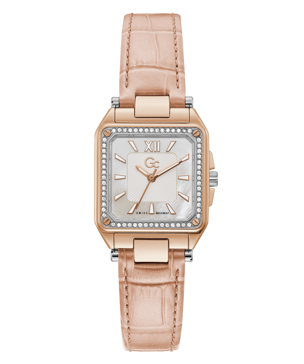 Dress up with the Gc Couture and its square case. This elegant two-tone silver and rose gold tone timepiece has a white mother of pearl dial with guilloche centre contrasting with rose gold accents.The whole encircled with crystals on the bezel and set with nude leather strap.