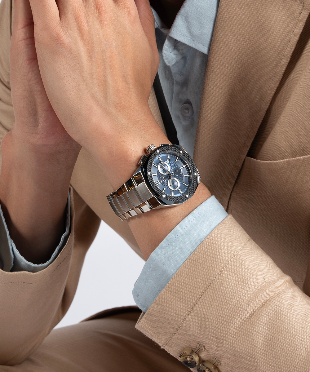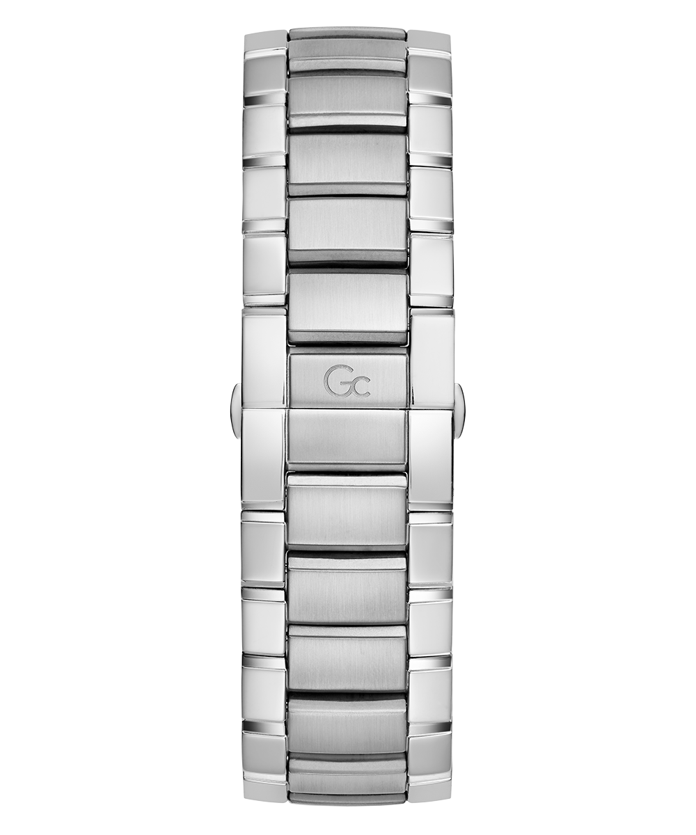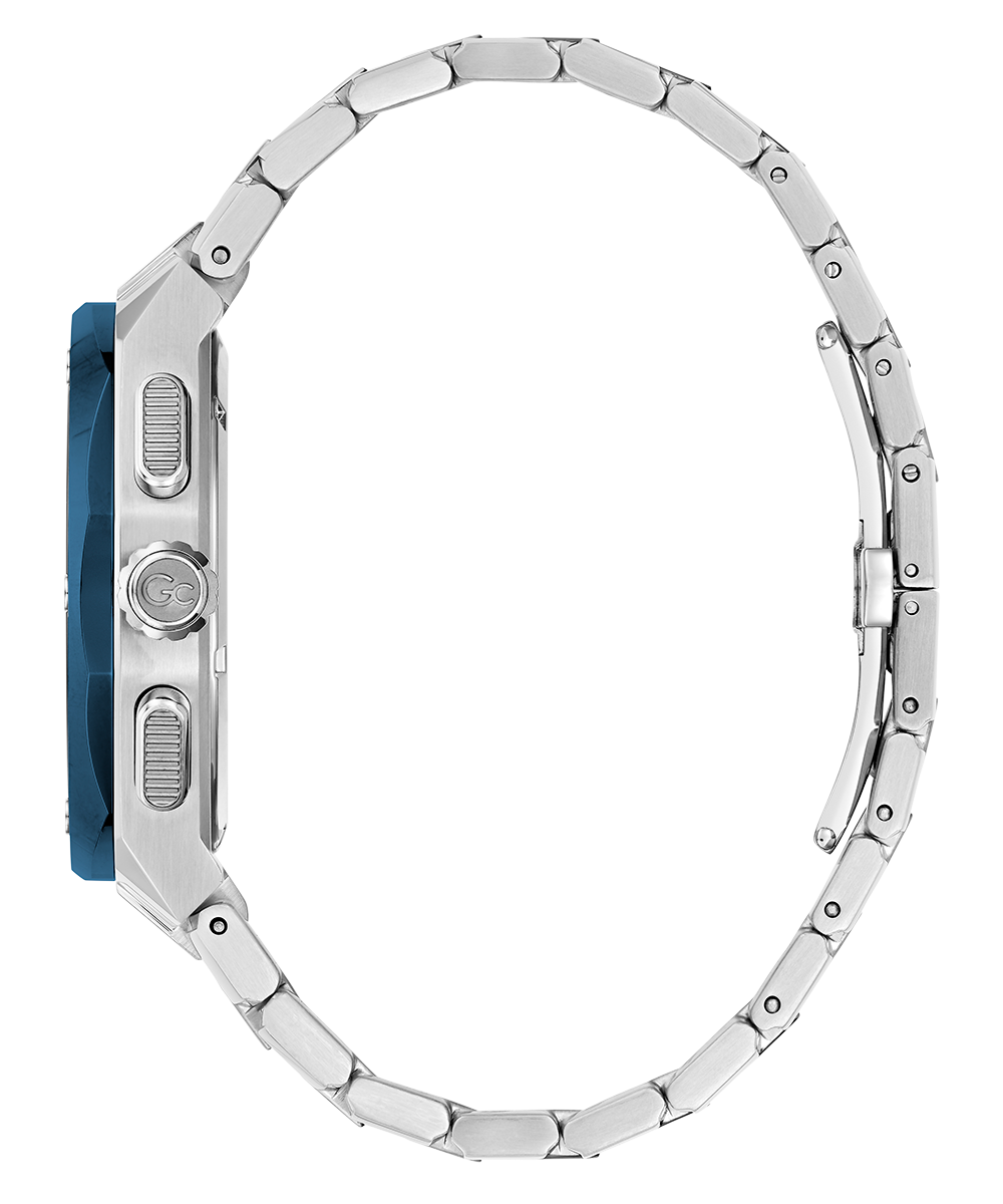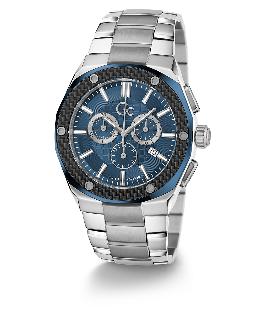 Adopt bold masculinity with the Gc Fiber and its 44mm case, featuring a genuine carbon fiber insert on the blue tone top ring, and an ocean blue dial. The structured silver tone bracelet completes the sport-chic look, adding an assertive touch to this timepiece.