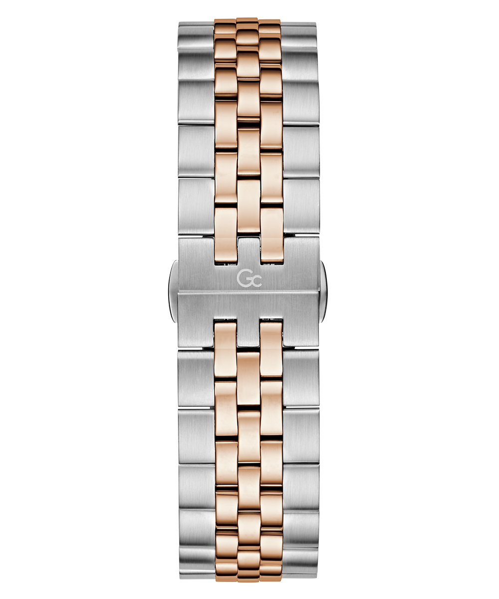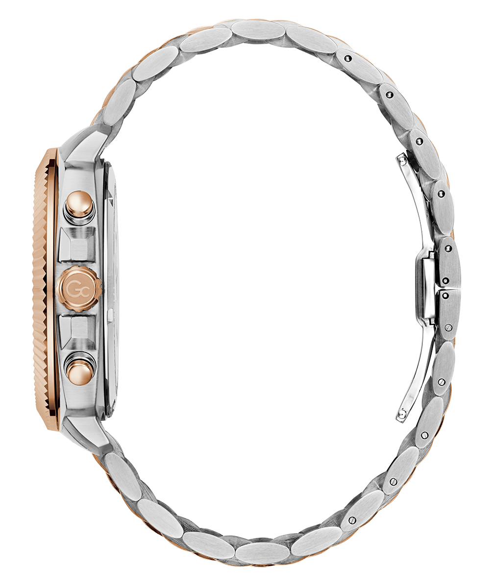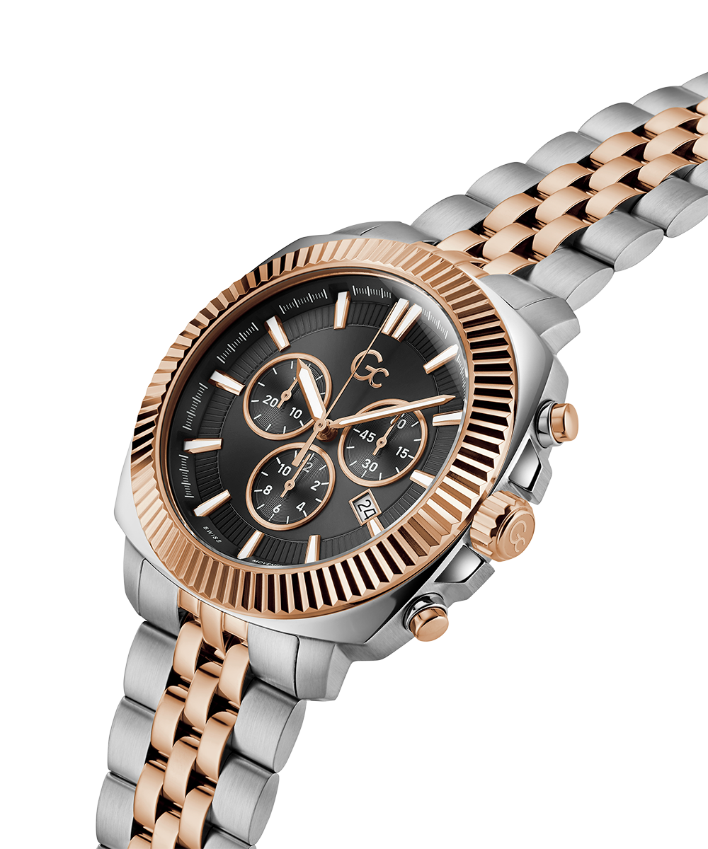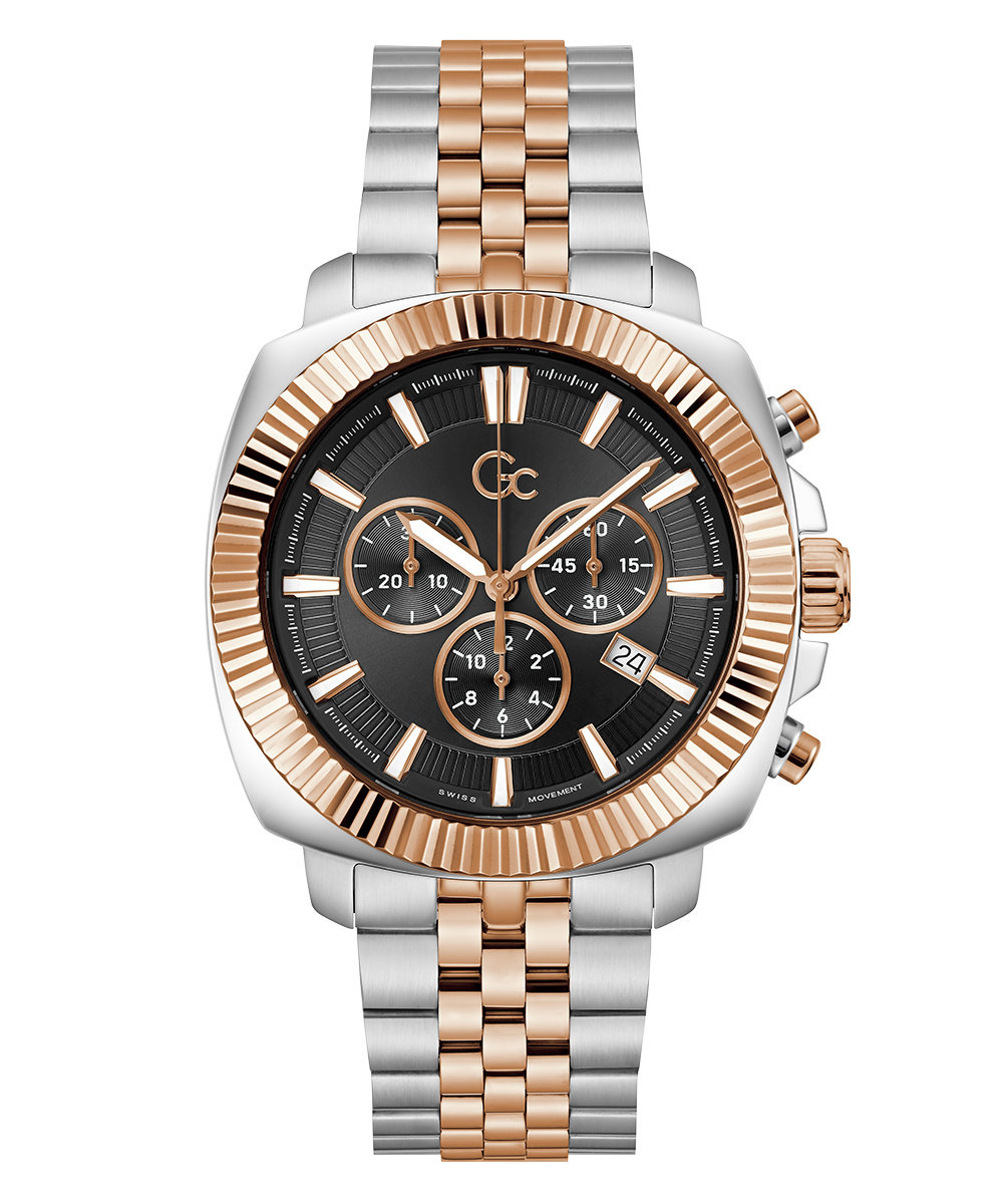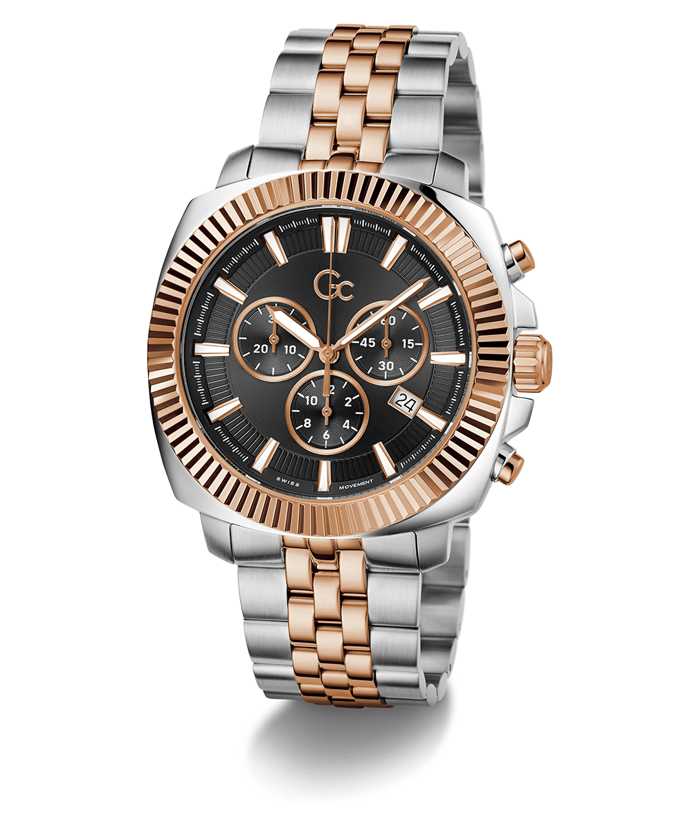 Vintage yet contemporary, the sleek male version of the Gc Flair Coussin stands out. This stylish timepiece features a distinctive notched bezel and a comfortable, supple five-link bracelet. This rose gold and silver two-tone version comes with a deep black sunray dial, showcasing a chronograph movement.
