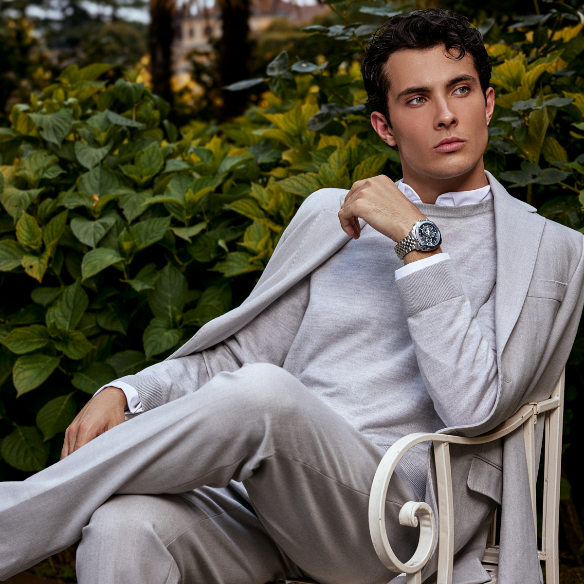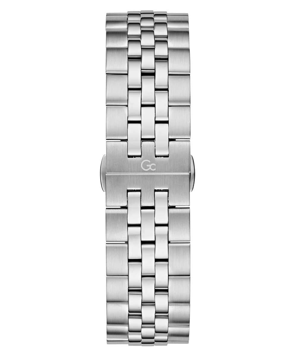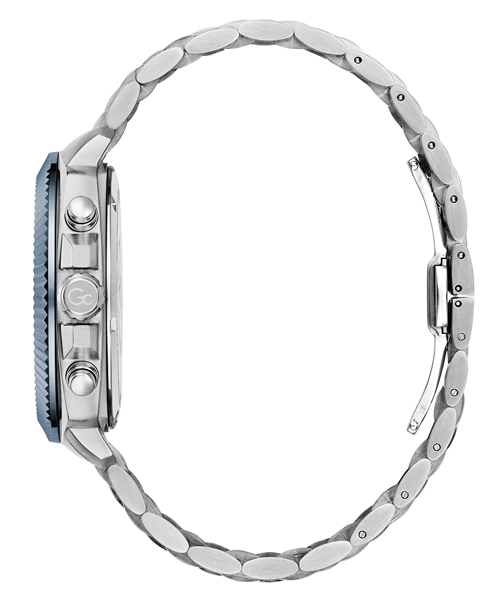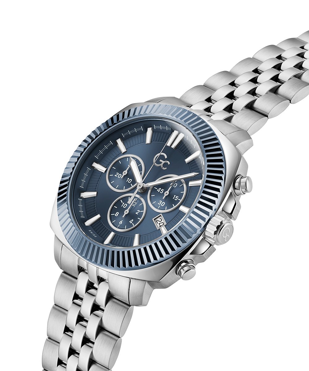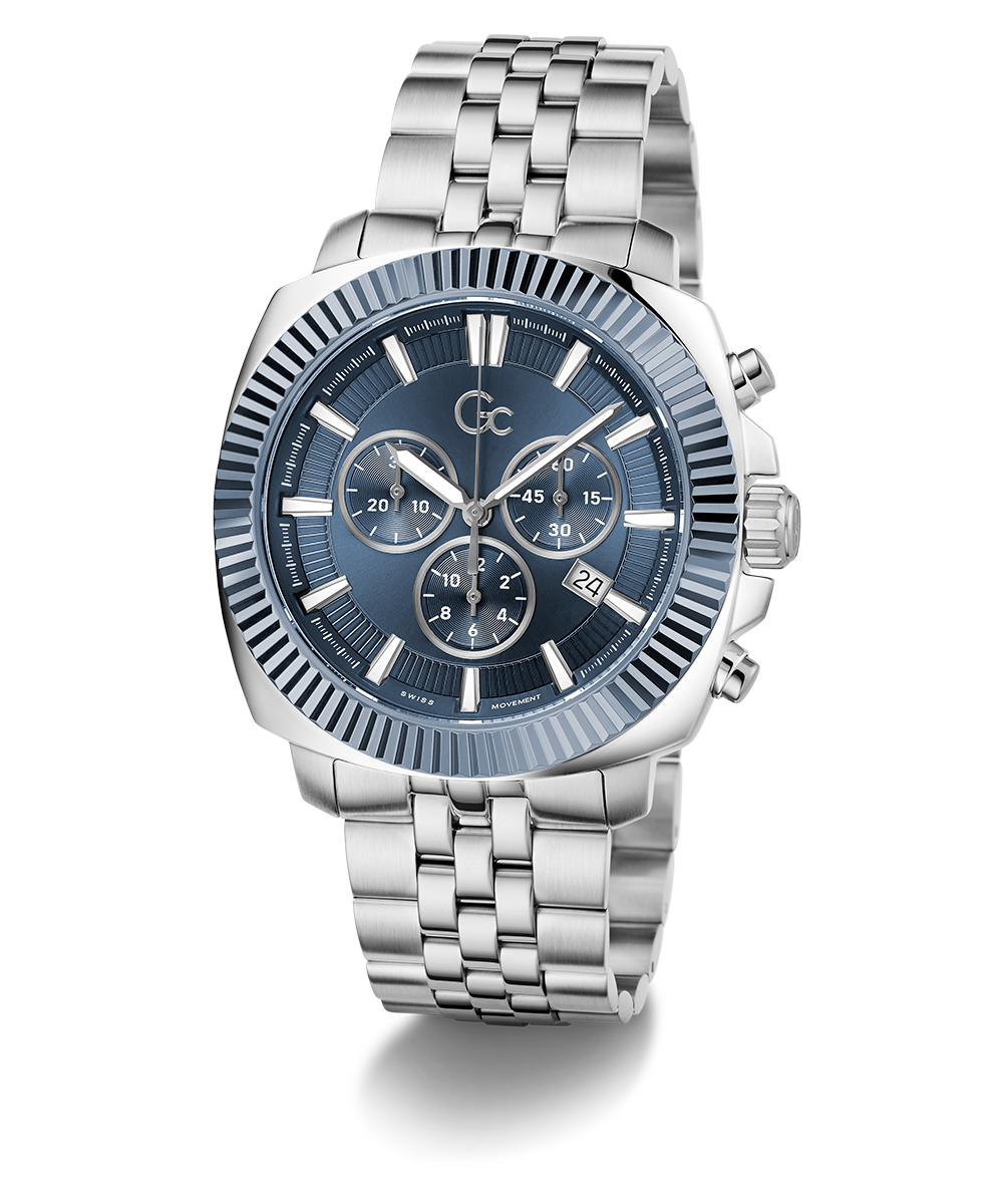 Vintage yet contemporary, the sleek male version of the Gc Flair Coussin stands out. This stylish timepiece features a distinctive notched bezel and a comfortable, supple five-link bracelet. This silver tone version comes with a stunning stone blue PVD top ring and matching deep sunray dial, showcasing a chronograph movement.