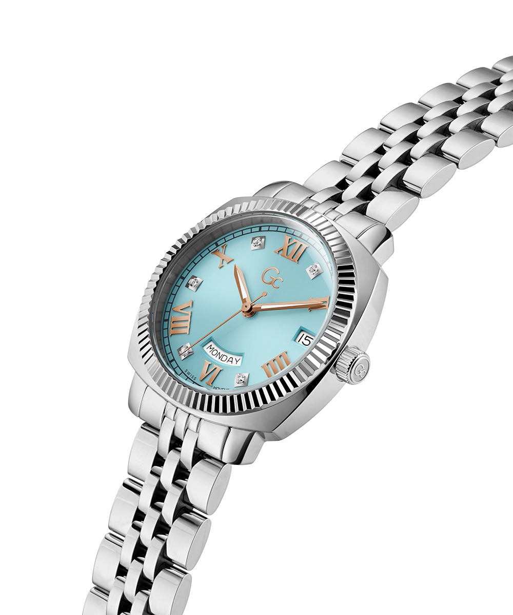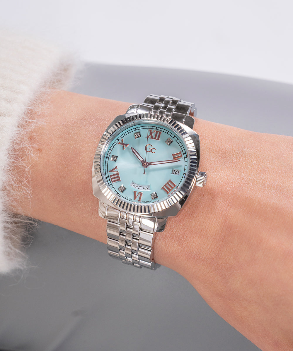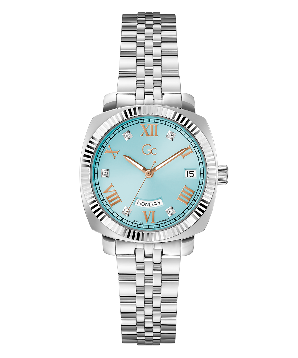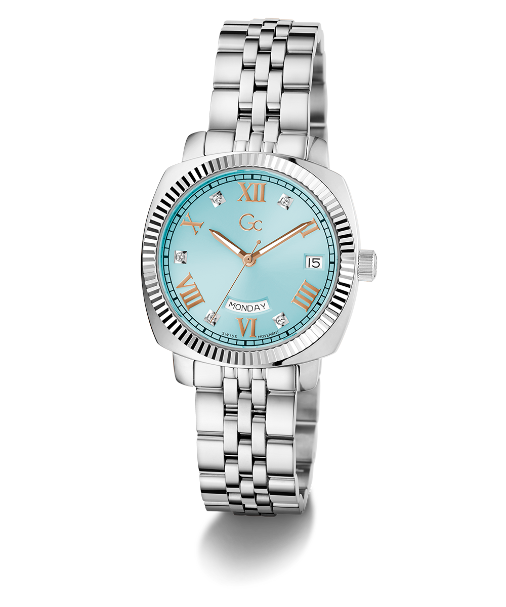 Add a touch of refinement to your everyday wardrobe with the Gc Flair, now offered in a cushion shape. This stylish timepiece features a distinctive notched bezel and a comfortable, supple five-link bracelet. The silver tone version comes with a trendy eye-catching aqua blue sunray dial, showcasing a visible day-date Swiss movement through windows at 3 and 6 o'clock.