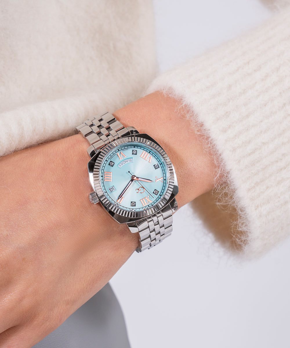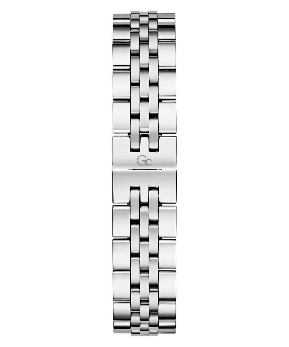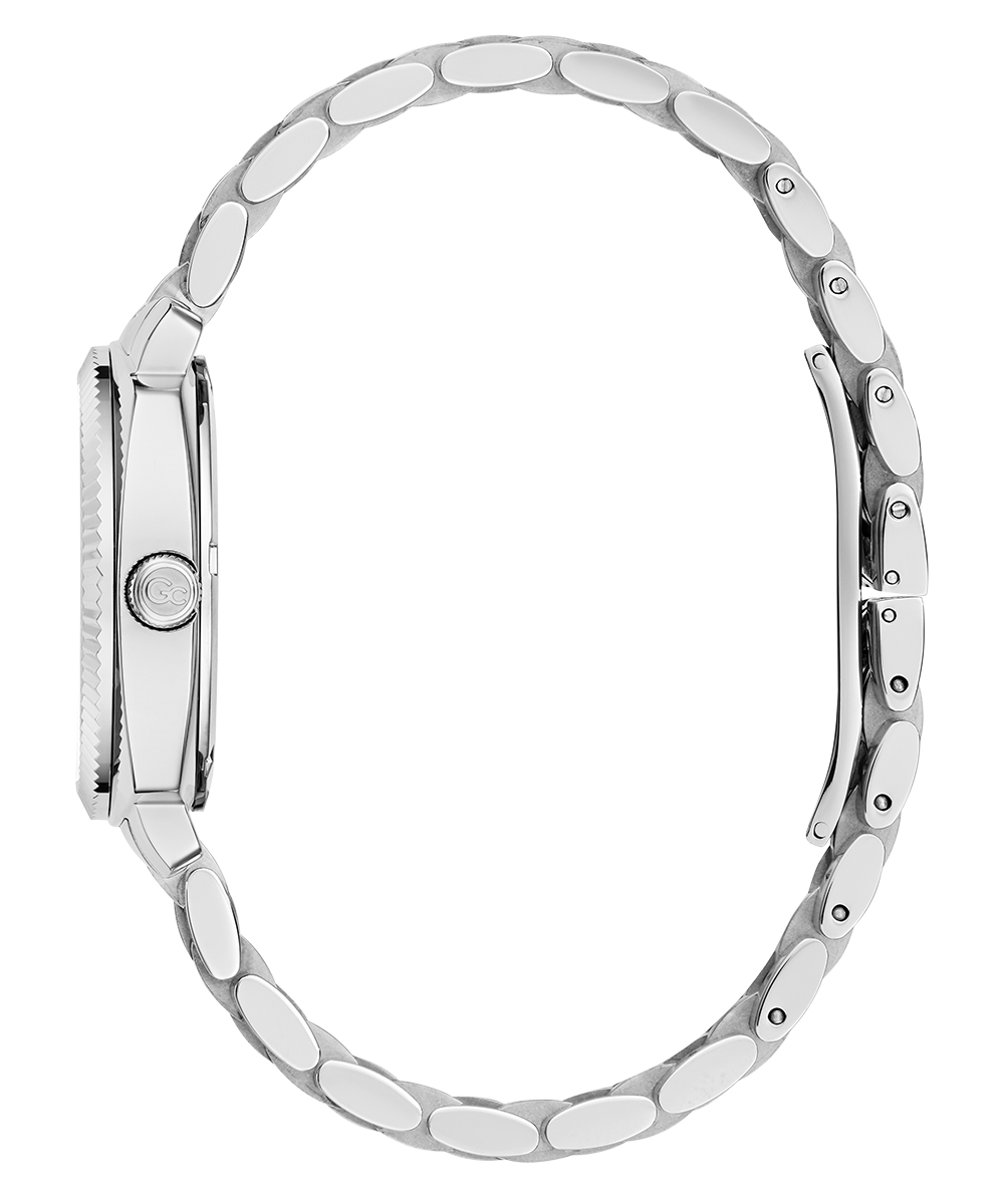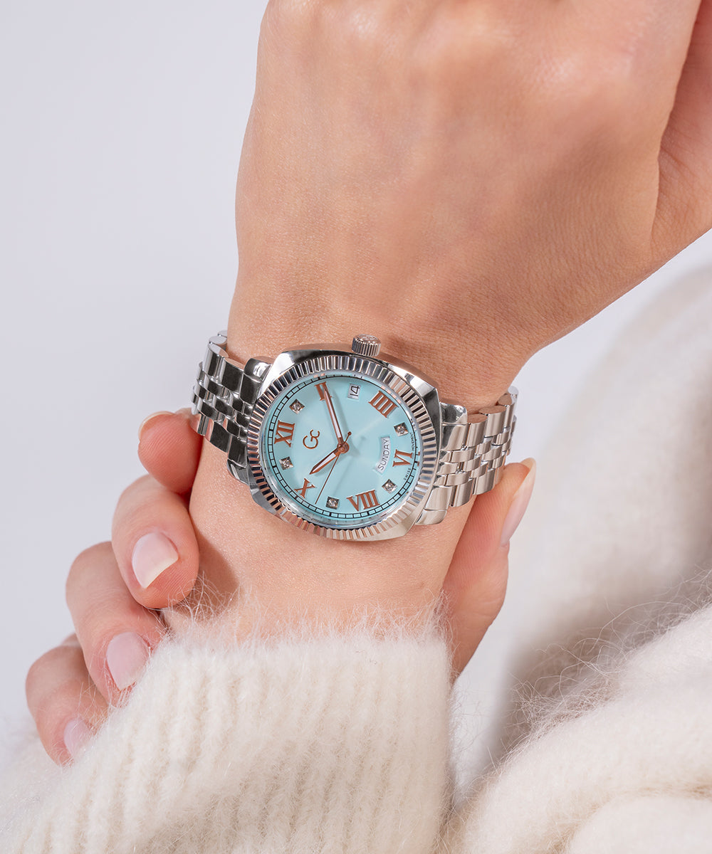 Add a touch of refinement to your everyday wardrobe with the Gc Flair, now offered in a cushion shape. This stylish timepiece features a distinctive notched bezel and a comfortable, supple five-link bracelet. The silver tone version comes with a trendy eye-catching aqua blue sunray dial, showcasing a visible day-date Swiss movement through windows at 3 and 6 o'clock.
