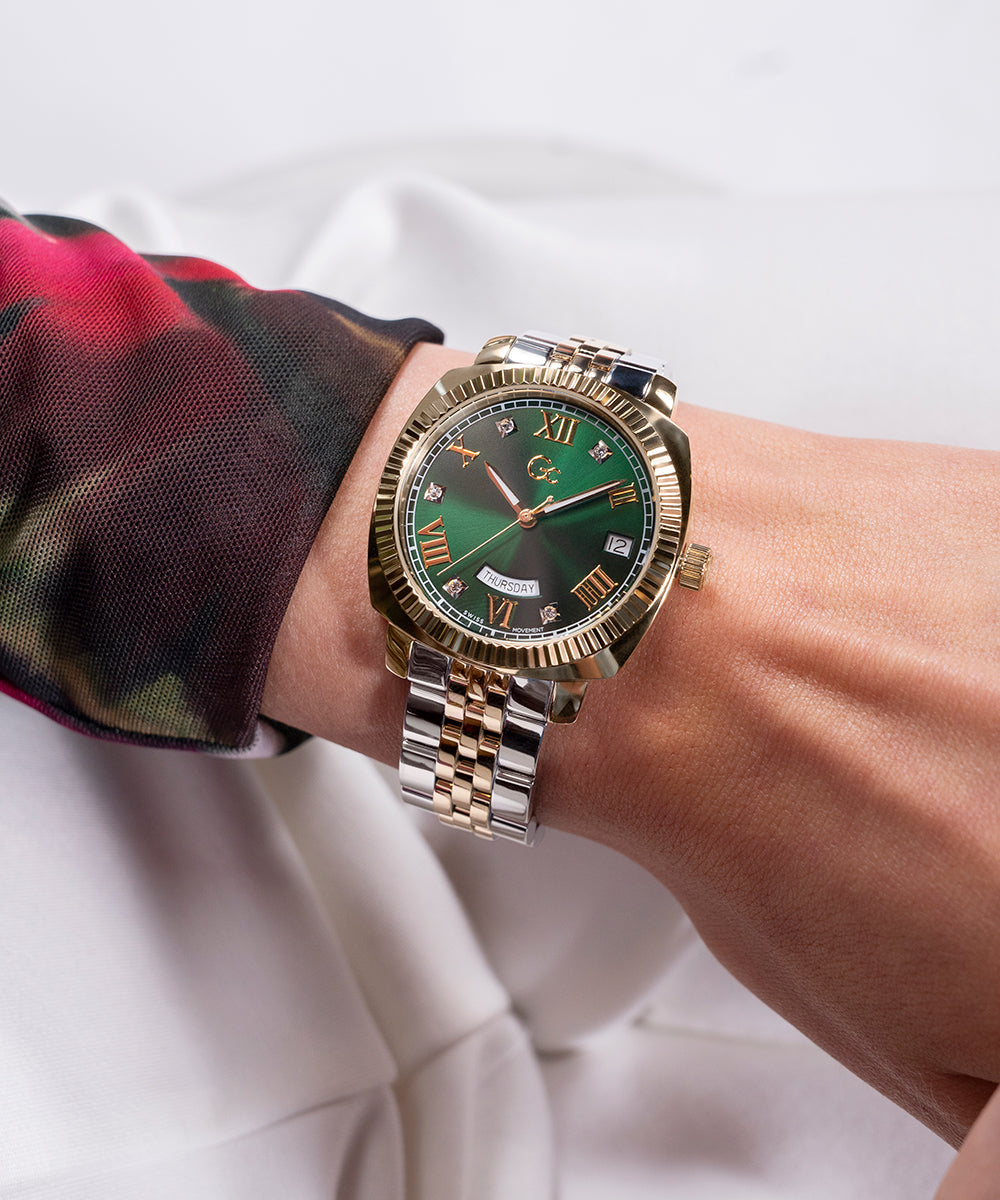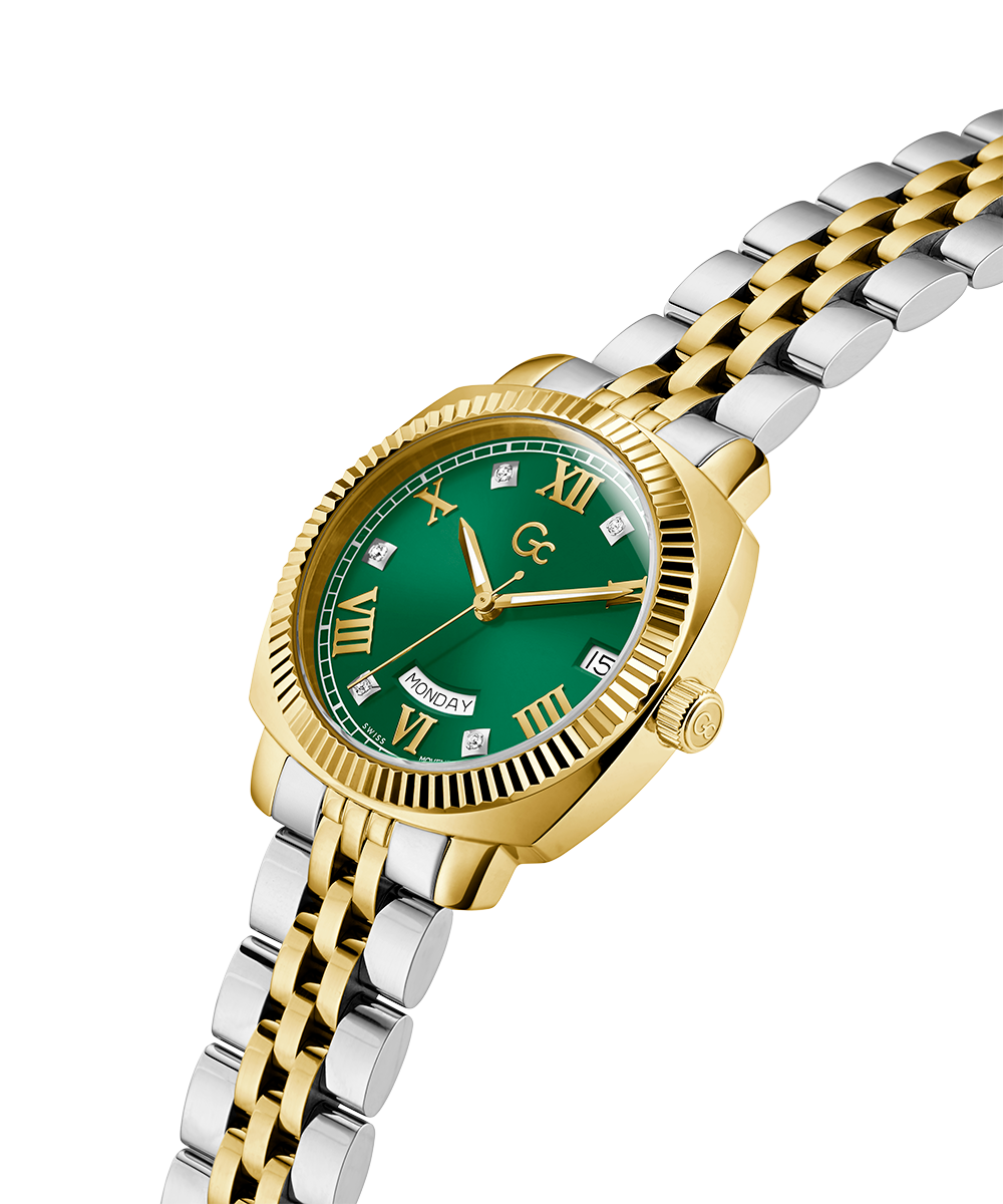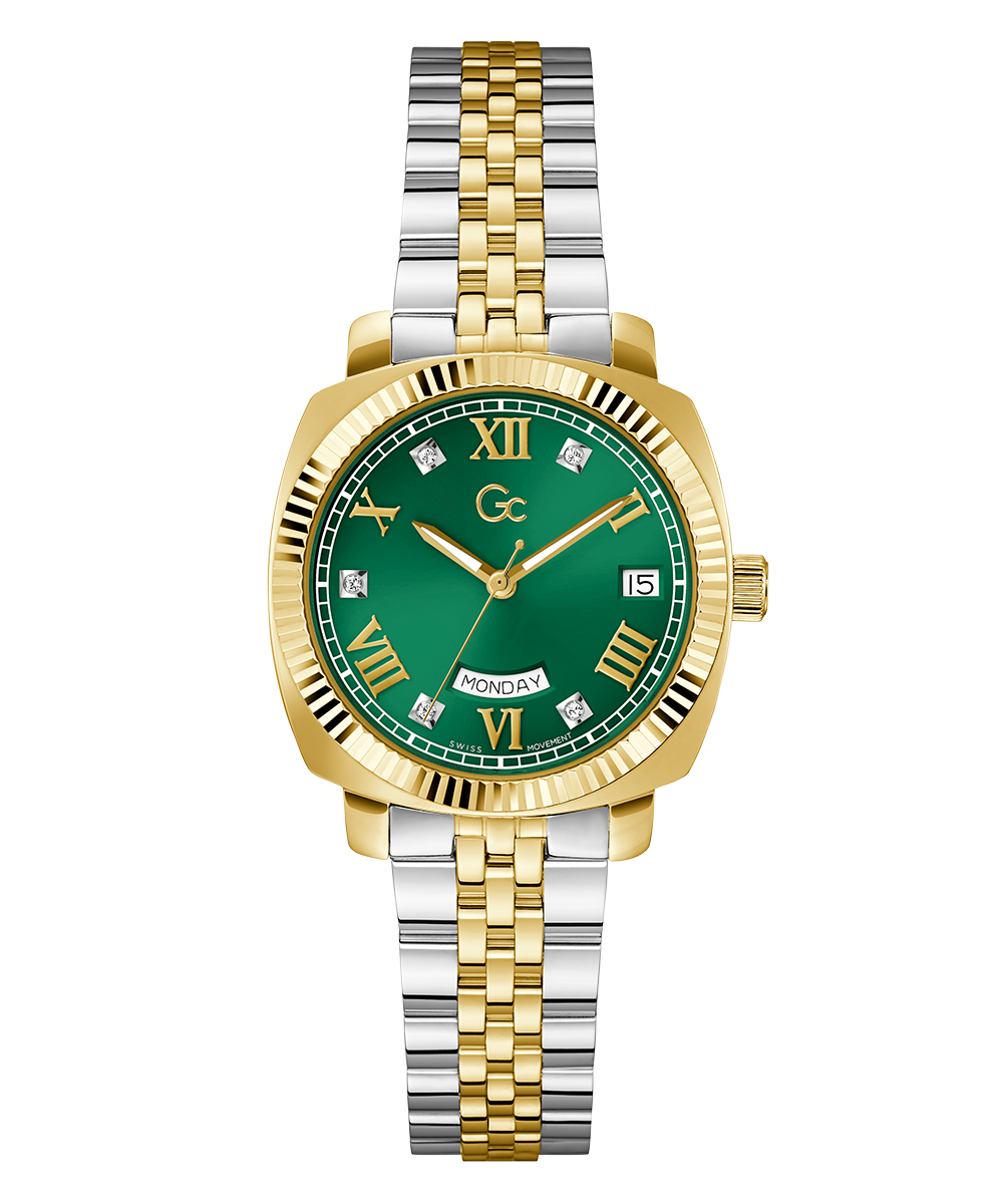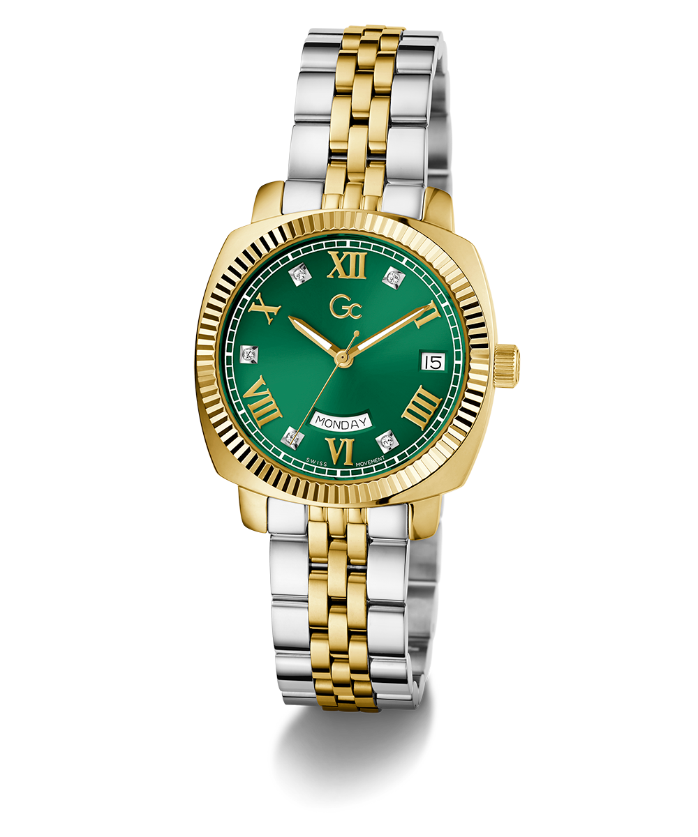 Add a touch of refinement to your everyday wardrobe with the Gc Flair, now offered in a cushion shape. This stylish timepiece features a distinctive notched bezel and a comfortable, supple five-link bracelet. The yellow gold and silver two-tone version comes with a fashion emerald green sunray dial, showcasing a...