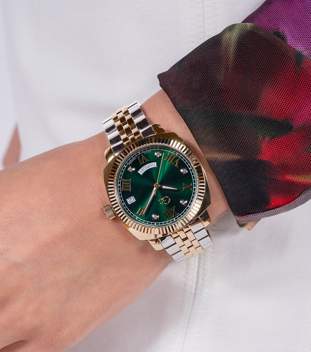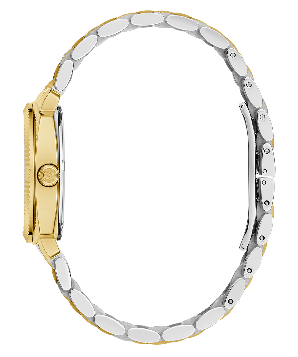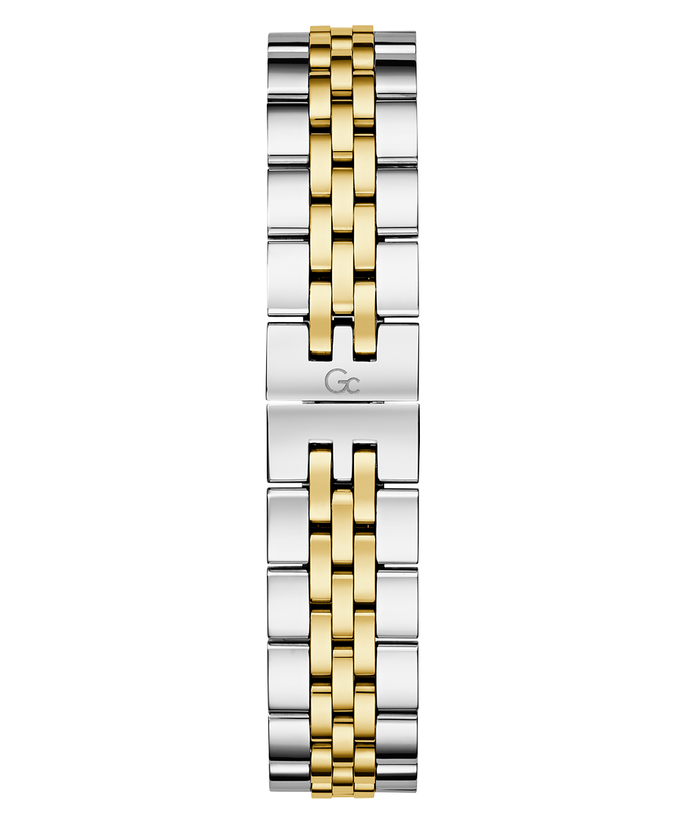 Add a touch of refinement to your everyday wardrobe with the Gc Flair, now offered in a cushion shape. This stylish timepiece features a distinctive notched bezel and a comfortable, supple five-link bracelet. The yellow gold and silver two-tone version comes with a fashion emerald green sunray dial, showcasing a...