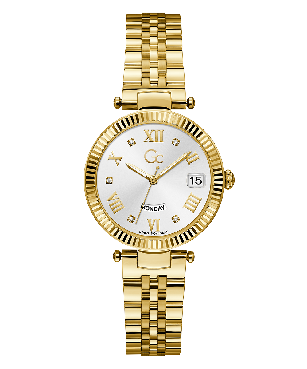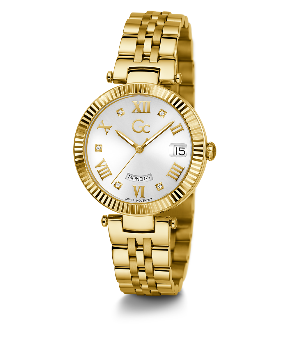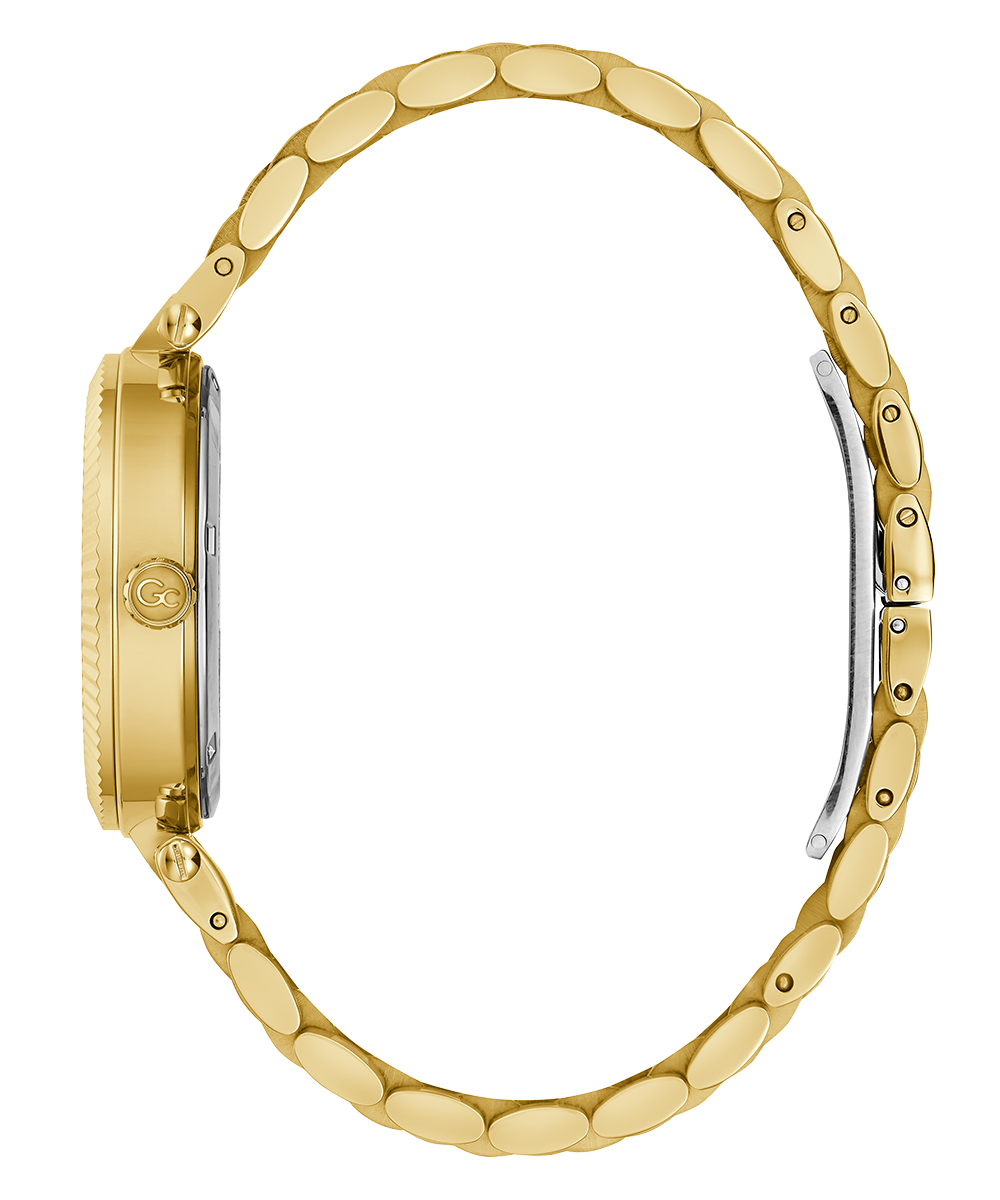 Add a touch of refinement to your everyday wardrobe with the Gc Flair. It has a distinctive notched bezel and a comfortable, supple five links bracelet and, for all yellow gold tone version, an eye-catching sunray white dial with a visible day date swiss movement through windows at 3 and...