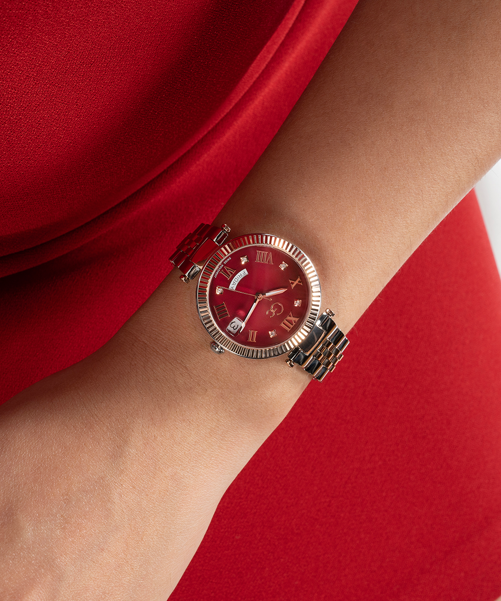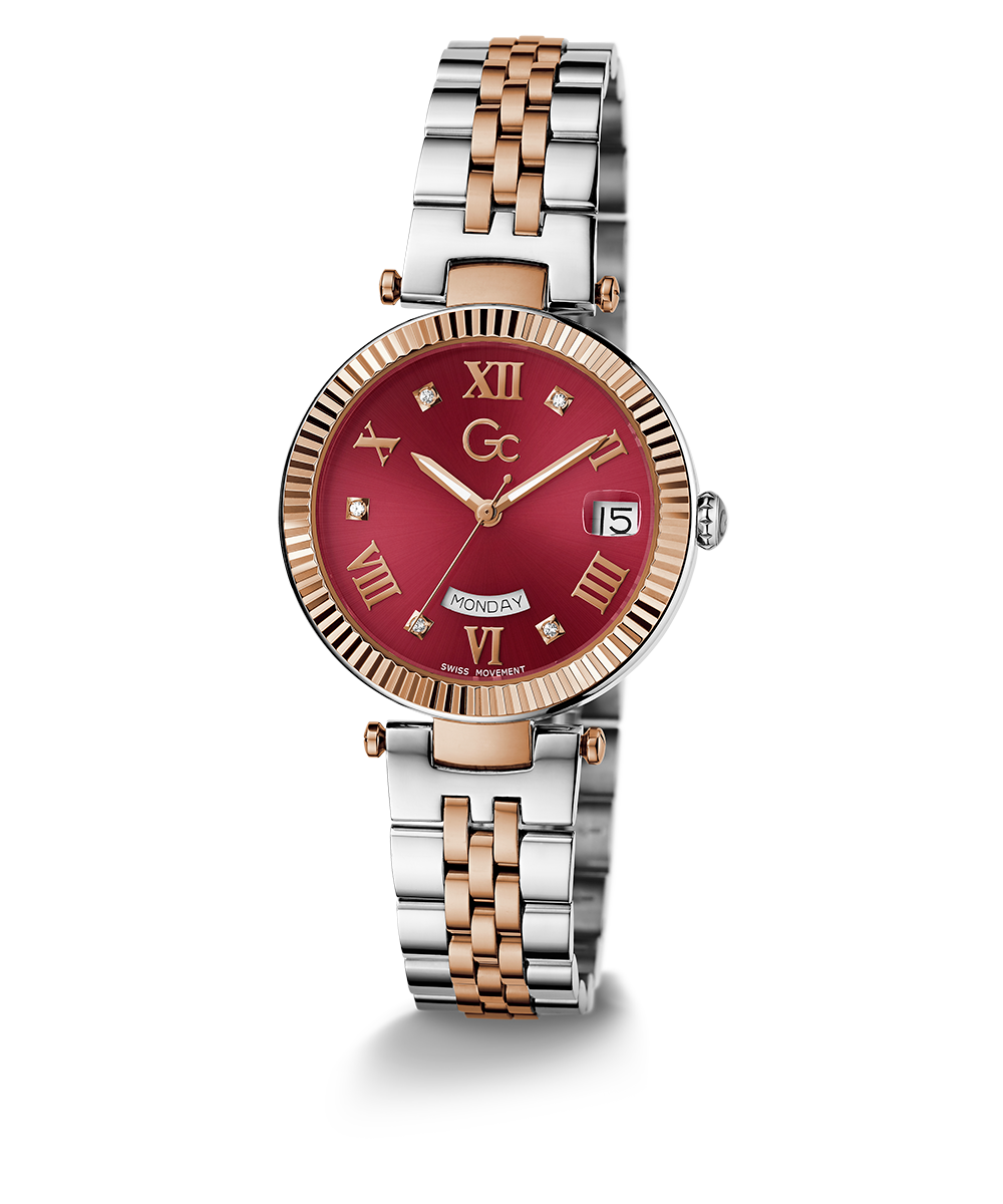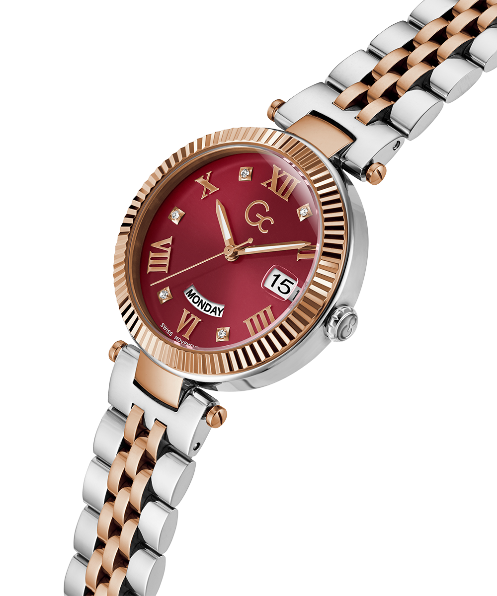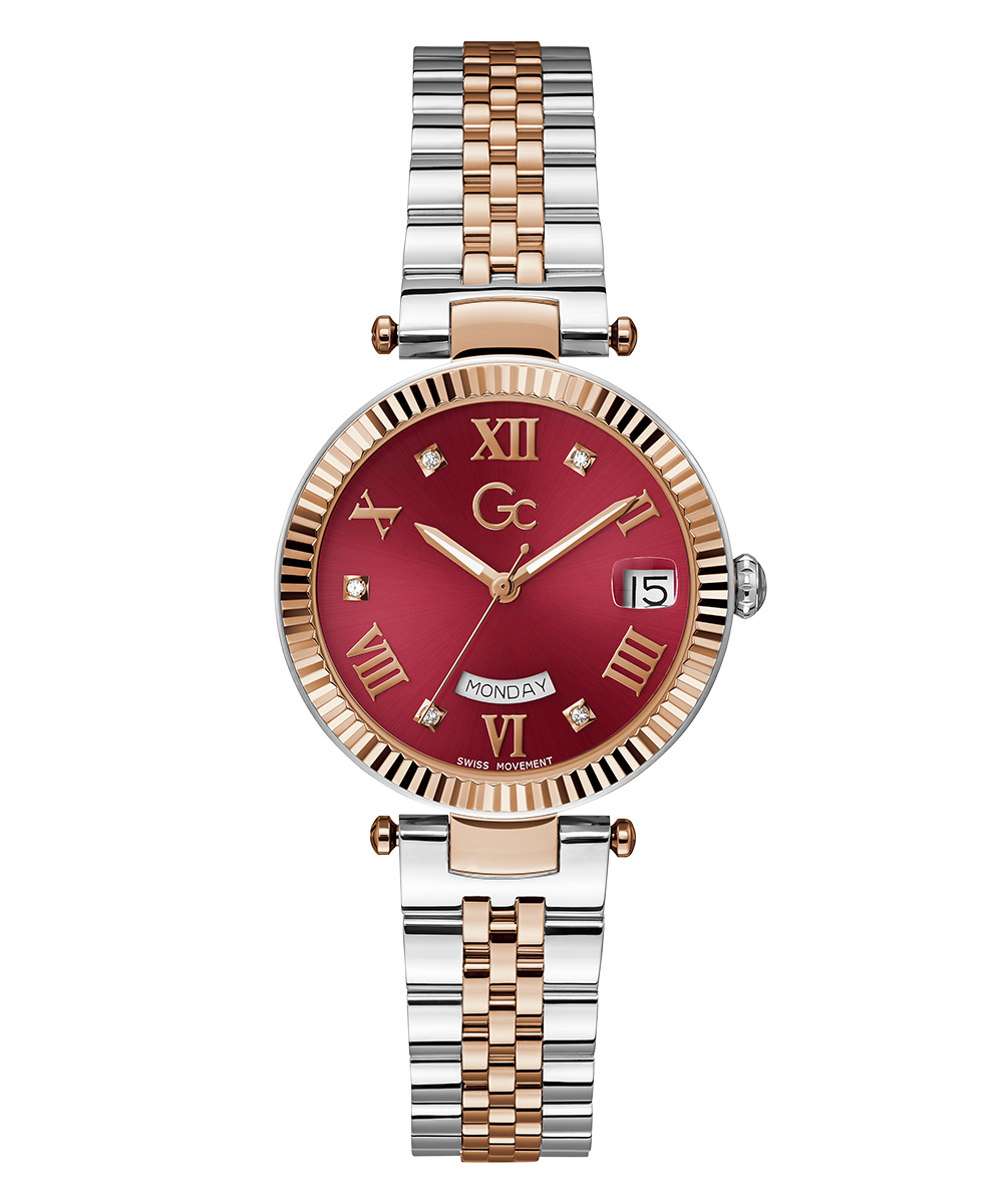 Add a touch of refinement to your everyday wardrobe with the Gc Flair. It has a distinctive notched bezel and a comfortable, supple five links bracelet and, for this rose gold and silver two-tone version, an eye-catching berry red sunray dial, with a visible day date swiss movement through windows at 3 and 6 o'clock.