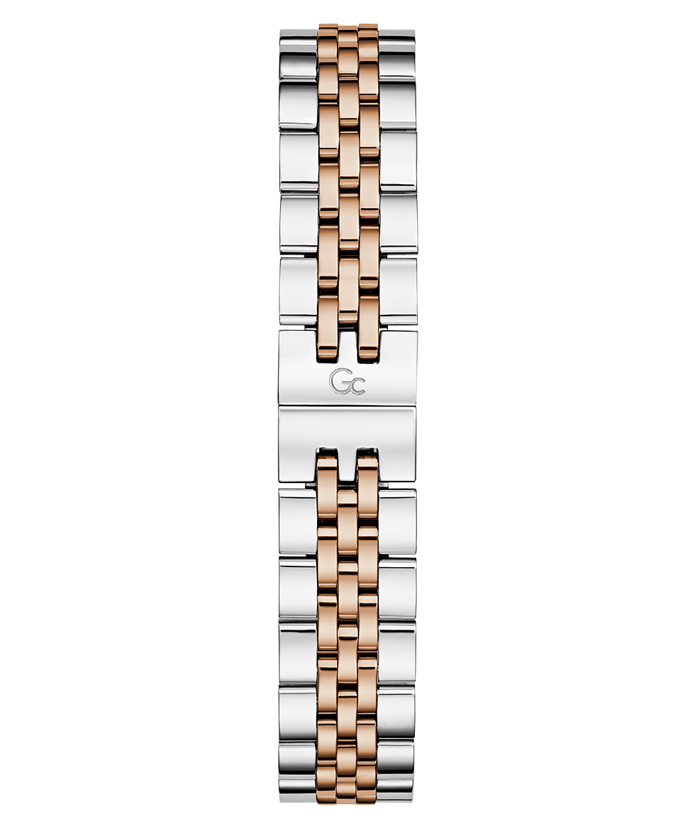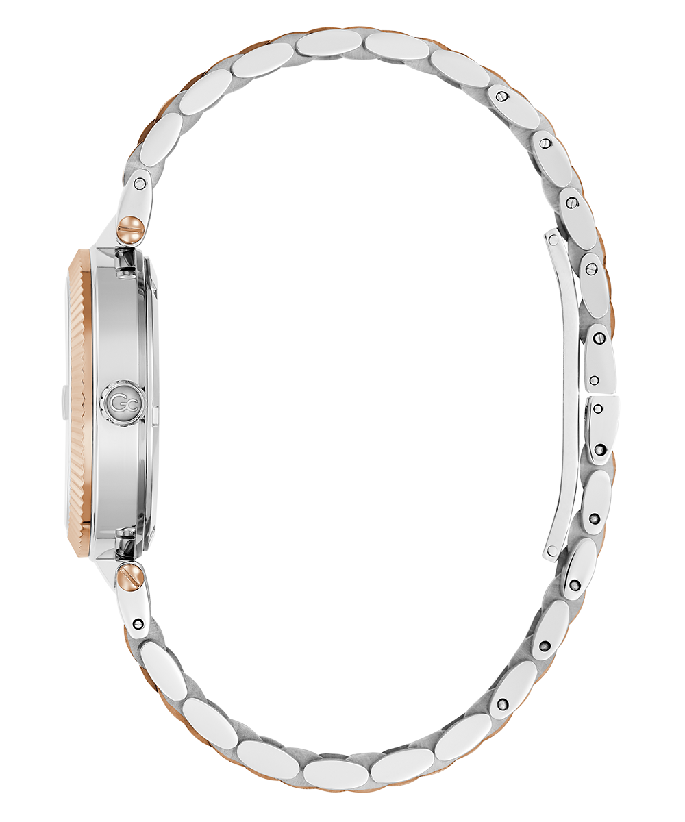 Add a touch of refinement to your everyday wardrobe with the Gc Flair. It has a distinctive notched bezel and a comfortable, supple five links bracelet and, for this rose gold and silver two-tone version, an eye-catching berry red sunray dial, with a visible day date swiss movement through windows...