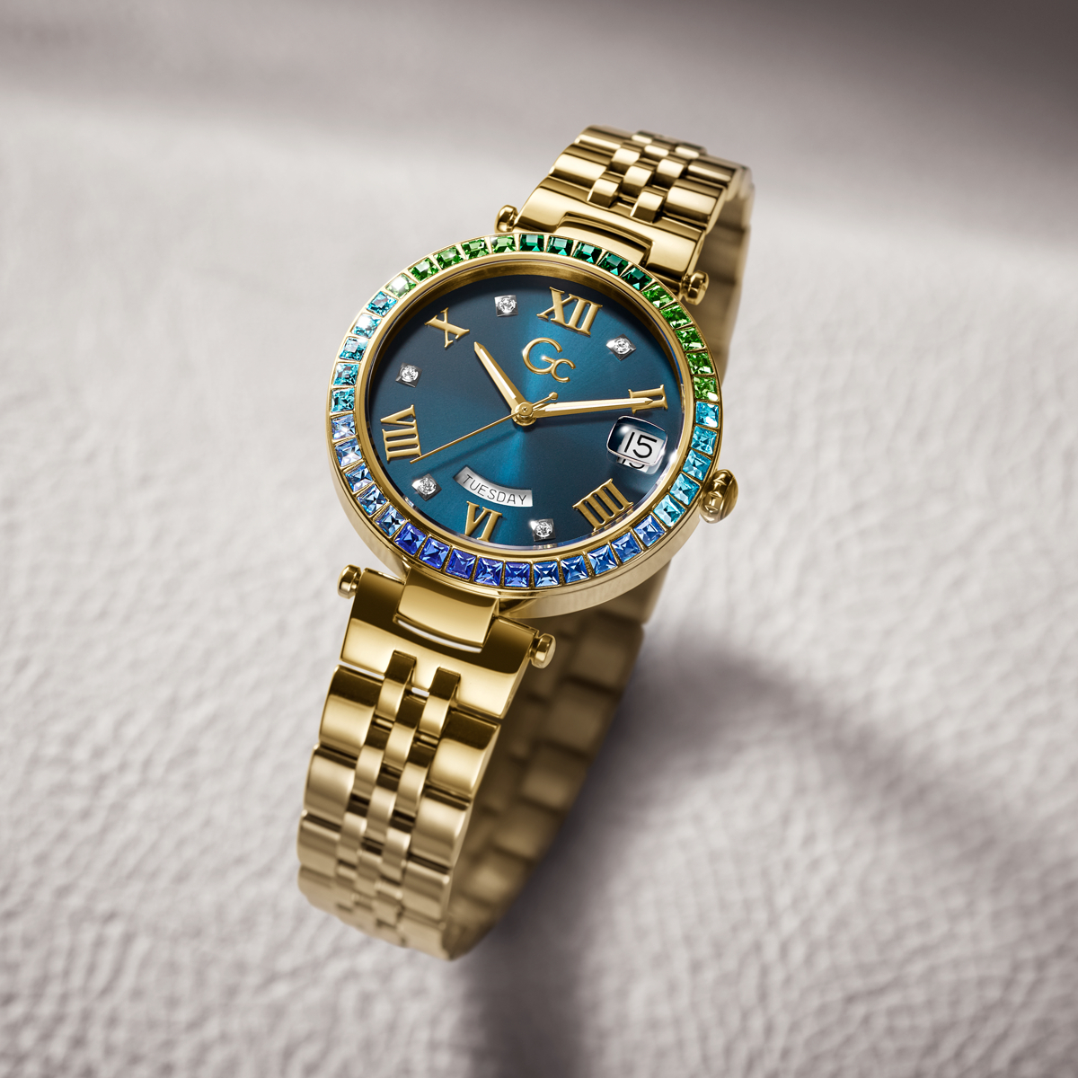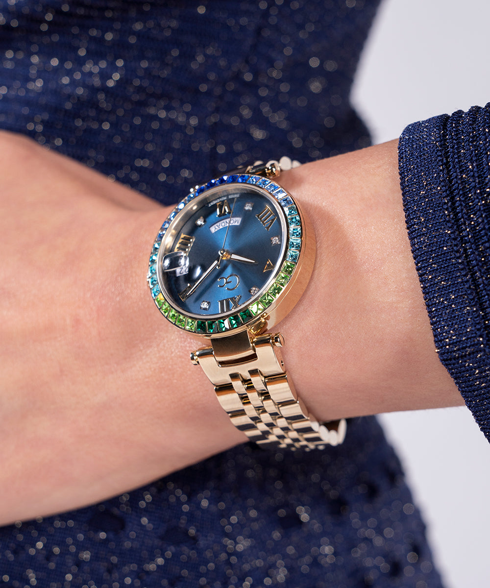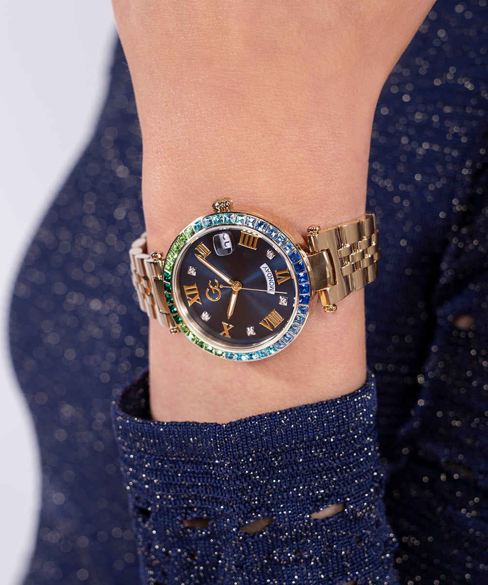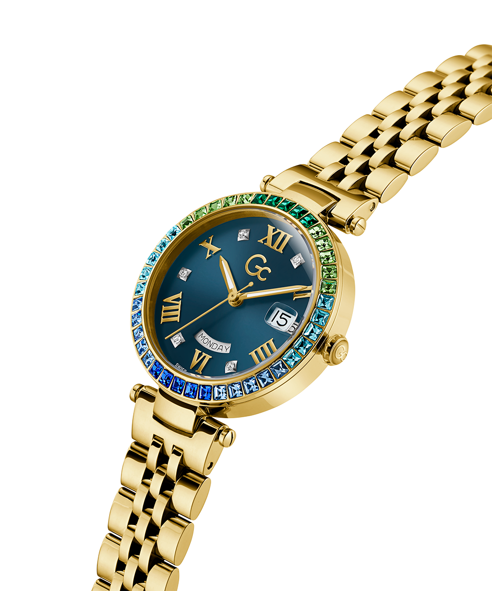 The Gc Flair (34mm) goes glamorously exotic in this yellow gold PVD version, featuring a superb set of peacock green and blue crystals on the top ring and a deep midnight blue sunray dial. The day and date are visible through the windows at 3 and 6 o’clock.