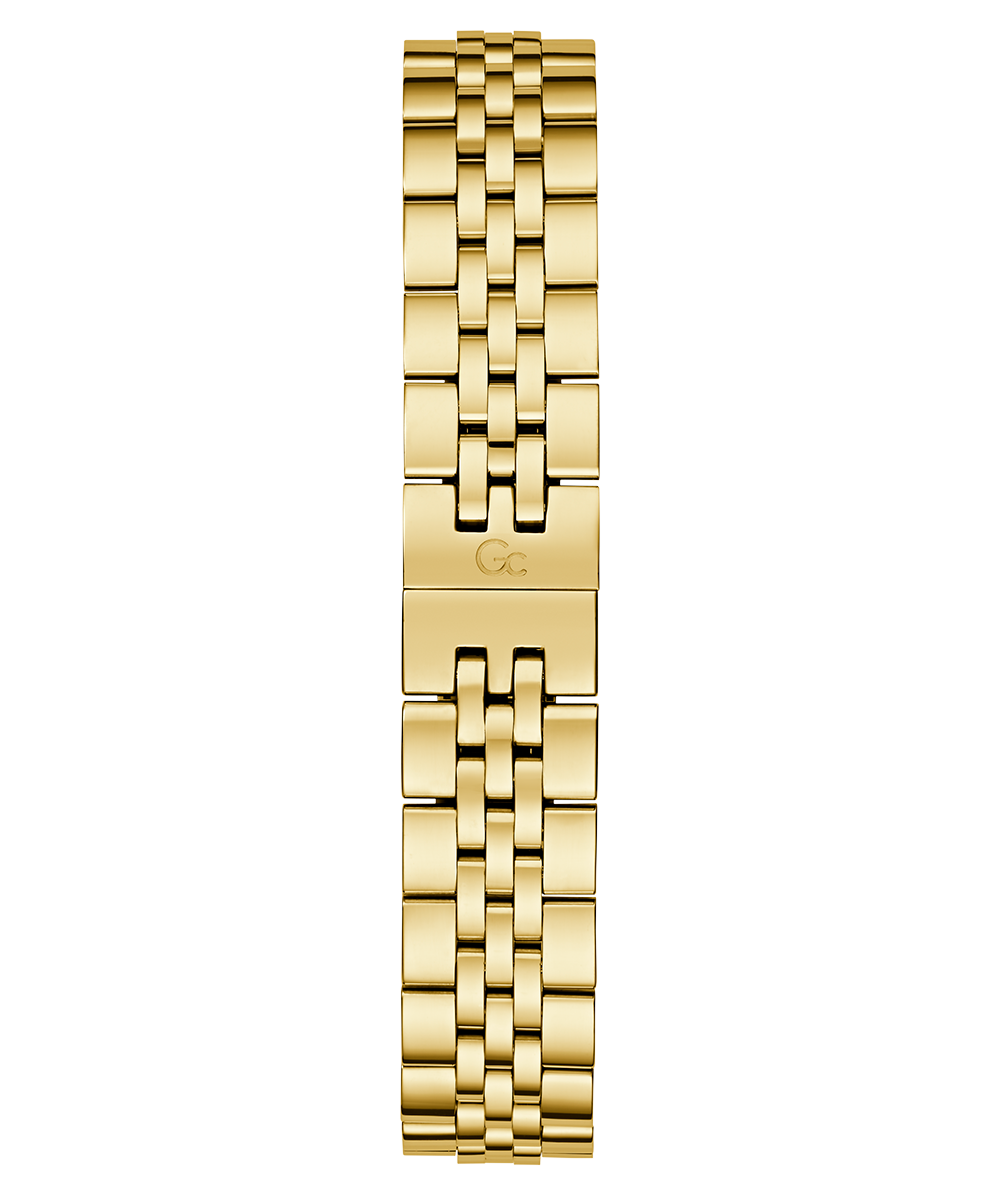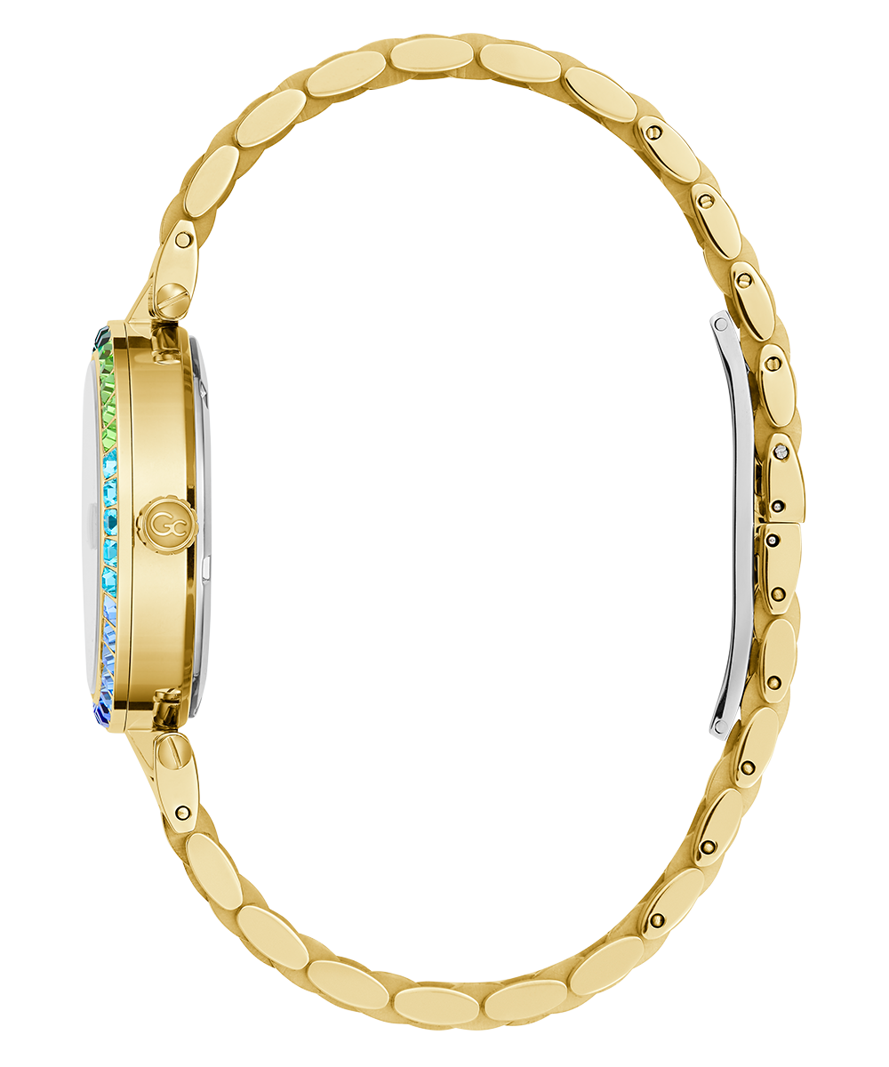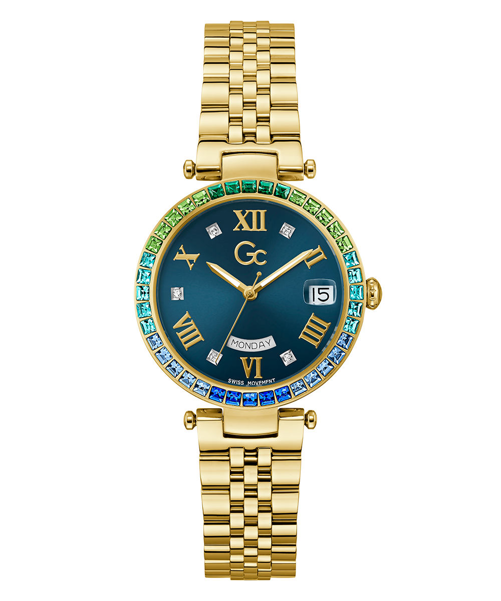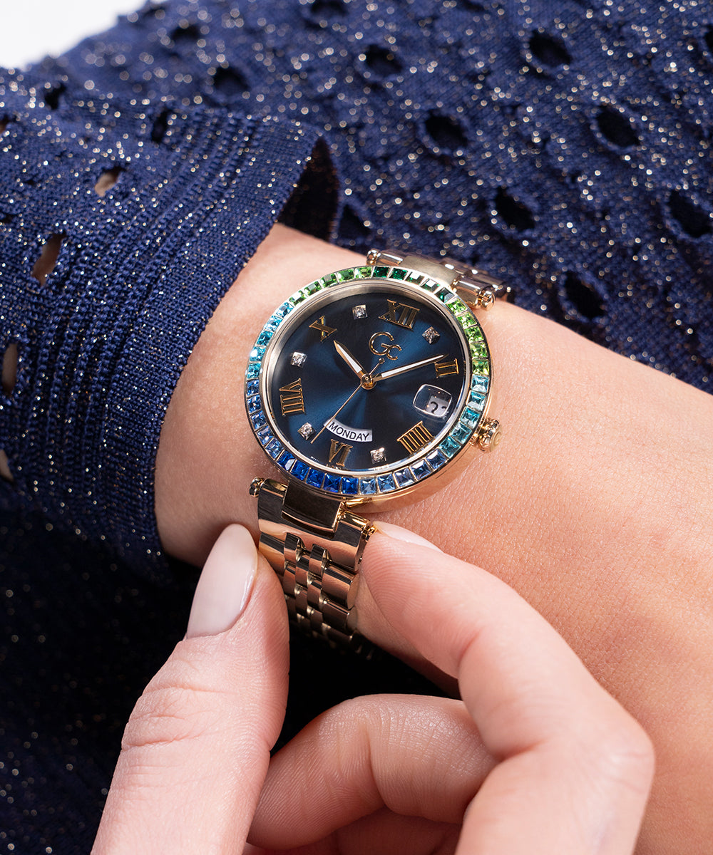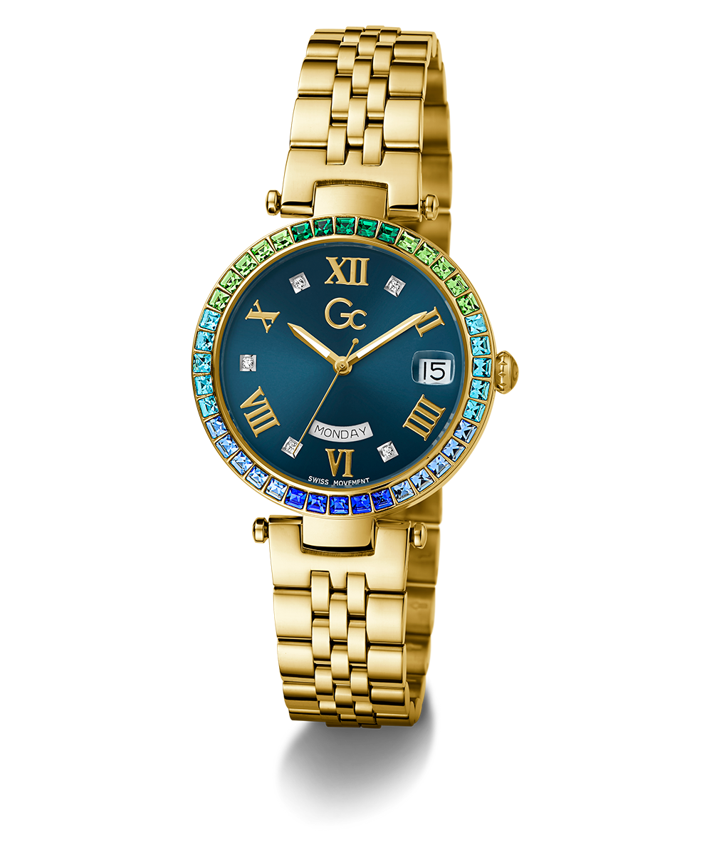 The Gc Flair (34mm) goes glamorously exotic in this yellow gold PVD version, featuring a superb set of peacock green and blue crystals on the top ring and a deep midnight blue sunray dial. The day and date are visible through the windows at 3 and 6 o’clock.