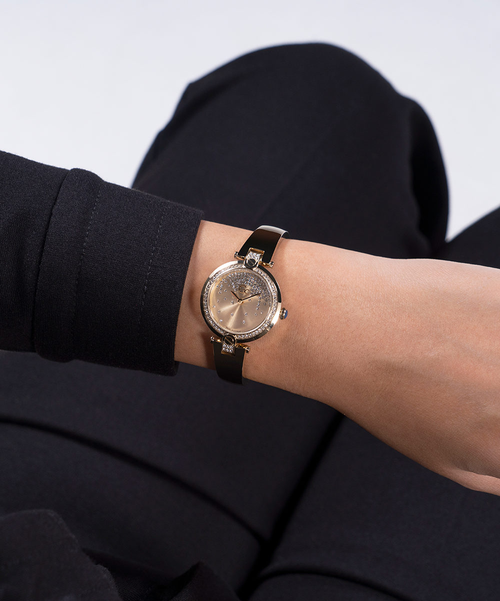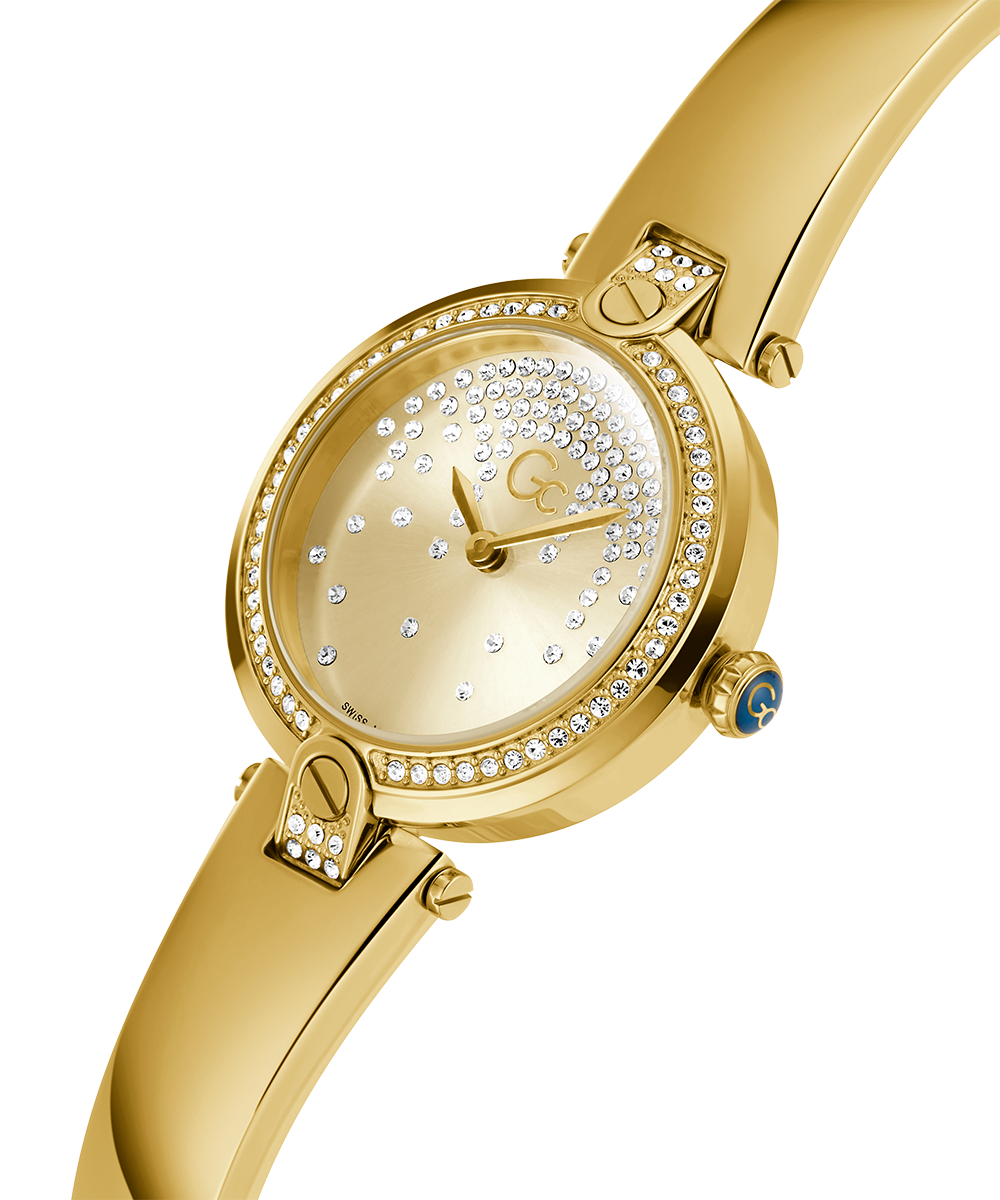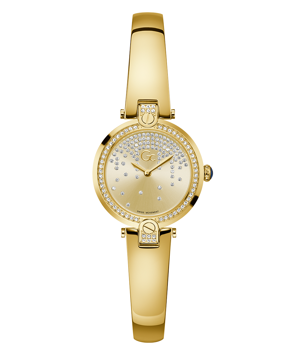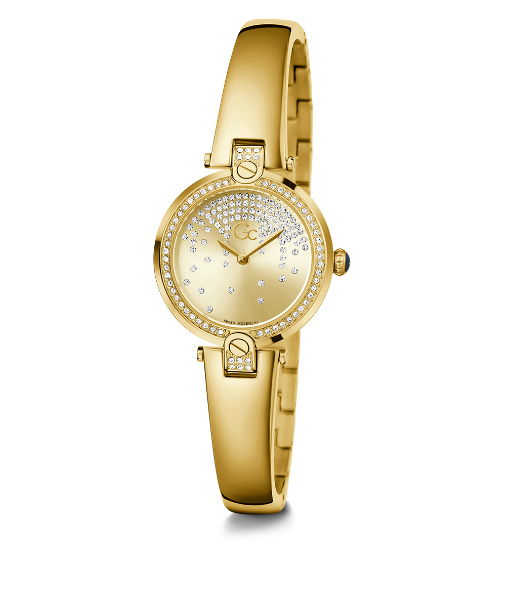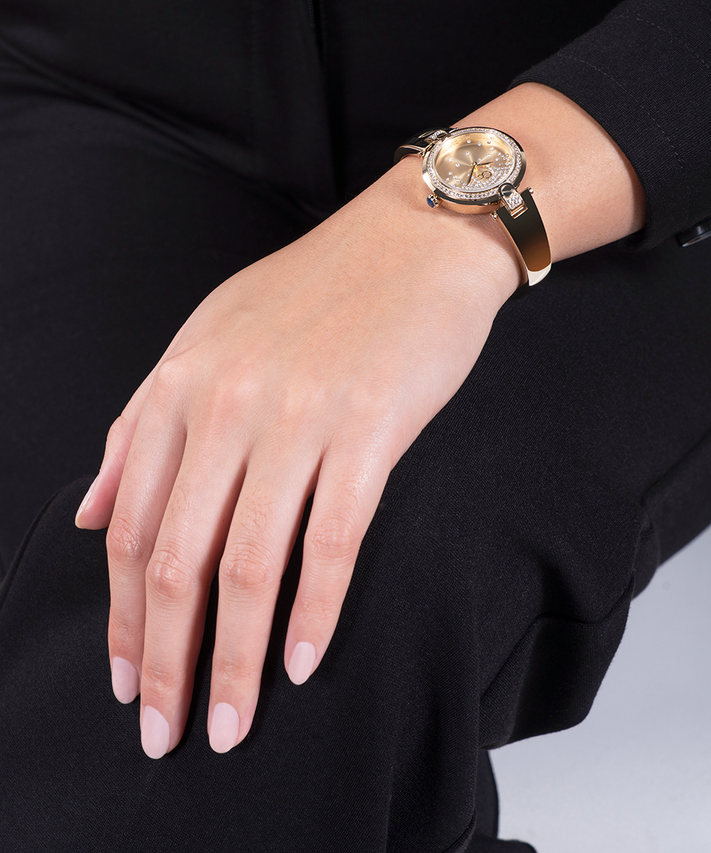 Love the Bangle in style, with this glamourous Fusion yellow gold watch highlighted by a crystal row on the bezel. This stylish accessory have champagne sunray dial, with crystal shower for a more jewelry feeling.
