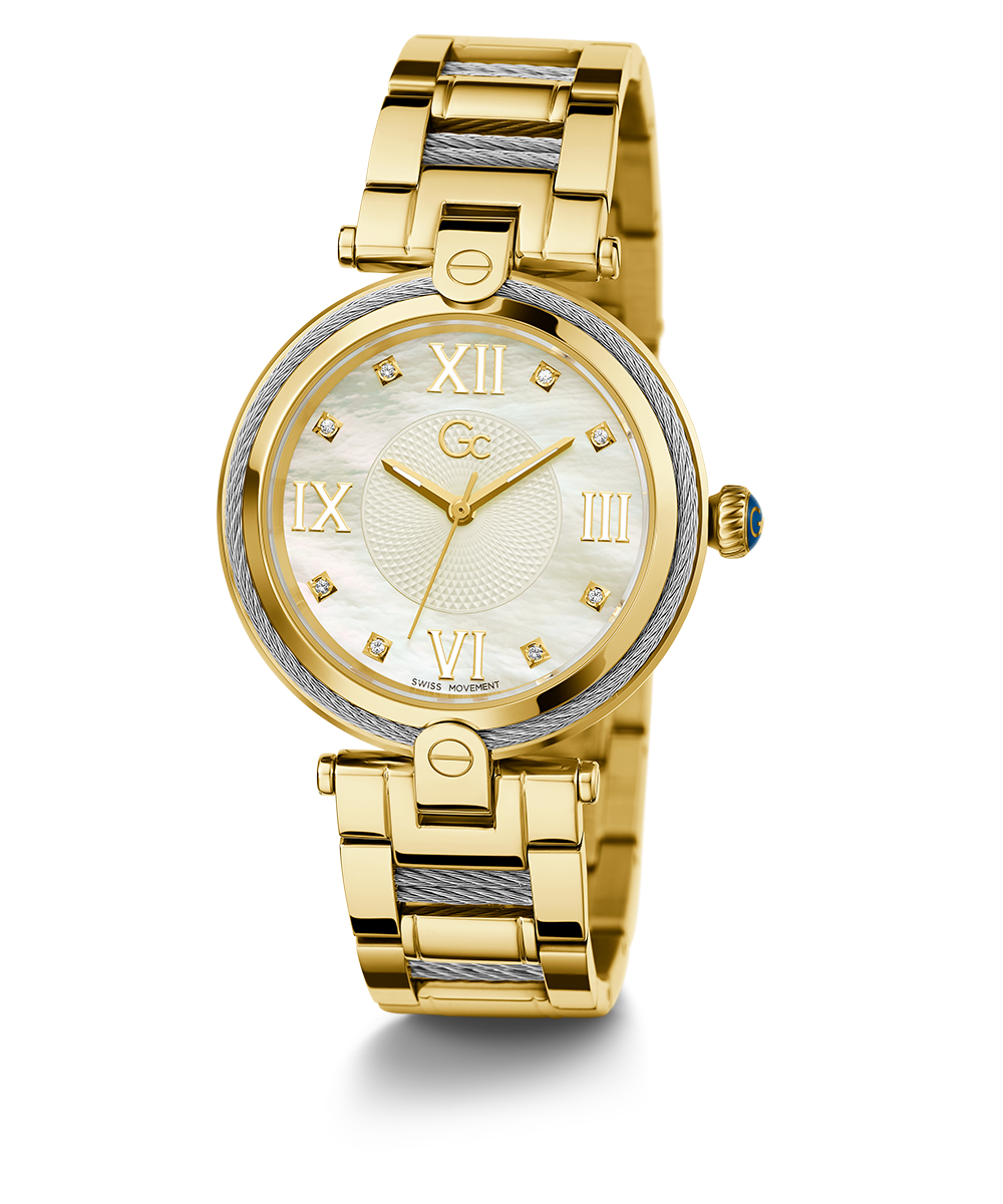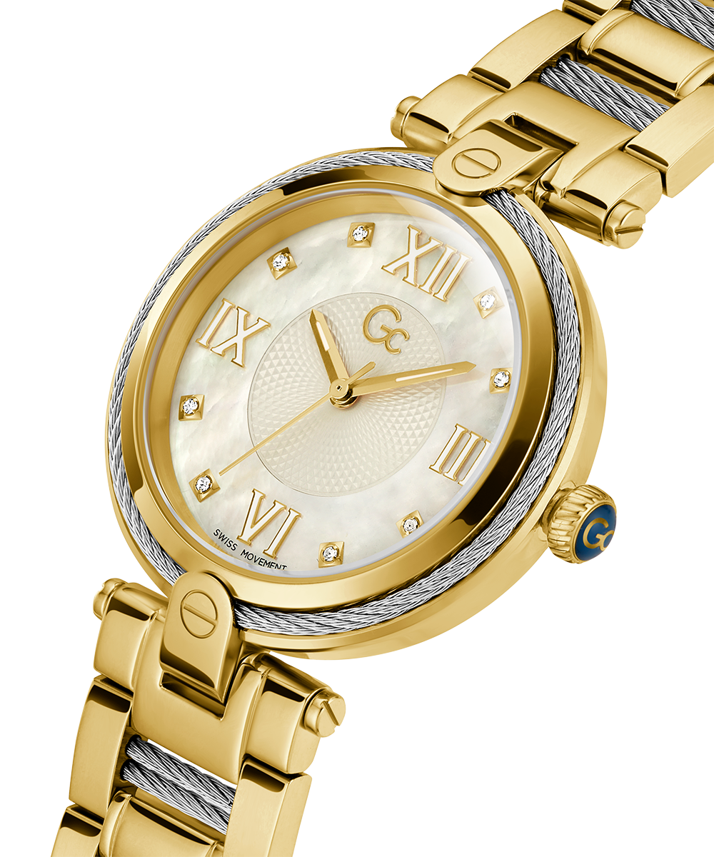 Don’t resist the charm of the Gc FUSION and its new declination enhanced with glittering cable details on bezel and bracelet. The elegant white mother of pearl dial is set with crystals on the indices and roman numbers at 3, 6, 9 and 12 o’clock, perfectly matching the full yellow...