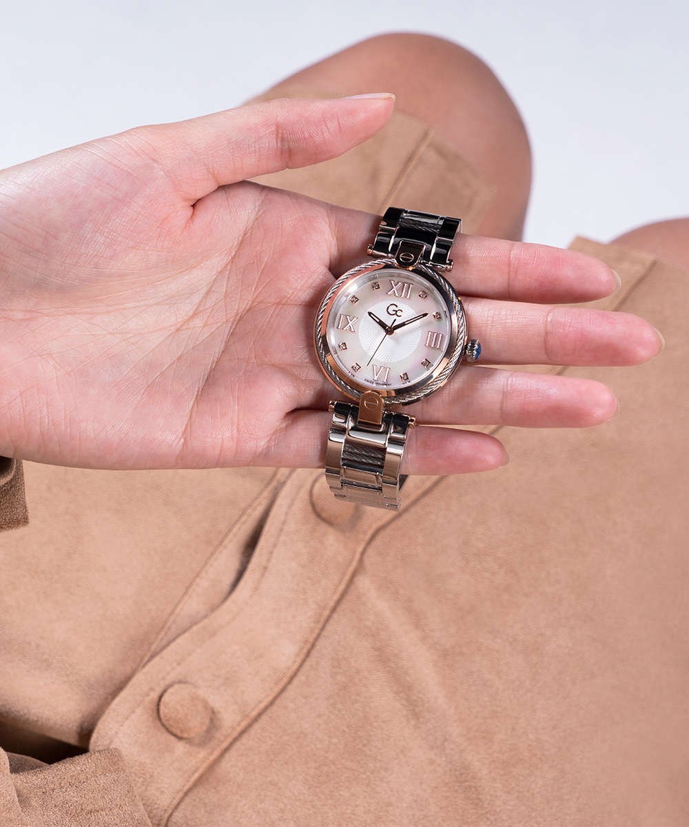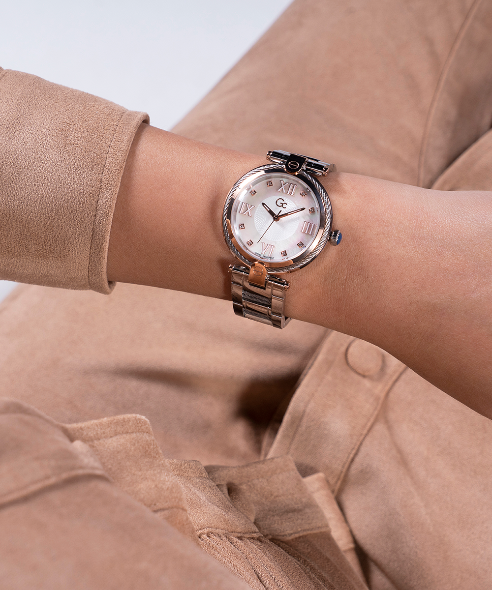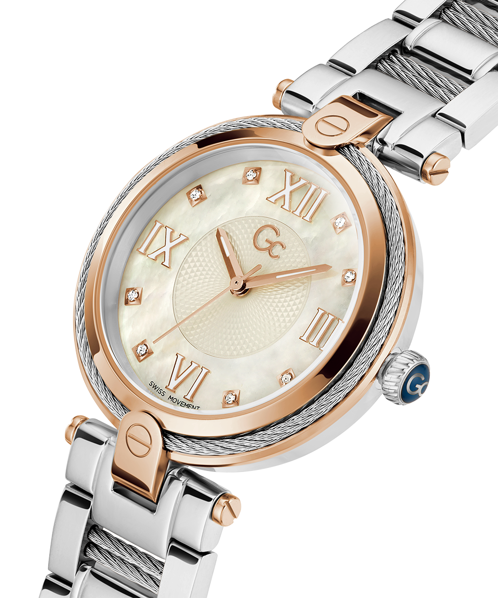 Don’t resist the charm of the Gc FUSION and its new declination enhanced with glittering cable details on bezel and bracelet. The elegant white mother of pearl dial is set with crystals on the indices and roman numbers at 3, 6, 9 and 12 o’clock, perfectly matching both the rose...