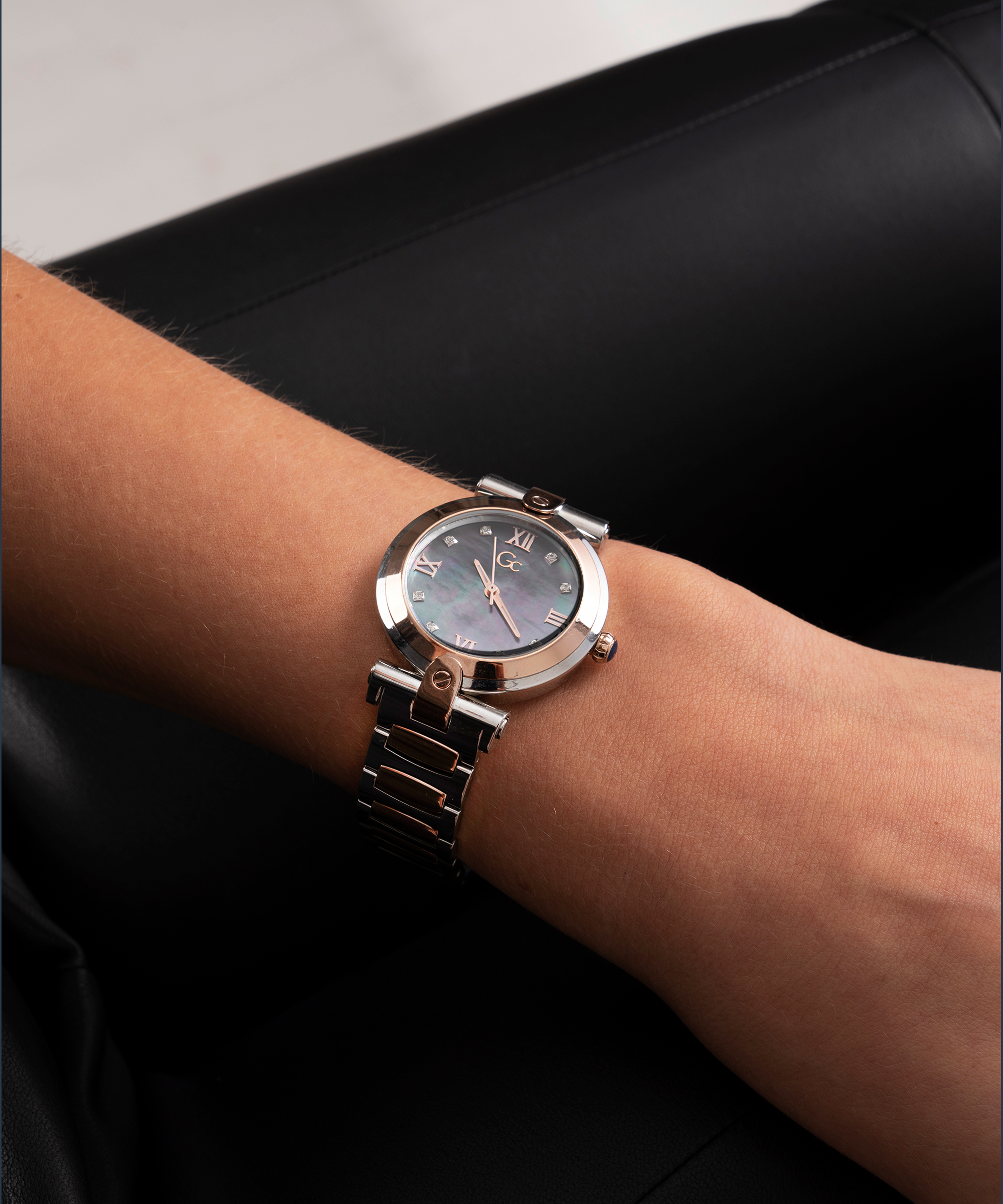 Don’t resist the charm of the Gc FUSION The slim 34mm case for the large version makes the Gc FUSION and its new Iconic T-bar attachment the new Gc watches effigy.The grey elegant mother of pearl dial is set with crystals on the indices and roman numbers at 3, 6,...