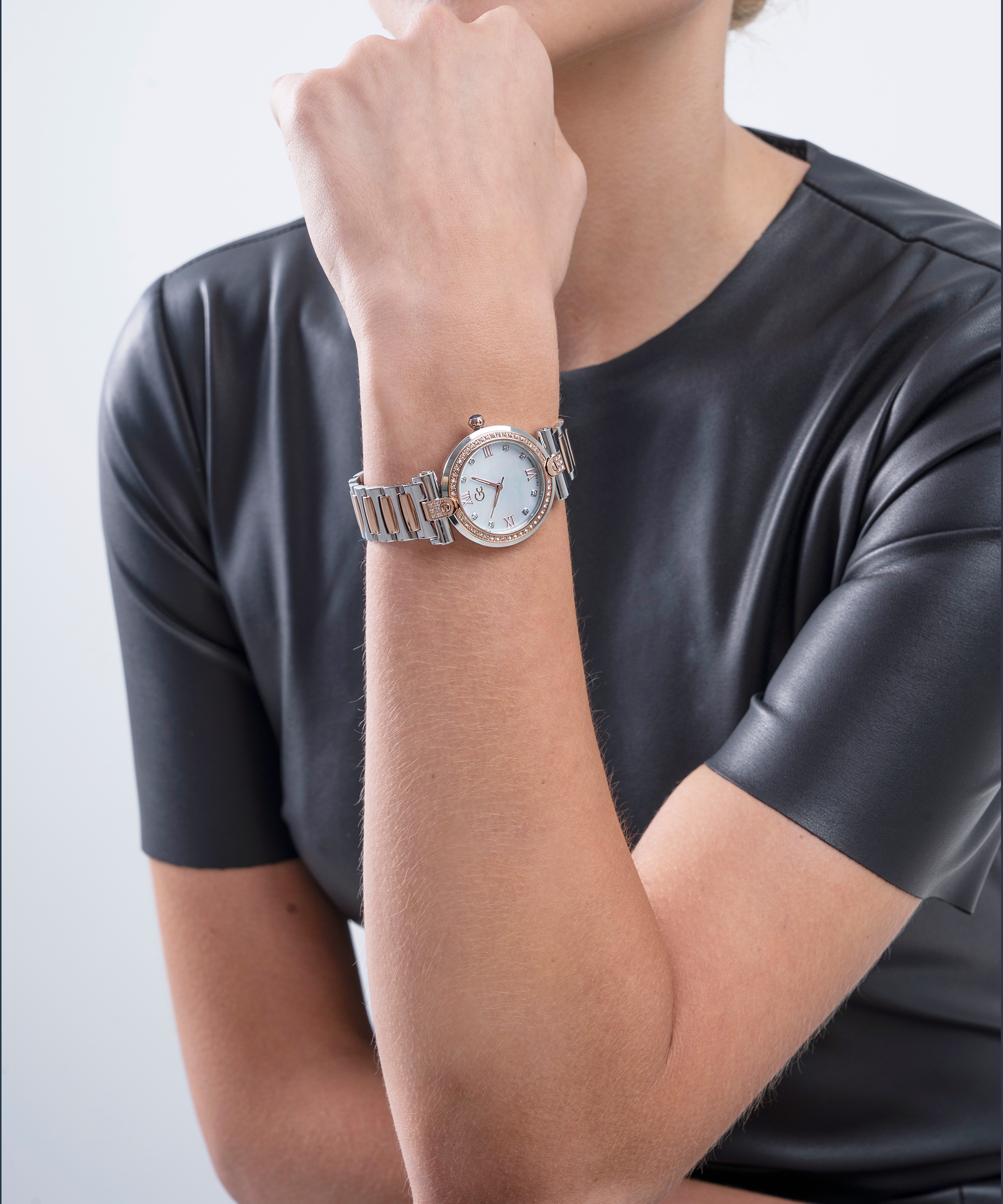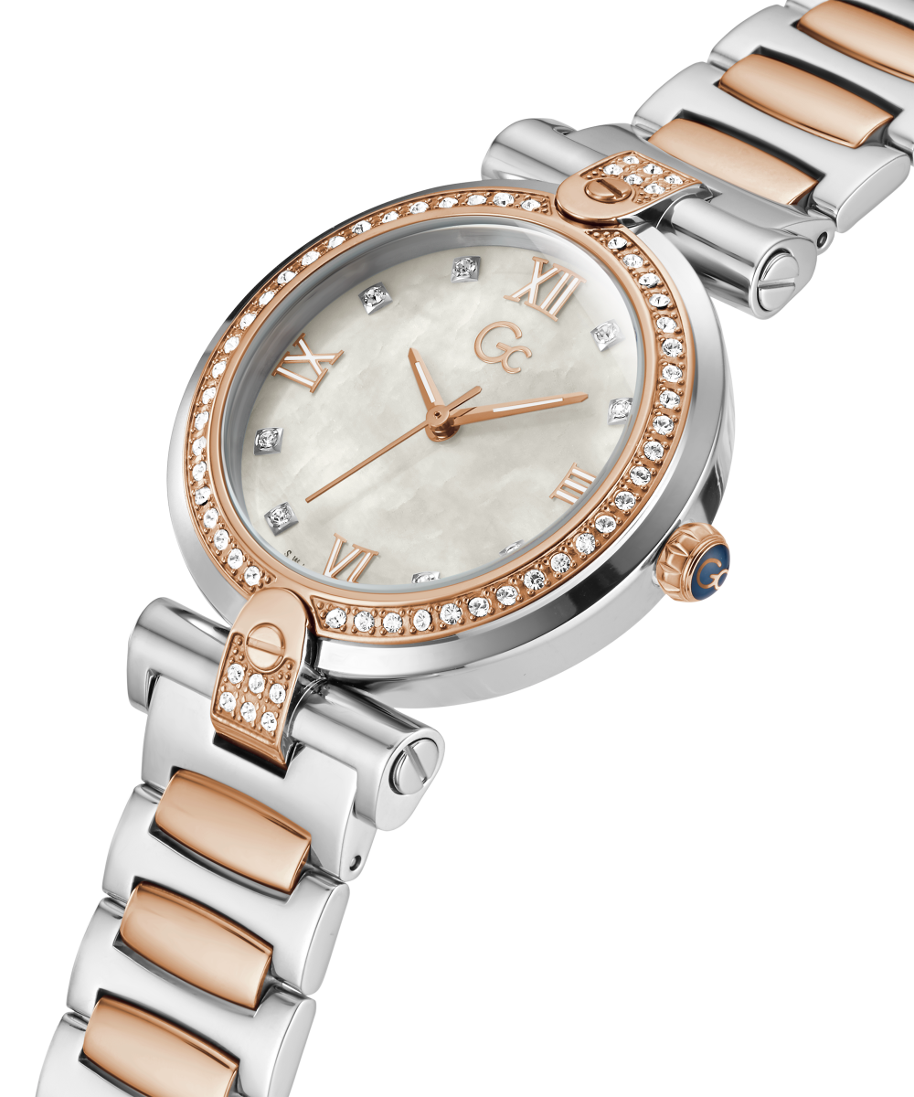 Don’t resist the charm of the Gc FUSION The slim 34mm case for the large version makes the Gc FUSION and its new Iconic T-bar attachment the new Gc watches effigy.The bezel is encircled with a ring of crystals. The white elegant mother of pearl dial is set with crystals...