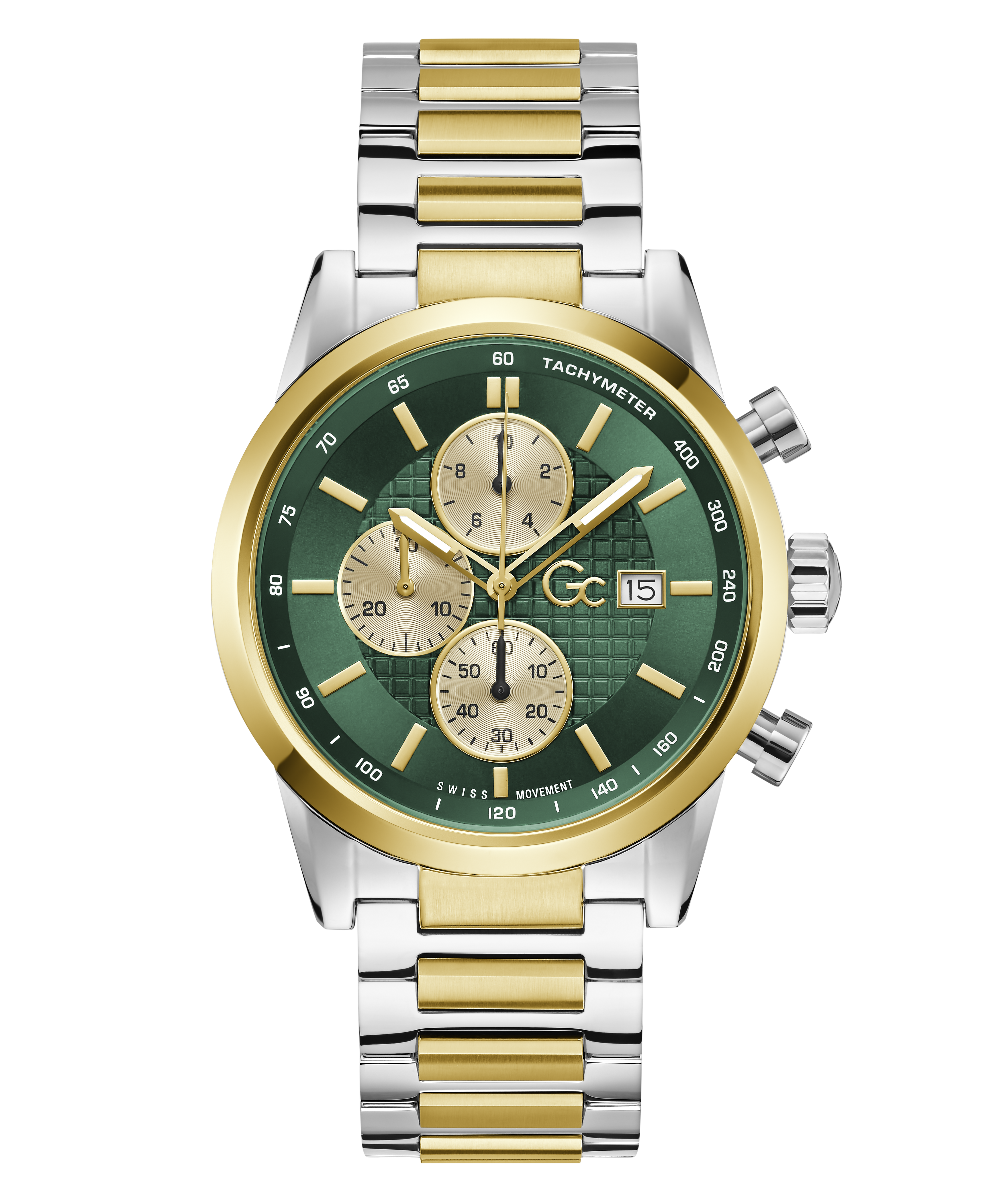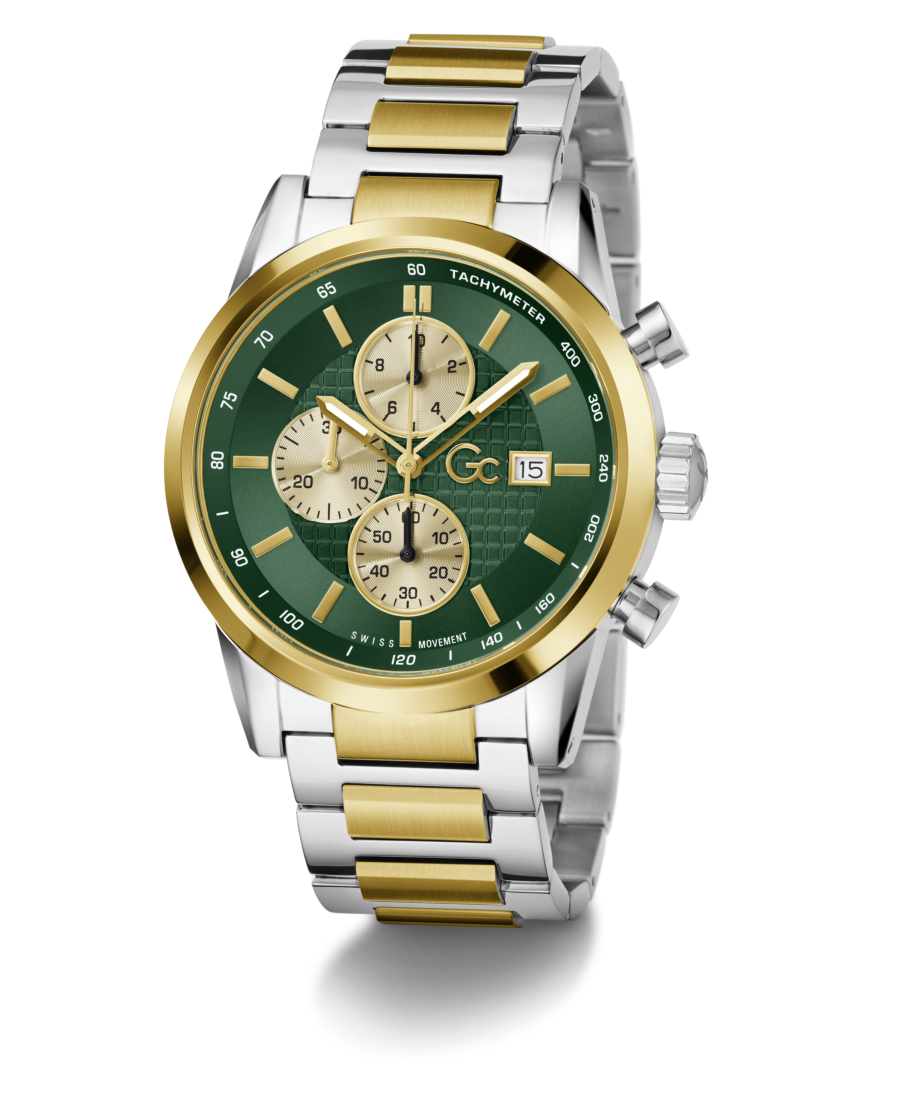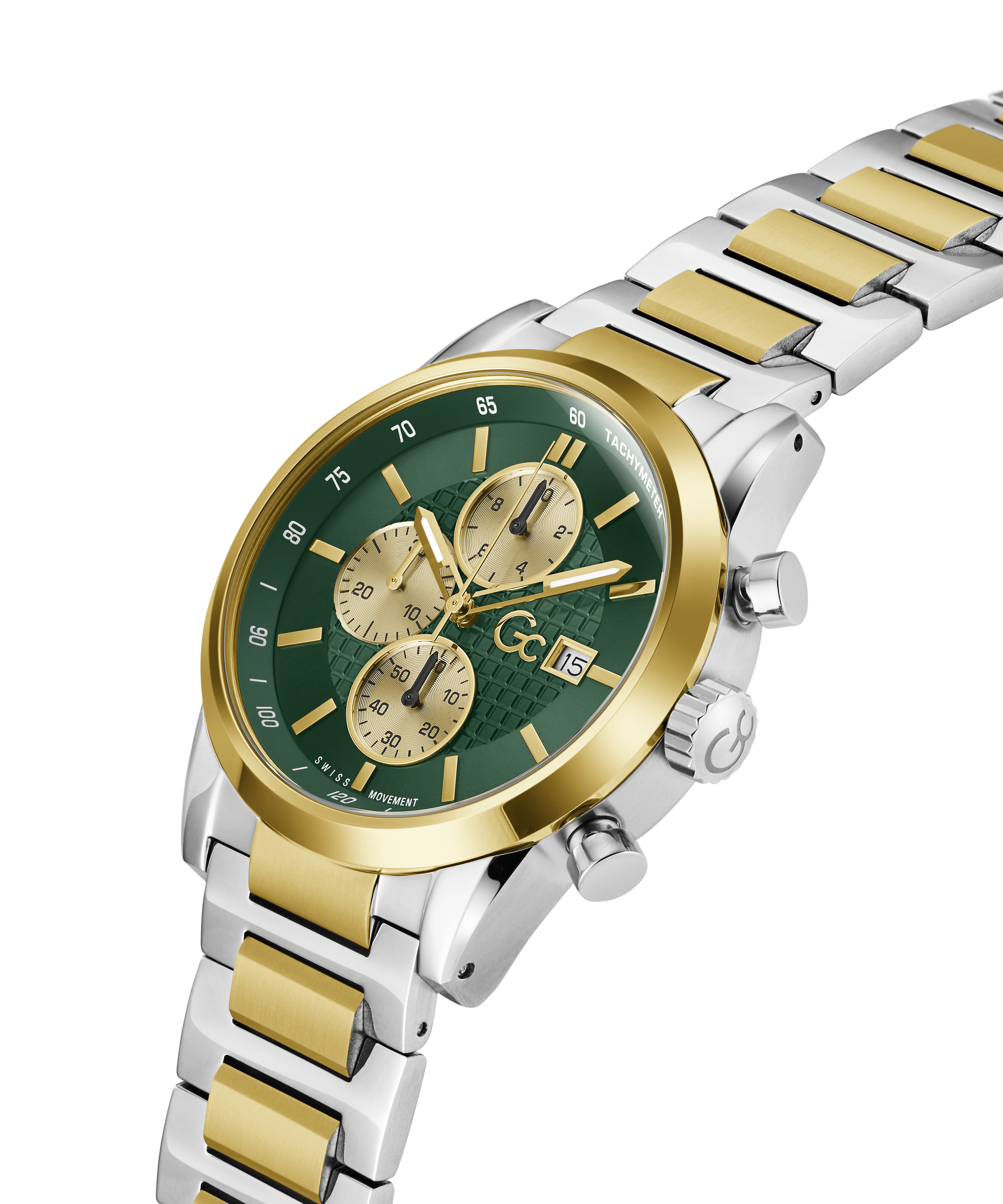 The expression of exceptional craftsmanship, the sophisticated Gc Gallant chronograph, with its 42mm silver and yellow gold tone case, showcases a striking emerald green dial featuring bold contrasted champagne counters. The elevated bracelet construction delivers both comfort and elegance, creating a timeless dressy chronograph that transitions effortlessly from boardroom to...