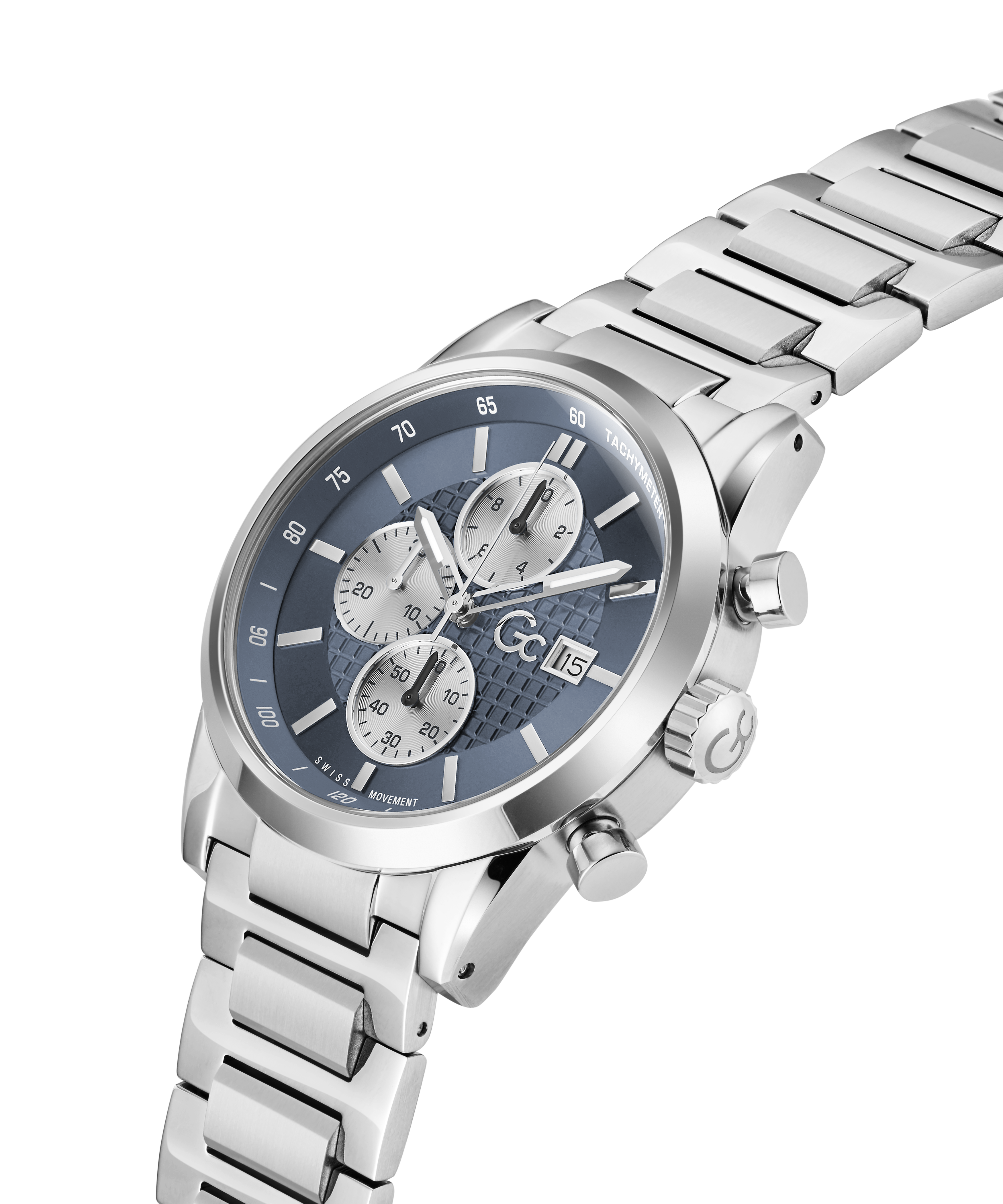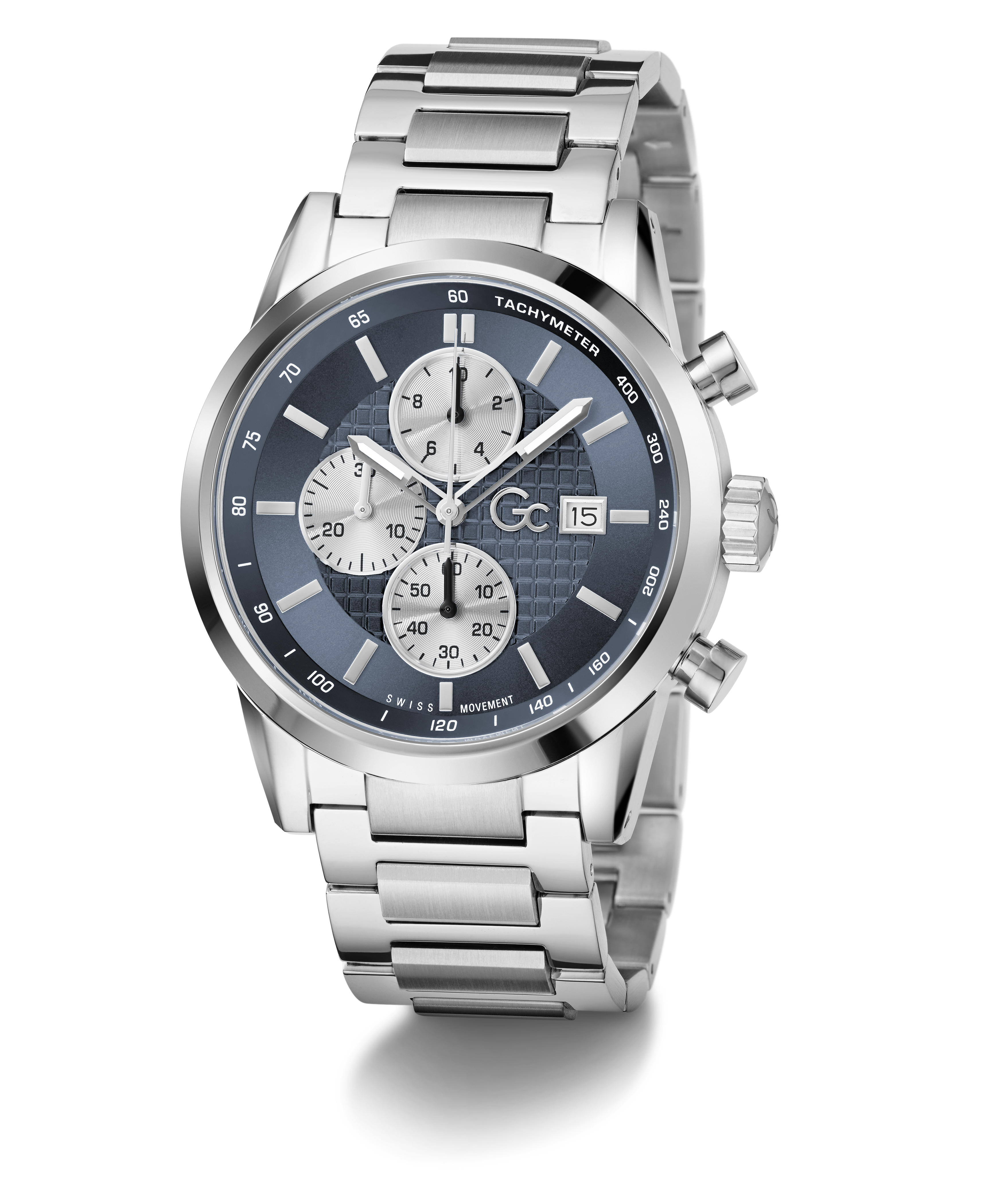 The expression of exceptional craftsmanship, the sophisticated Gc Gallant chronograph, with its 42mm silver tone case, showcases a striking stone blue dial featuring bold silver contrasted counters. The elevated bracelet construction delivers both comfort and elegance, creating a timeless dressy chronograph that transitions effortlessly from boardroom to evening events. Perfect...