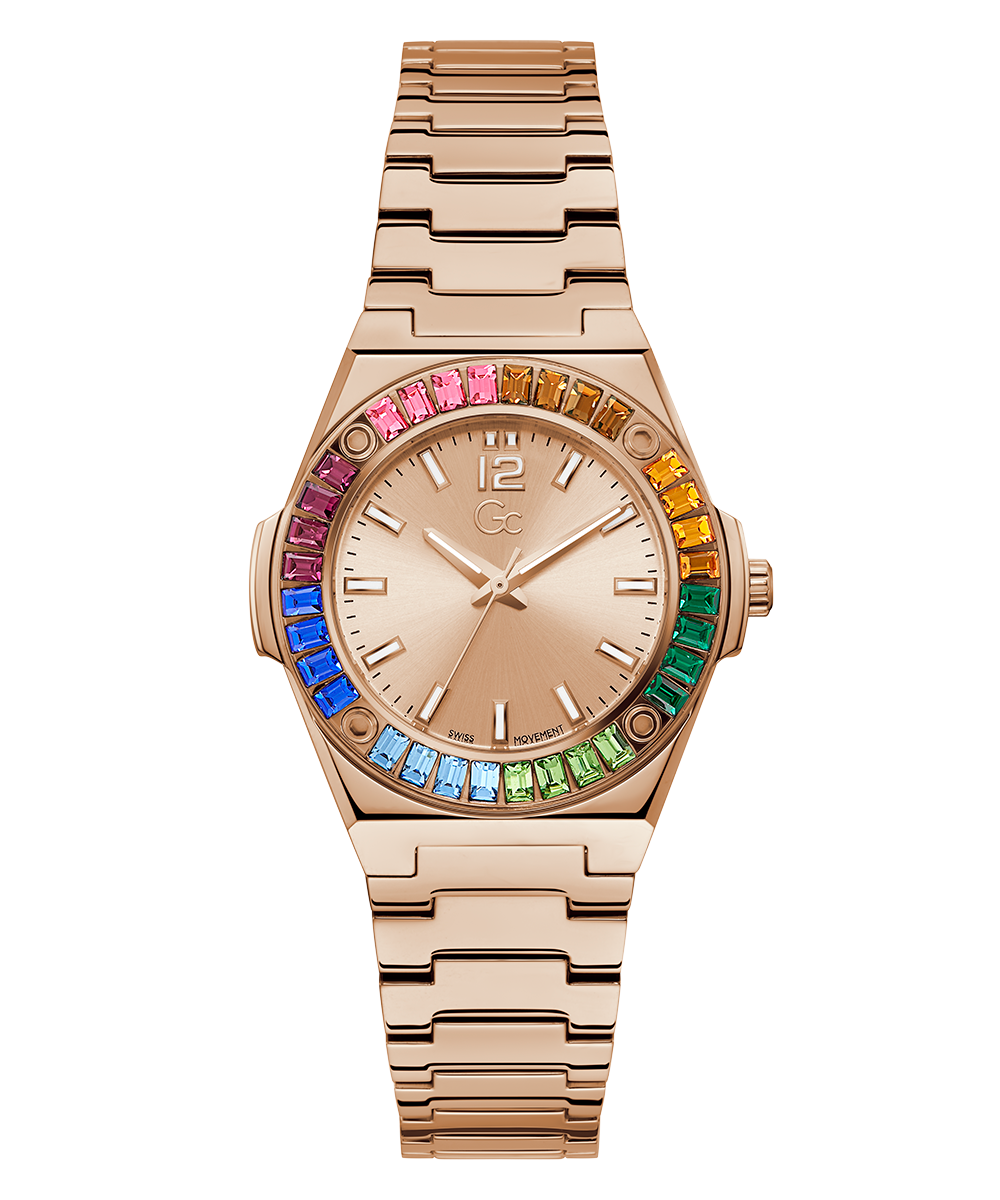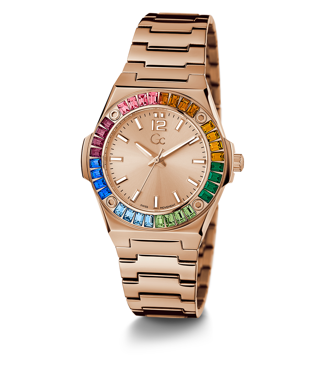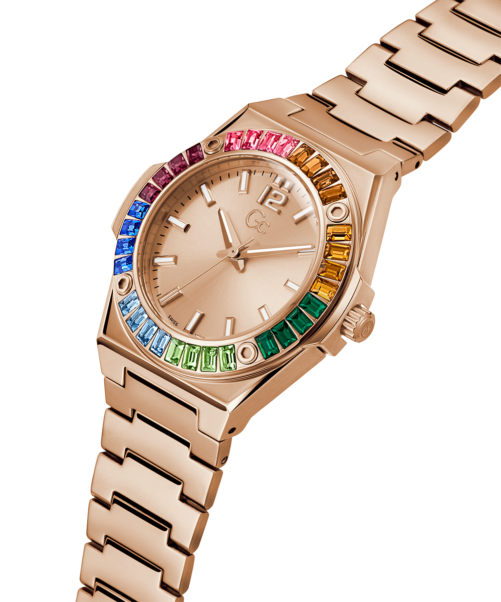 The Gc Idol hosts an integrated 34mm case with impressive baguette crystals, signature screws on the top ring and smooth bracelet in rose gold PVD, with highly stylish rainbow crystals and a soft rose-gold sunray dial.